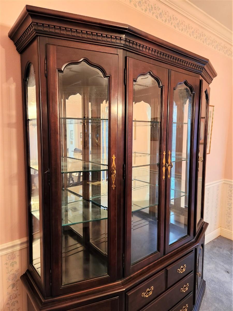 This one is a real beauty - Thomasville - mahogany finish - lighted, beveled glass. 3 drawers, 2 side sections, lots of storage. 3 adjustable tempered glass shelves - breaks down into 2 pieces for easy moving. 65" across, 21" deep, 91" tall - great condition.