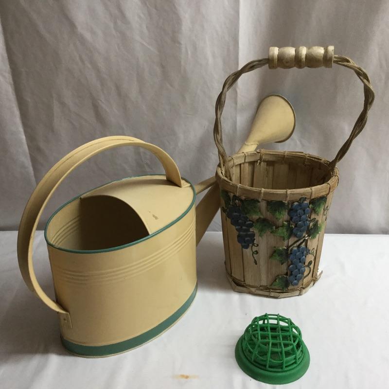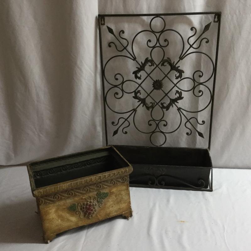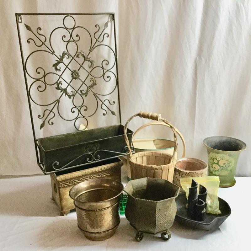 A generous Garden Lot with plenty to get your Garden Summer ready! Includes Seven Planters, both pottery and metal. A watering can, decorative marbles, a cute basket with grape motif please see photos for details. The metal wall basket measures 17” x 25” with a removable planter box measuring 16.5” x 5.5” x 4”. Local Pickup only.
