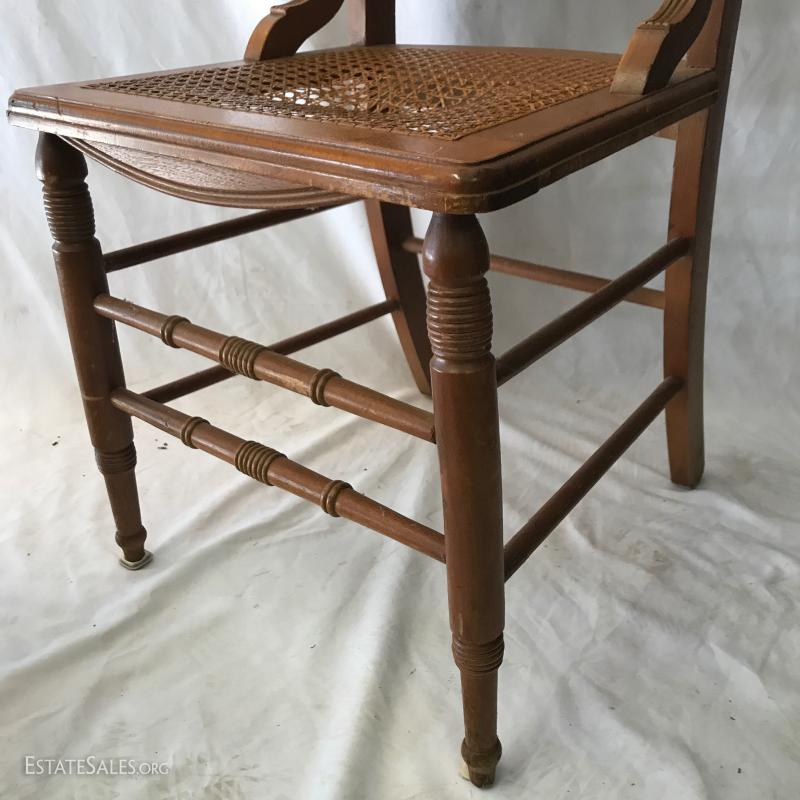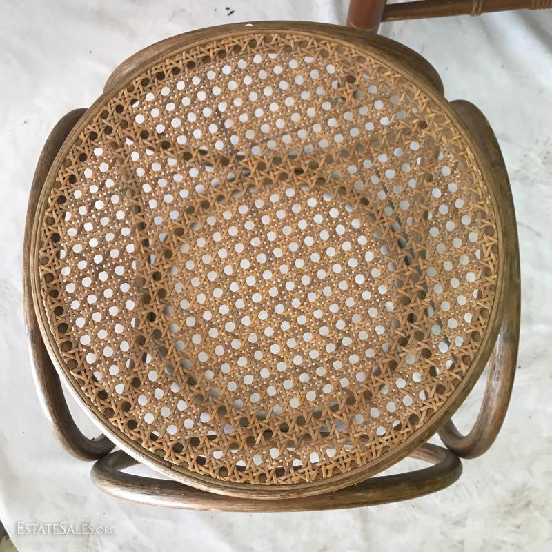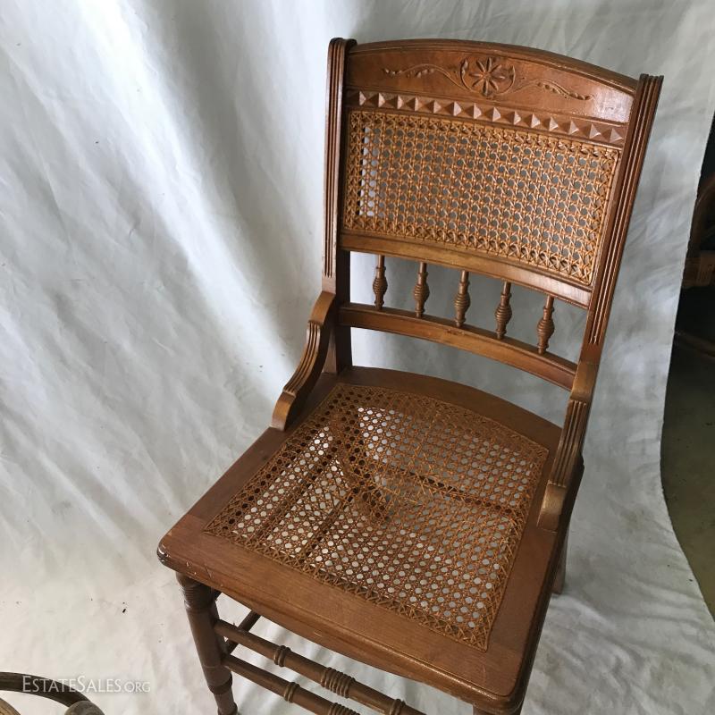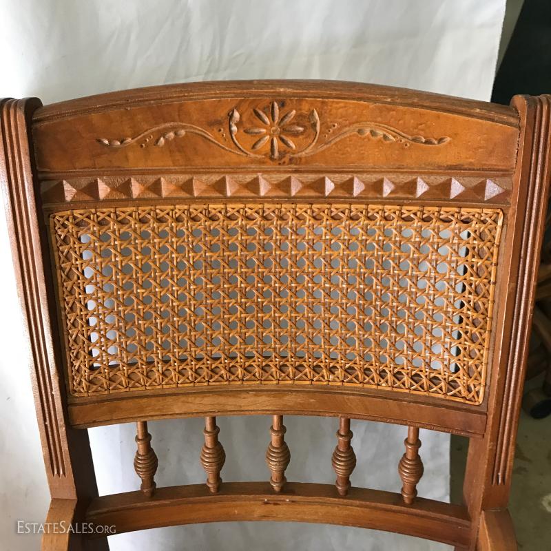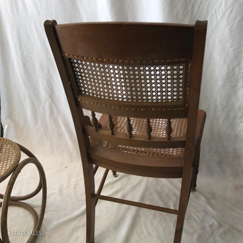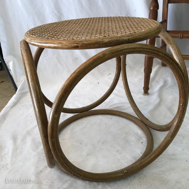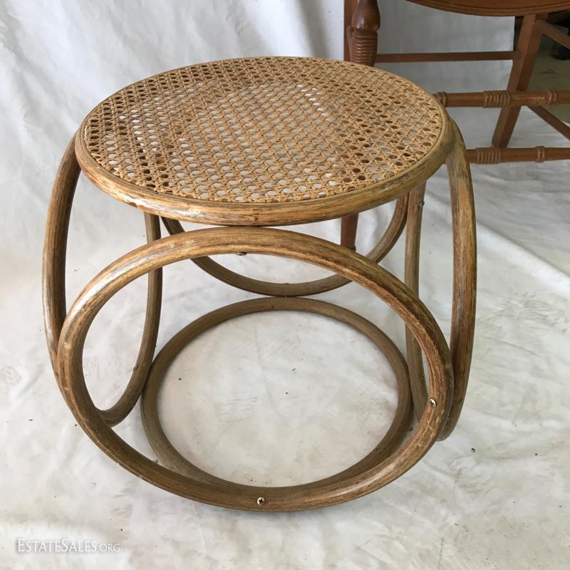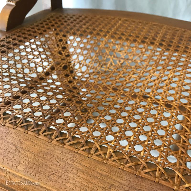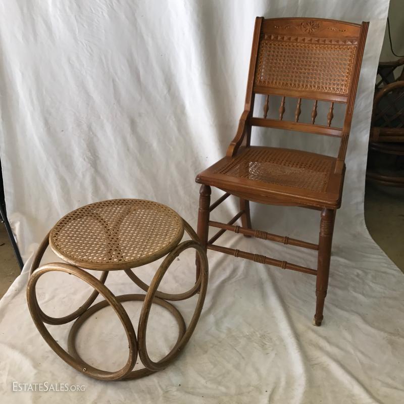 Cane chair with carved wood design on top. Seat cane is dented and starting to break. See photo. Comes with red detachable seat cushion, not pictured. Chair measures 17"l x 17"w x 35"h. Stool is square made of cane with bamboo. Cute functional piece, measures 16"l x 16"w x 16"h. No shipping. Local pick up only in Waynesville, NC