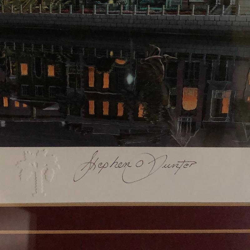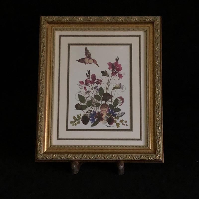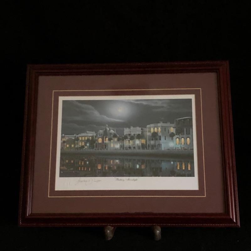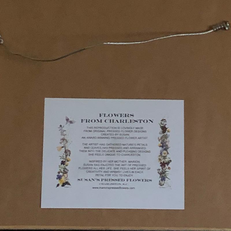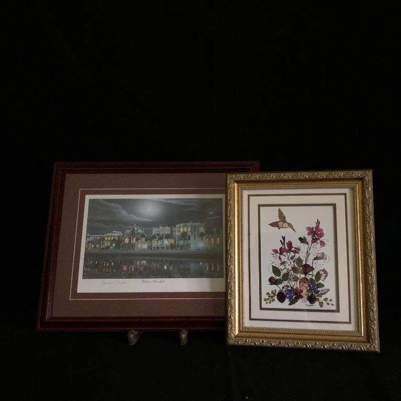 Two beautiful framed pieces of Charleston art. Print by Stephen O Hunter titled "Battery Moonlight" is matted and framed and the floral piece is actual pressed flowers by Susan's Pressed Flowers.