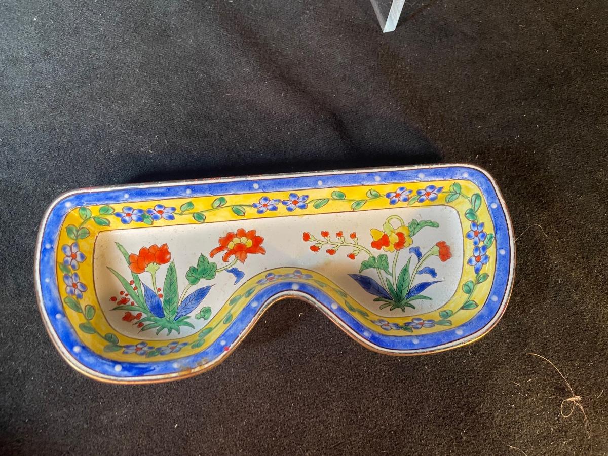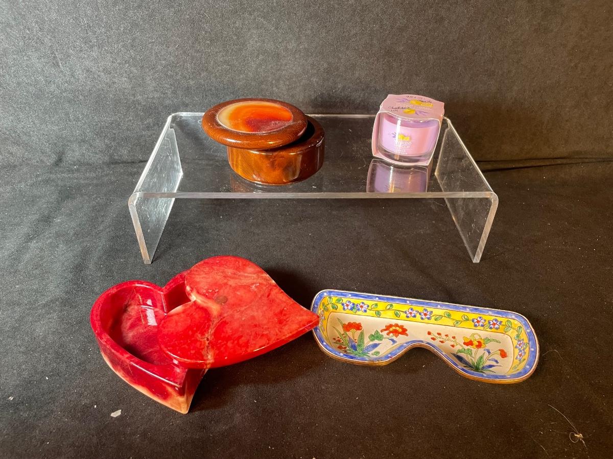 red marble covered box, round, wooden trinket box, tiny yankee candle and enameled metal glasses tray