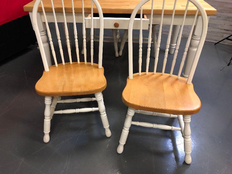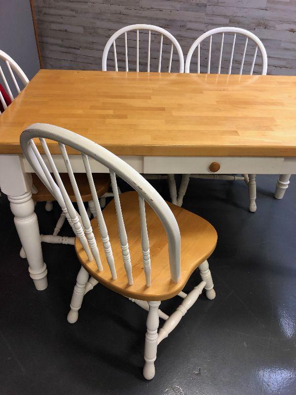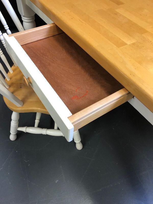 Good Condition, light wear from use, drawer in table, chairs are solid!