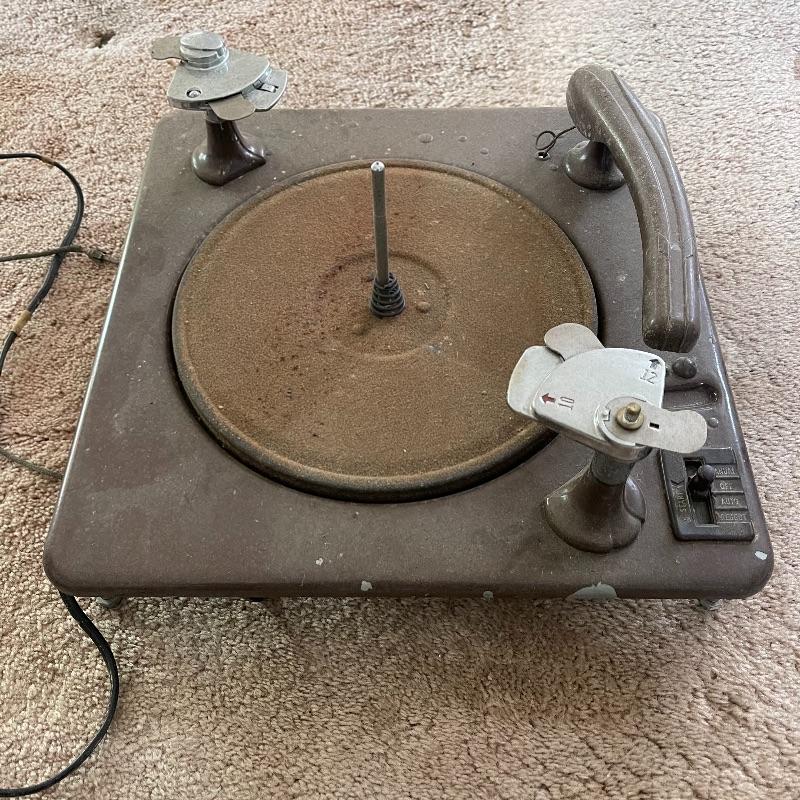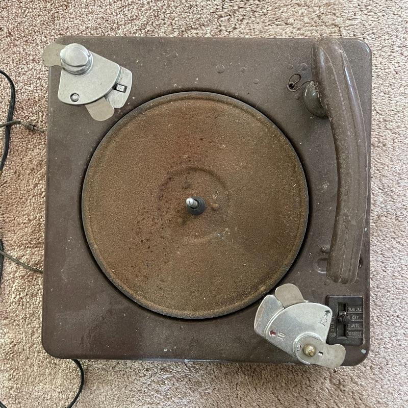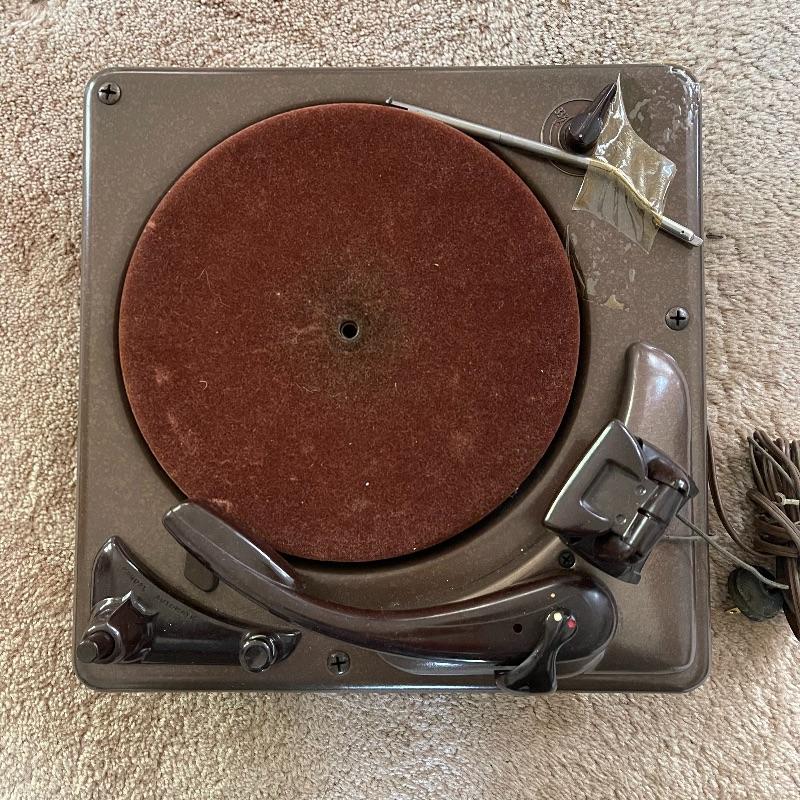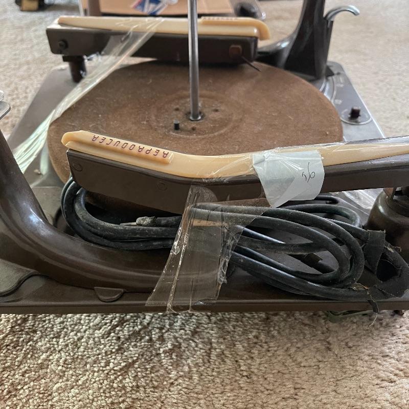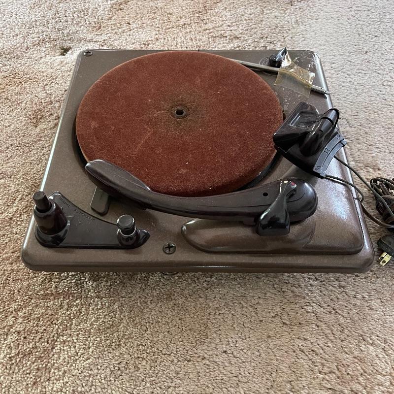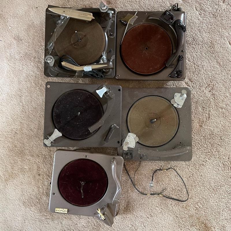 Five turntables of various brands, models, and styles. One is a Vintage Reproducer- Recorder turntable. One is marked Webster Chicago. No items were test as they don’t have plugs.