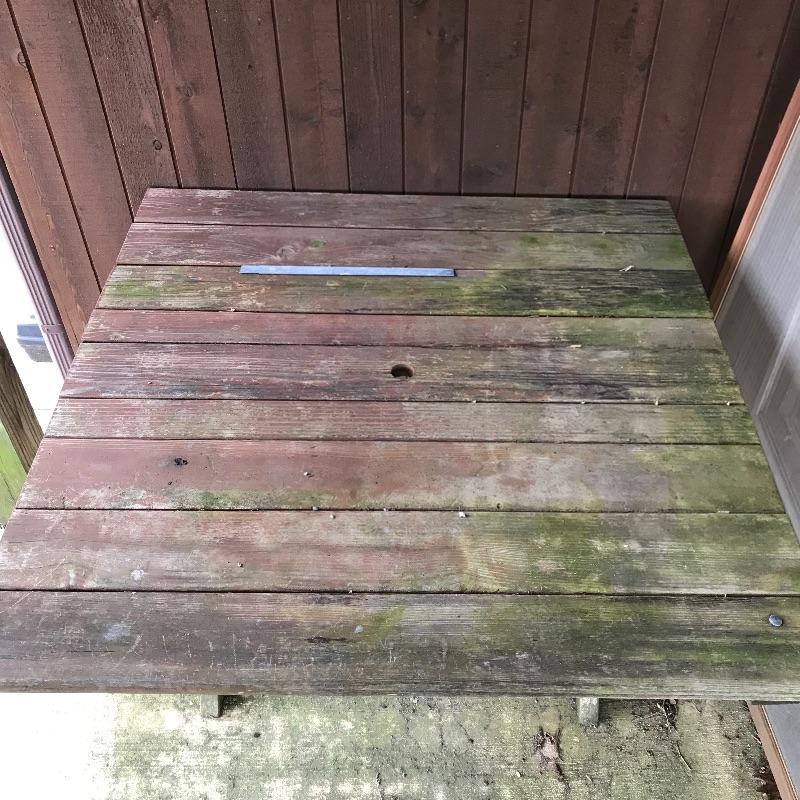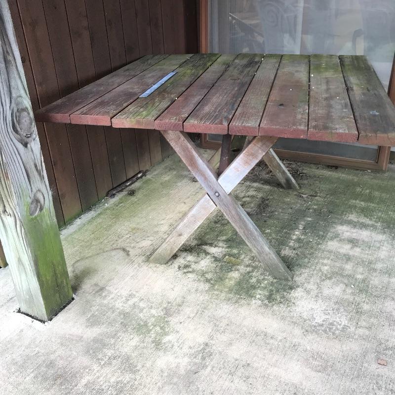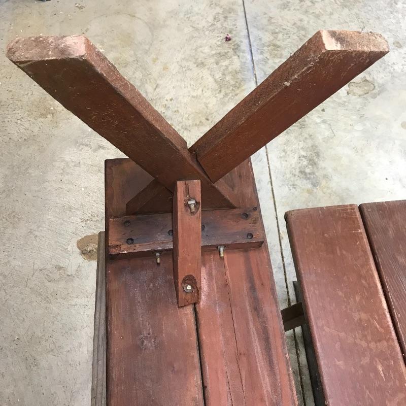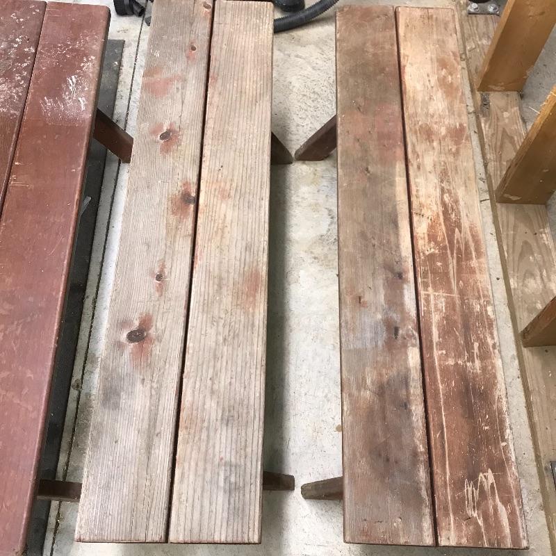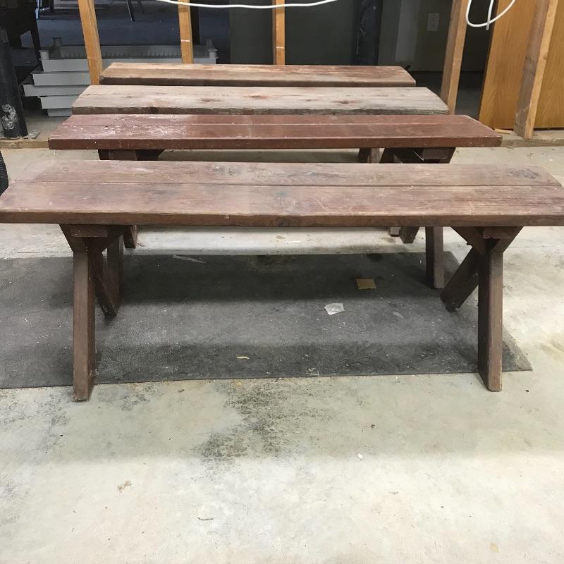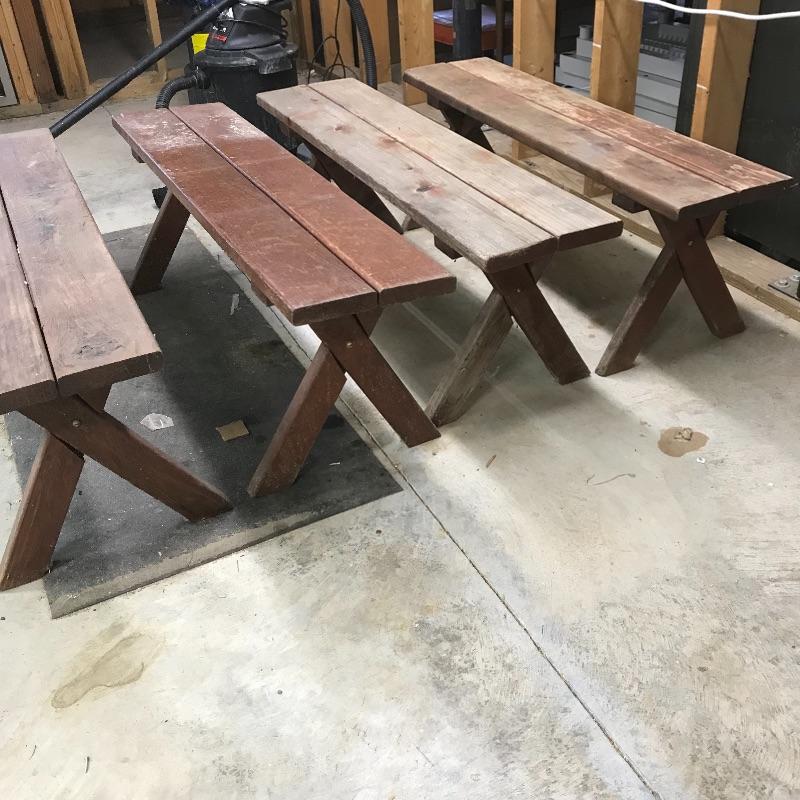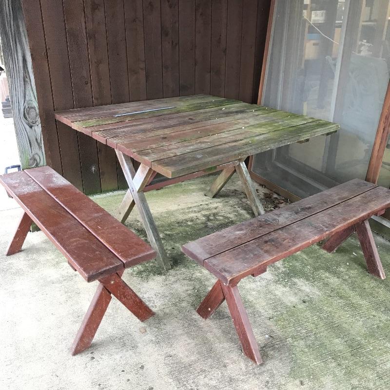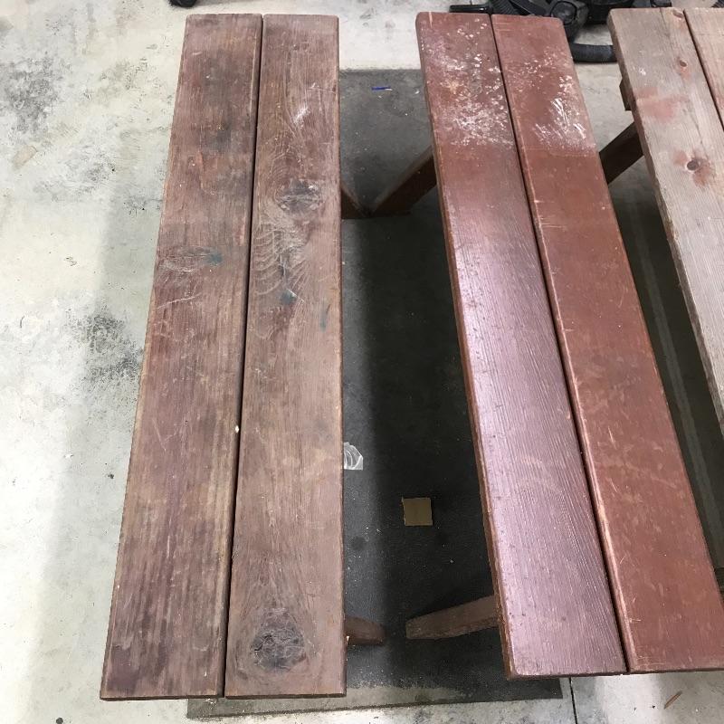 A unique square wooden picnic table perfect for a corner or smaller space. Table measures 46.5” x 47” and is in need of restoration. Wood shows weathering and most slats need to be stabilized. Table is accompanied by a set of four brick colored picnic benches for your sitting pleasure! The two darker ones are very sturdy while the two with a more naked finish are a little wobbly and need stabilization. Benches fit perfectly with the table, measuring approximately 46.5” x 11.25” x 17.75”h. No shipping.