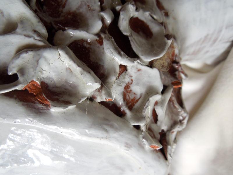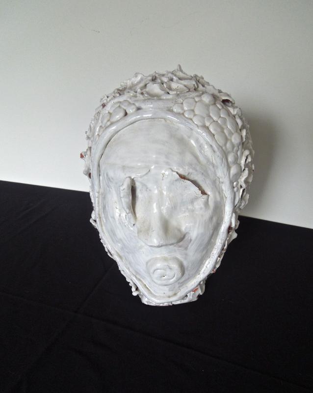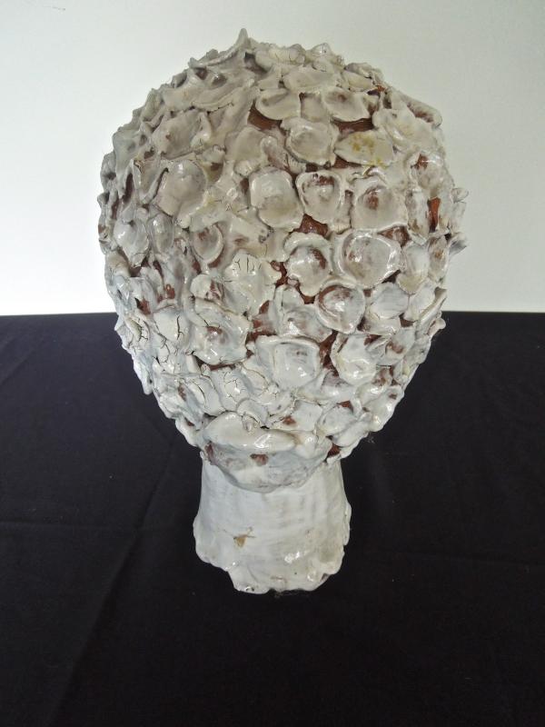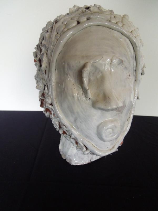Handbuilt bust of woman with plug in her mouth and wearing a cap. the cap is texturized like a retro bathing cap. The medium is terra cotta clay and thick white glaze. There is damage to one of her eyes as the upper lid has broken off and the clay is exposed. Also some of the petals in her cap have chipped in places. The head is approx 11 inches high and the piece is heavy.