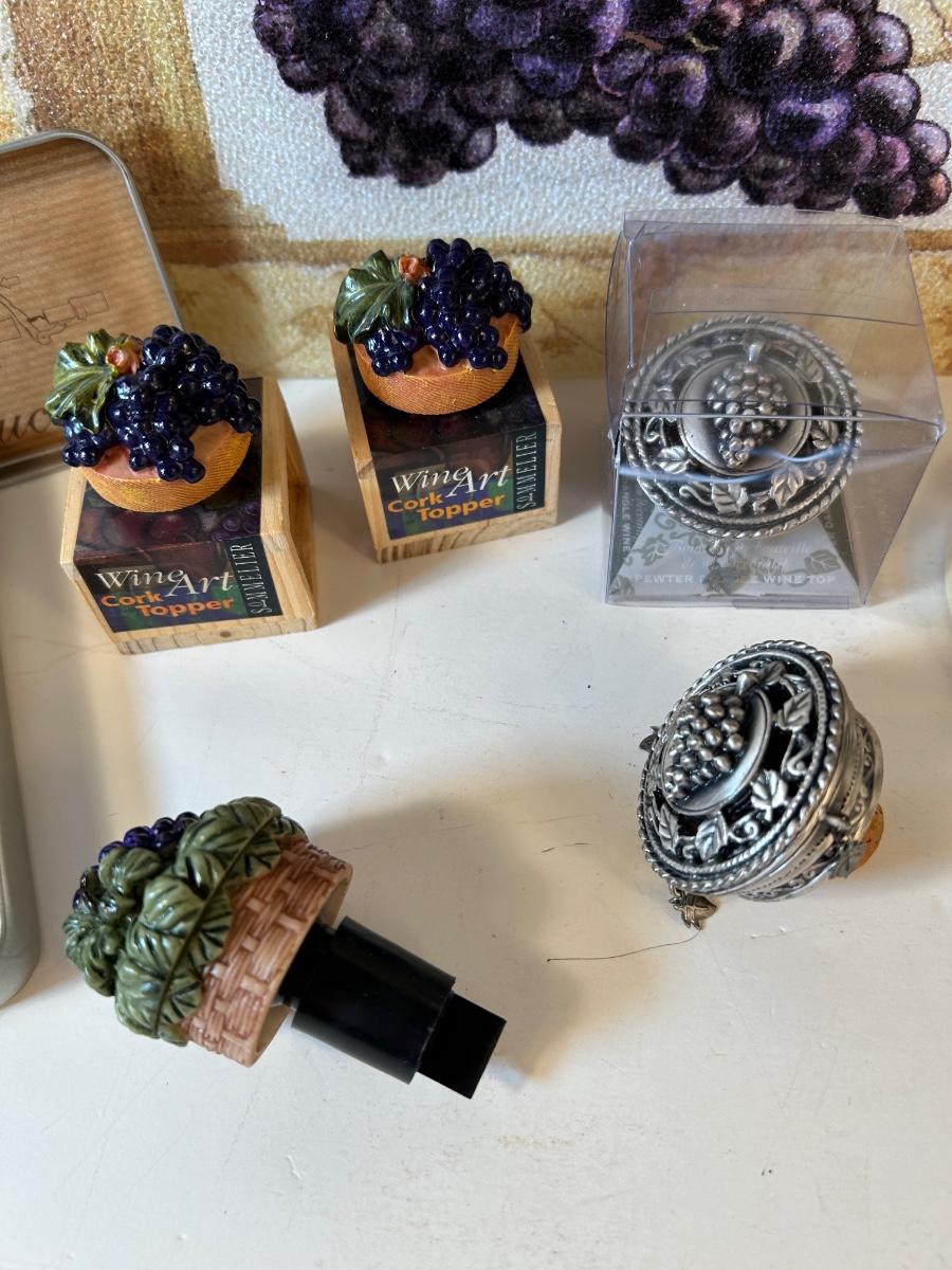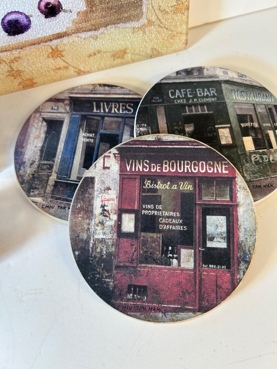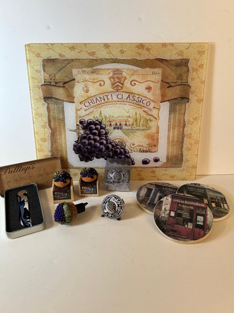 Glass cheese board, 4 cork wine toppers, 3 French scene coasters and a Pulltap's bottle opener