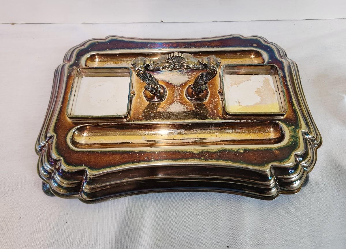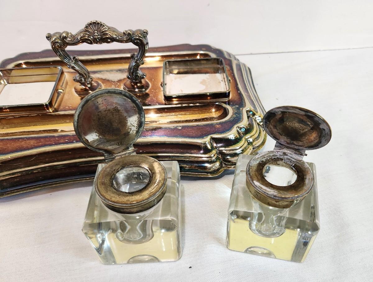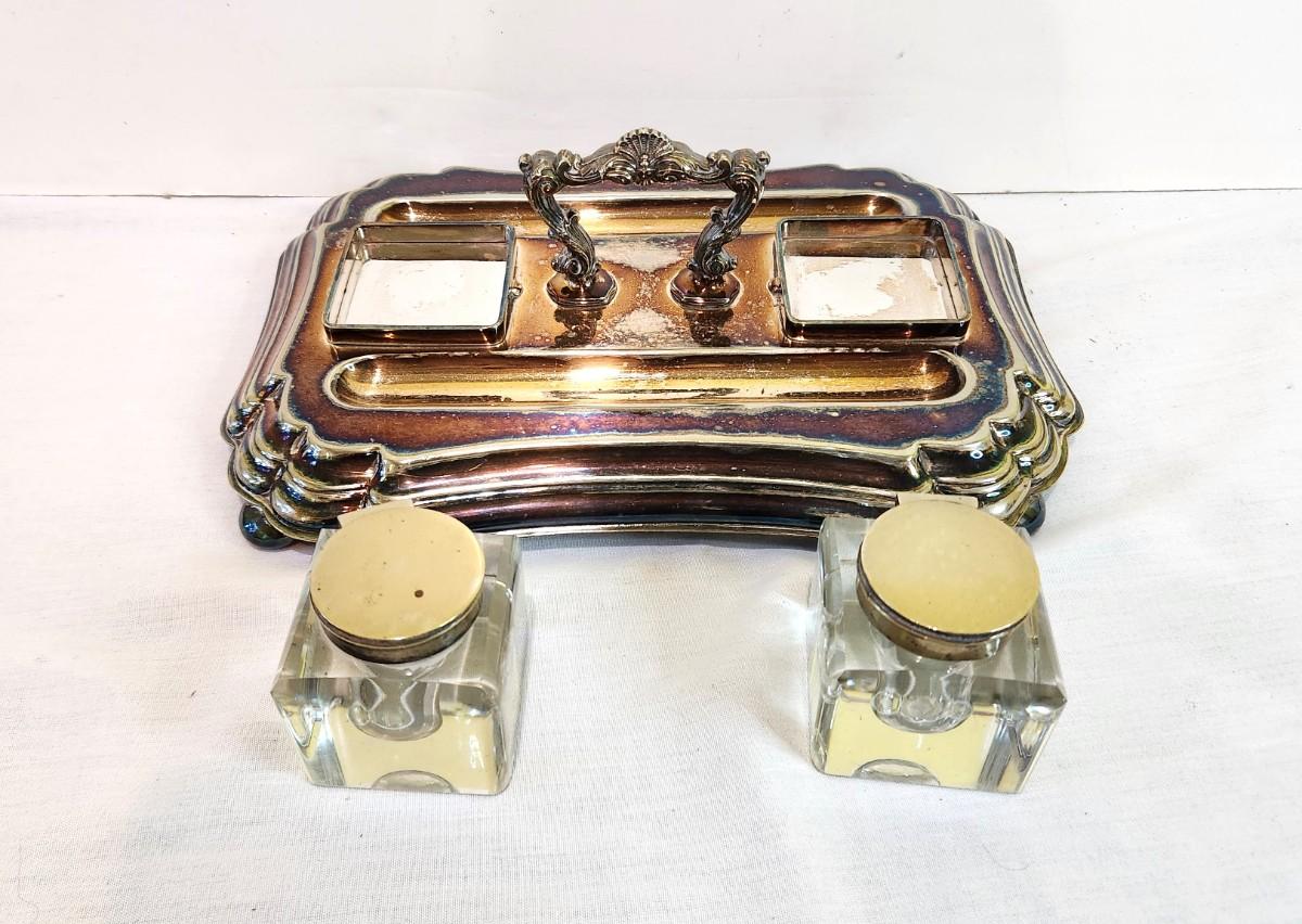 Handsome vintage Partners Double Inkwell - Silver Plate - 2 crystal inkwells - note: one lid is loose, each 2" tall. Stand is 11" x 8". Needs a polish.