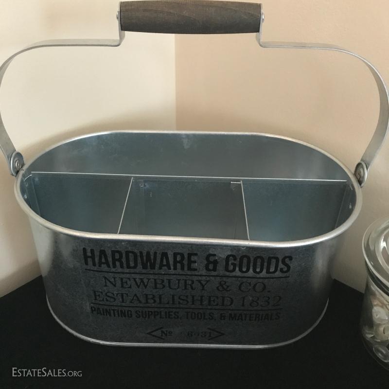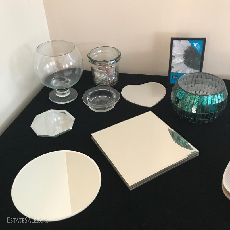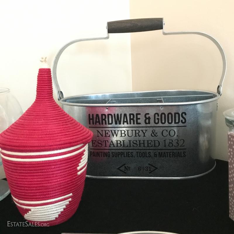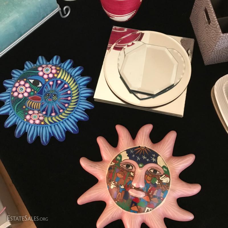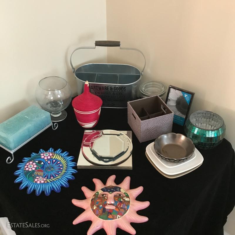 Painted terra cotta sun and moon, each approx. 10" diameter, galvanized bucket for utensils or tools (measures 13" x7.5" X11"). Candle holders, square fabric utensil holder, mirrored trivets, red and white woven container and more. This lot is available for local pick up in Mills River, NC only.