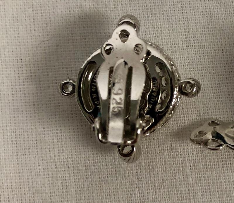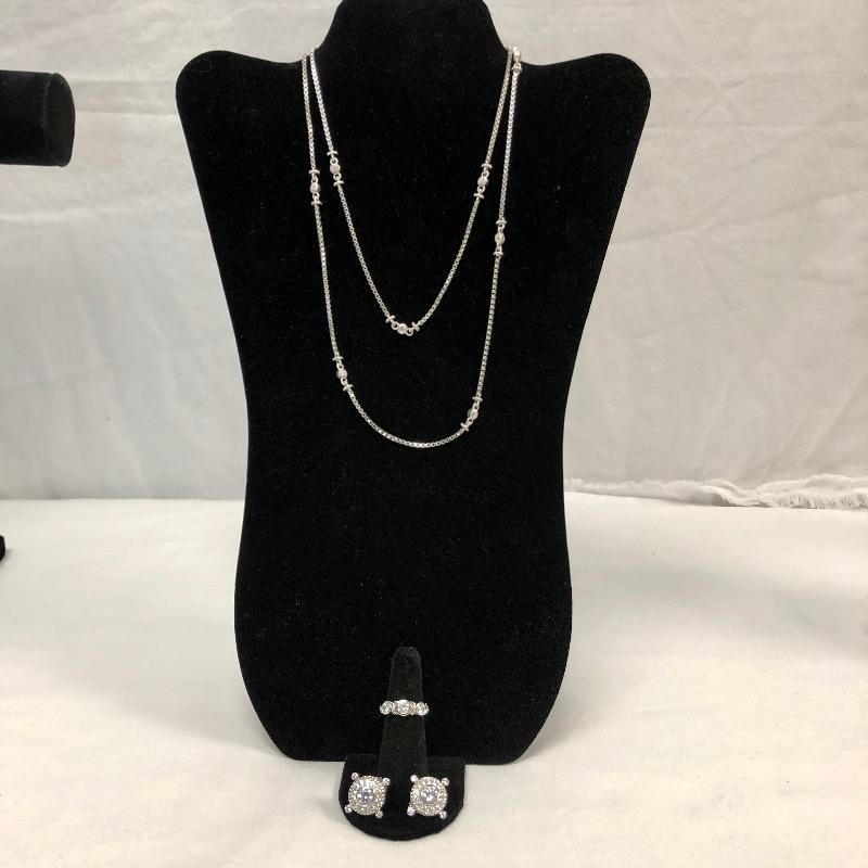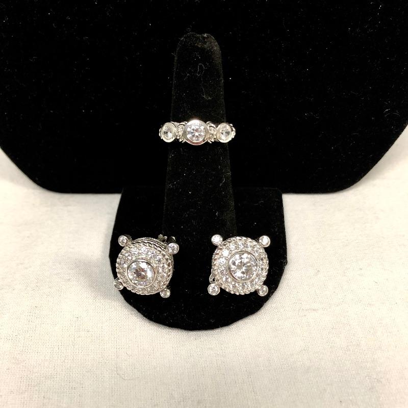 Stunning set of Judith Ripka pieces that includes a necklace, ring and pair of clip-on earrings. Ring and necklace are marked CZ and all pieces are marked 925, see images for more information.