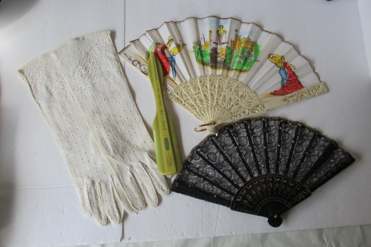 Lot 118:  Vintage Ladies Lot, Fans, Shoe Horn, Gloves