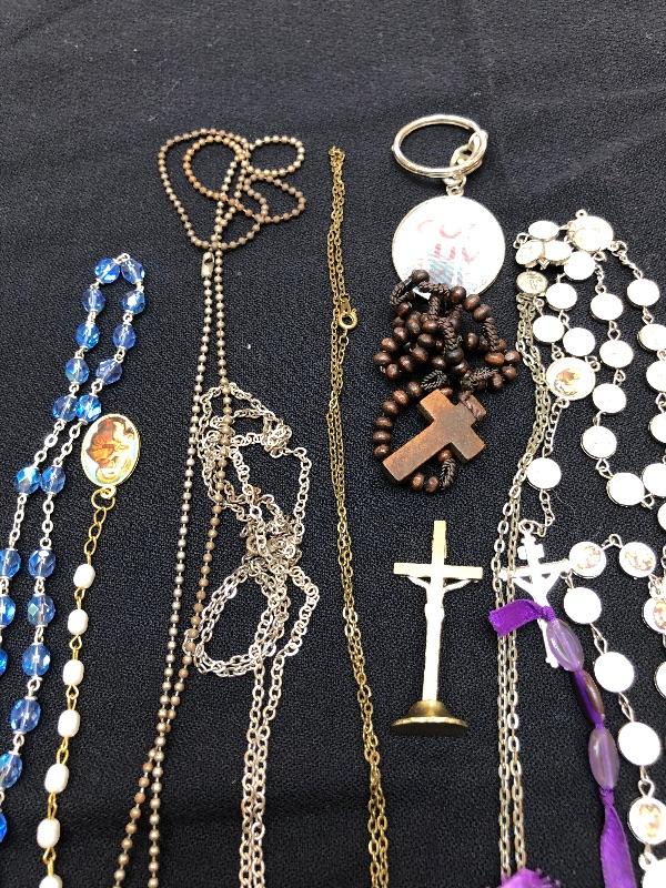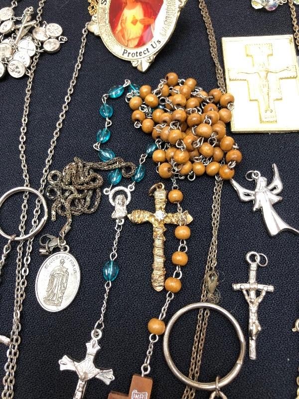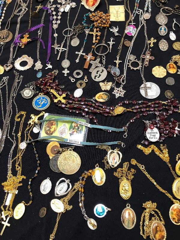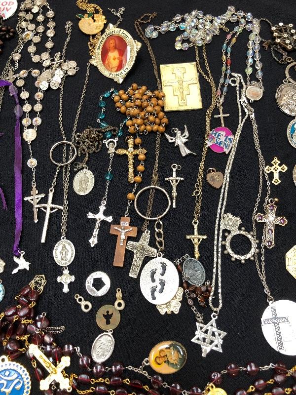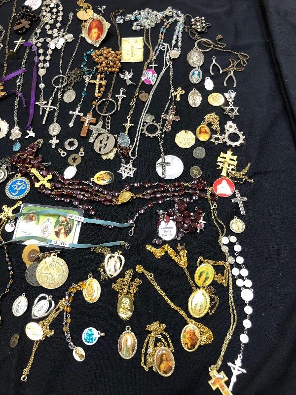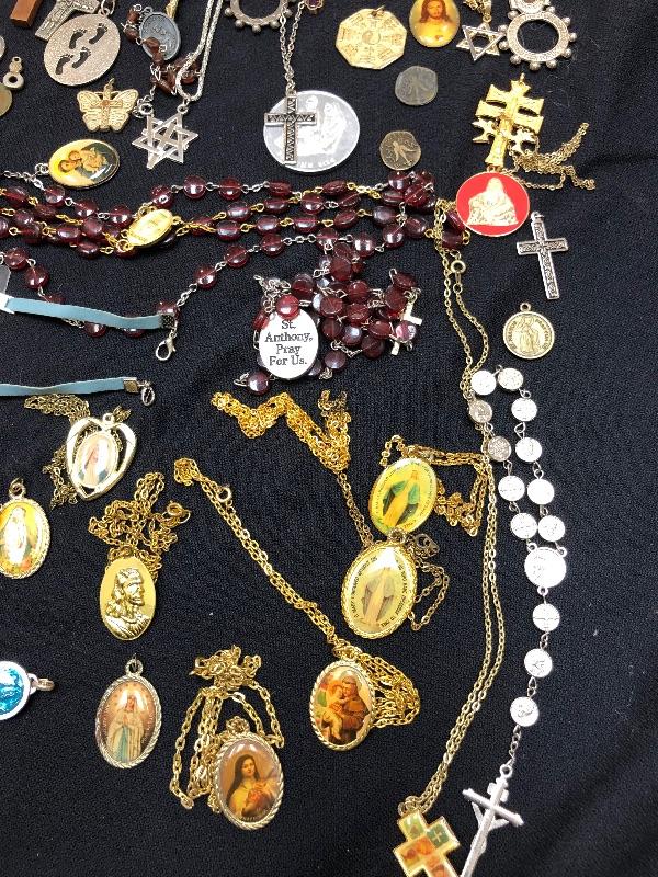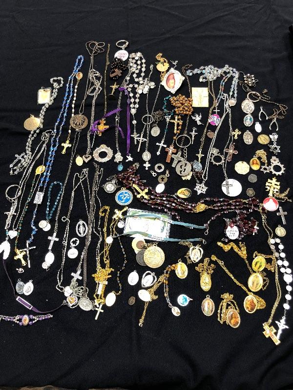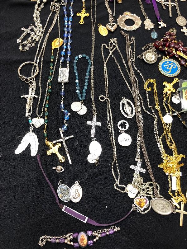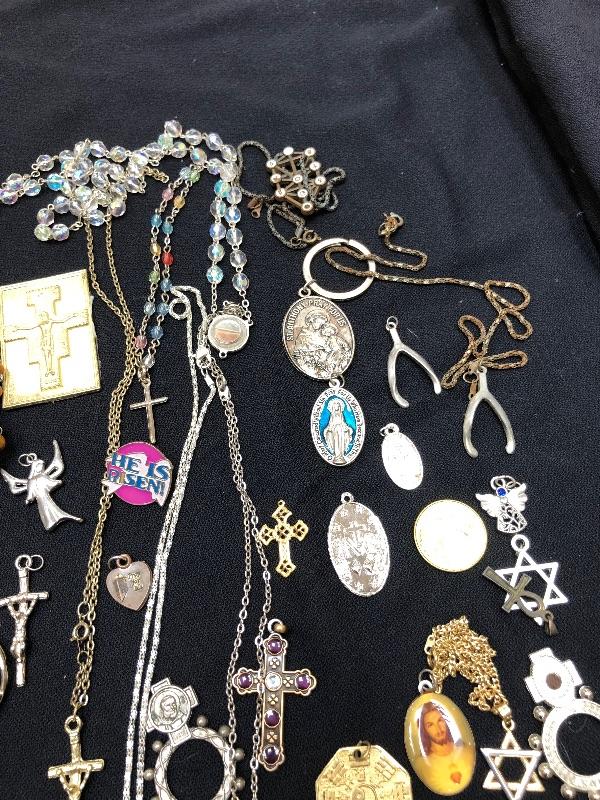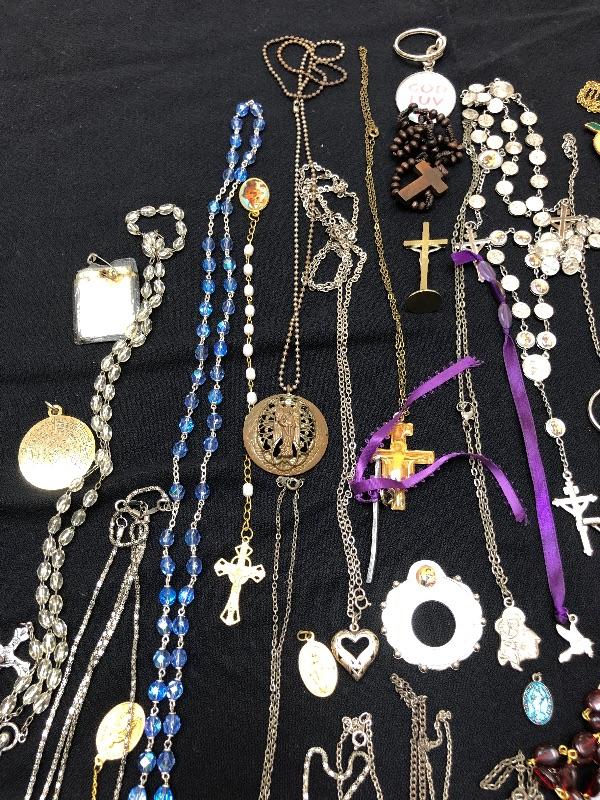 large lot of jewelry - various necklaces, pendants, keyring, bracelets and pins.