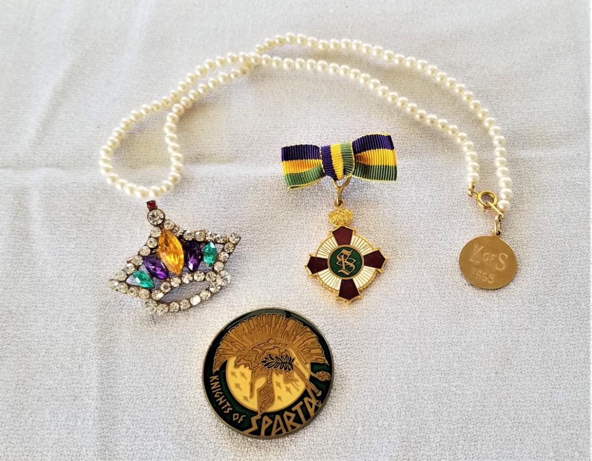 You get all you see here - Knights of Sparta Krewe Medal (2" long, made in Germany), Maid's Necklace, engraved K of S 1995, gold filled, 16" long), Heavy doubloon and vintage crown pin in Mardi Gras colors.