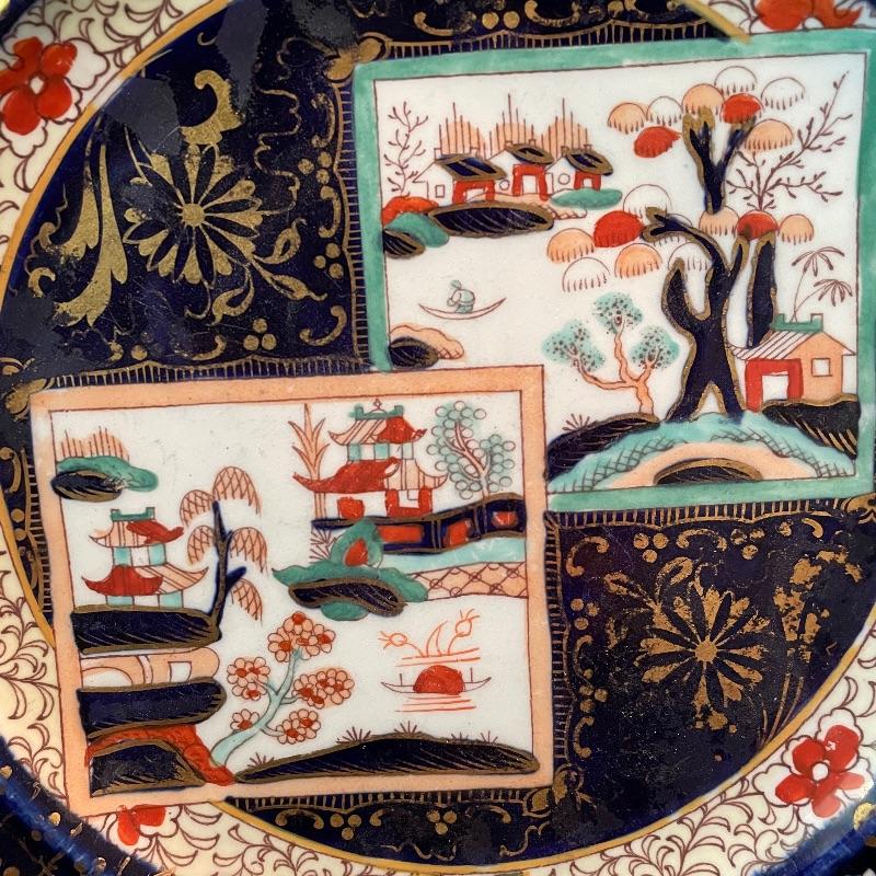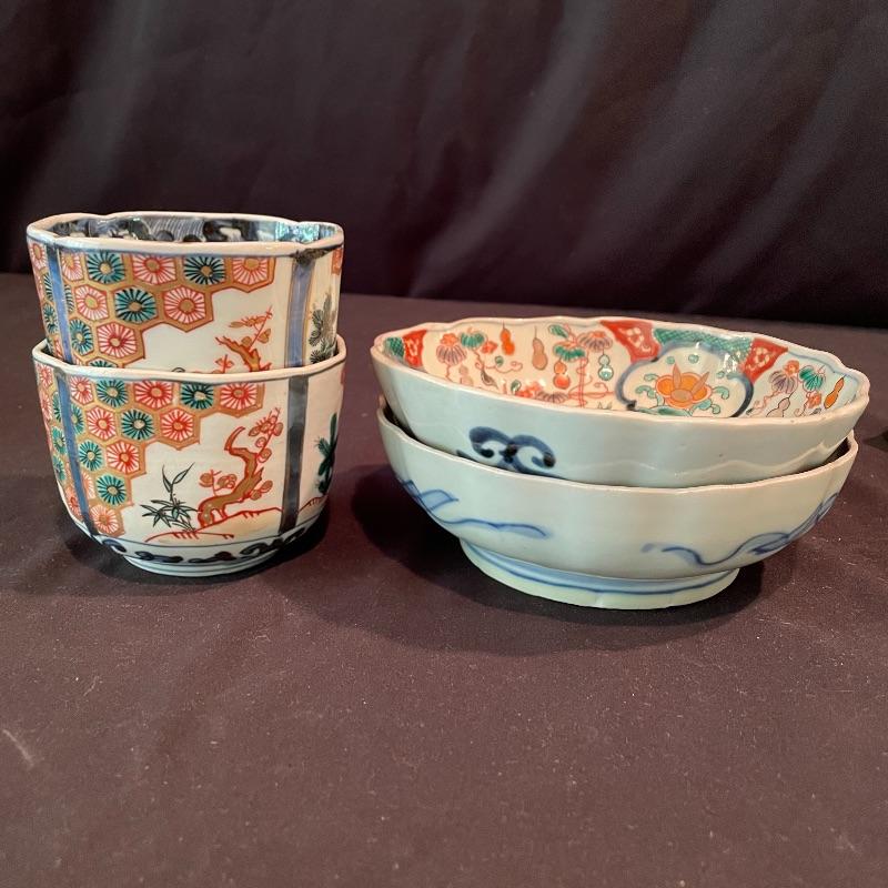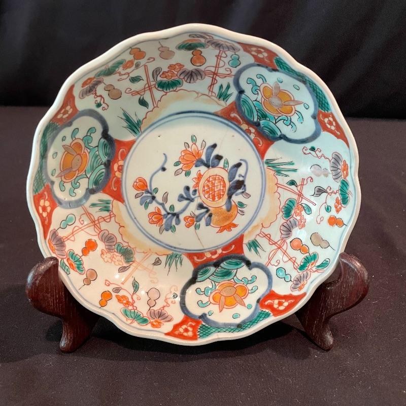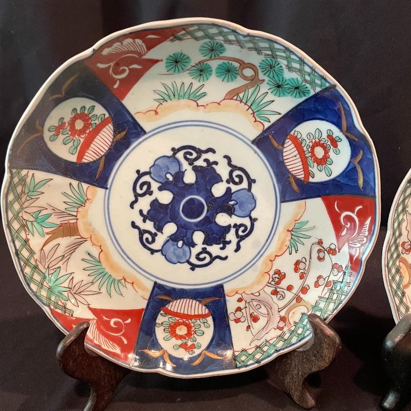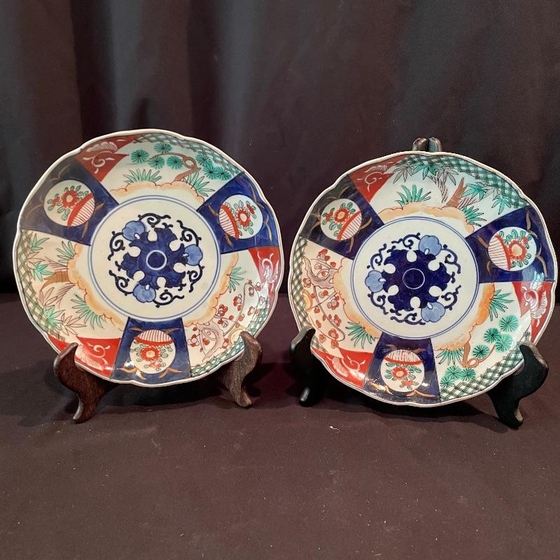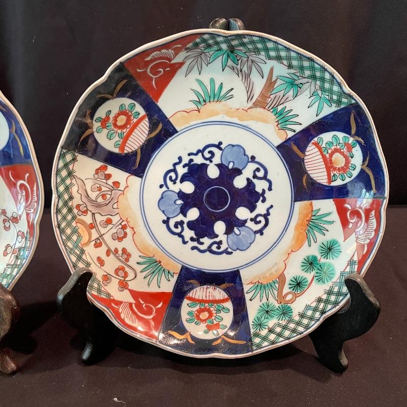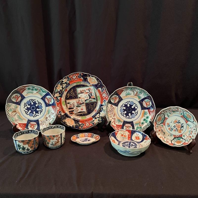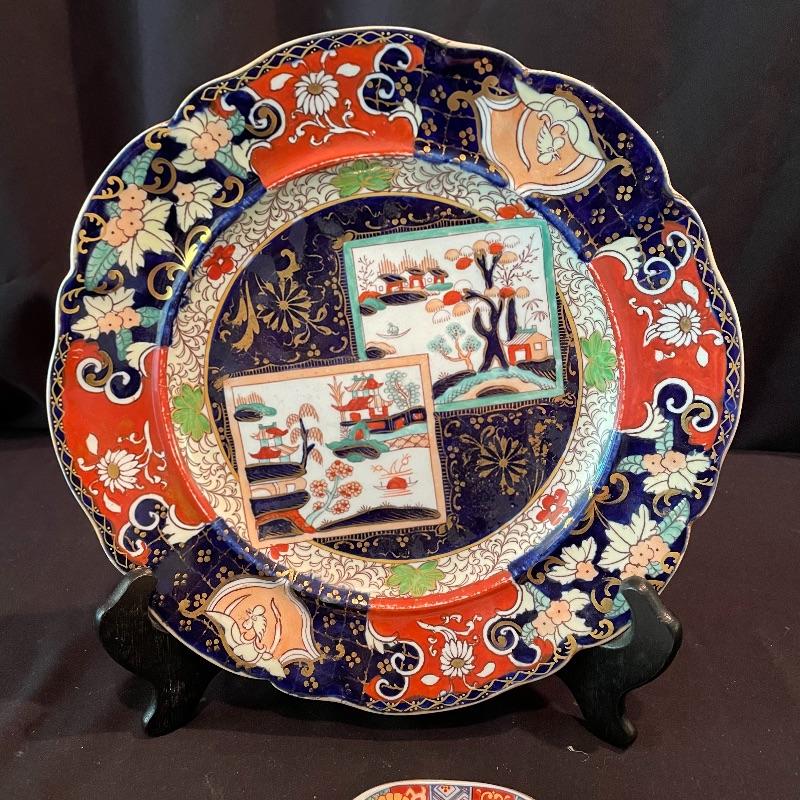 Stunning collection of Imari style plates and bowls. Lot features a Mason Ironstone 10.25” Imari style plate with 1765 on the underside of the plate. Lot offers a matching set of smaller plates, two salad bowls (one has a crack shown in images) and two soup cups. Lastly, a curio sized plate marked Imari, 1991. All wooden stands are included in lot. See images. Shipping available.