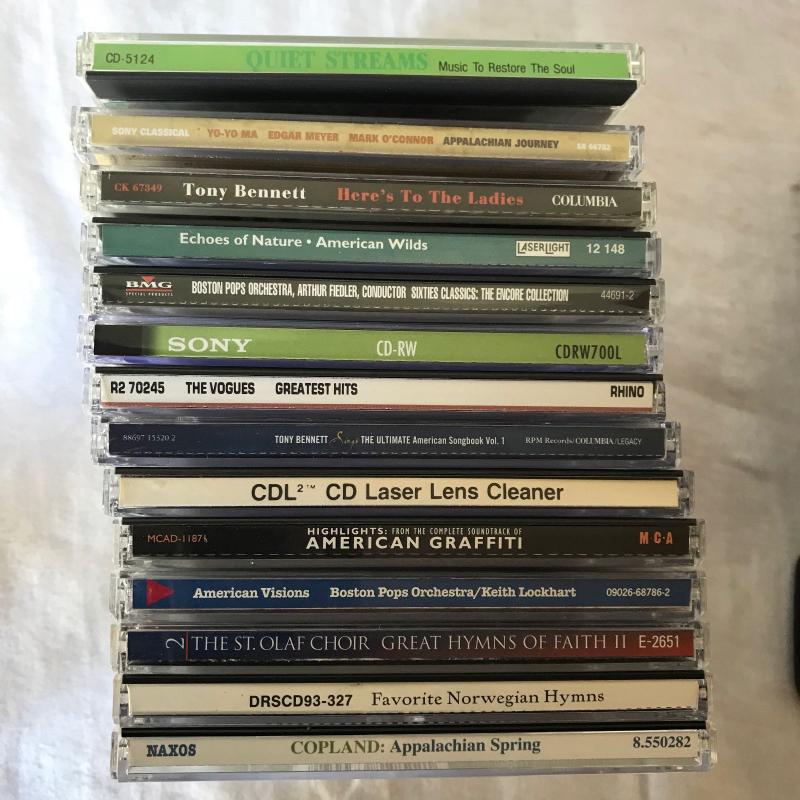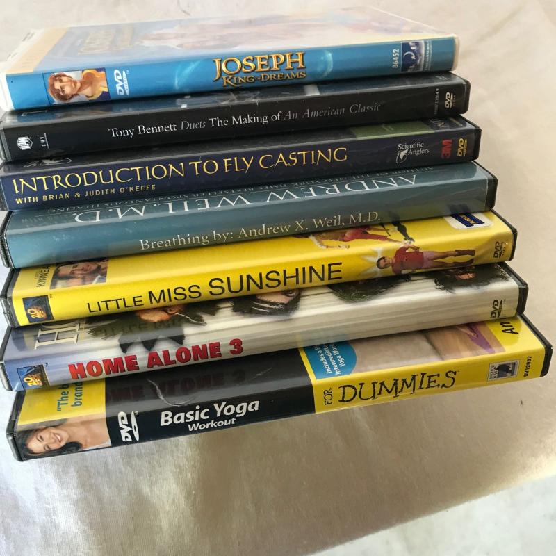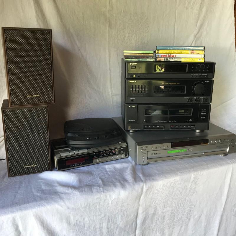 Sony DVD player and stereo system, Realistic speakers, cassette player/clock radio, video cassette rewinder, CDs and DVDs. See pics. No shipping