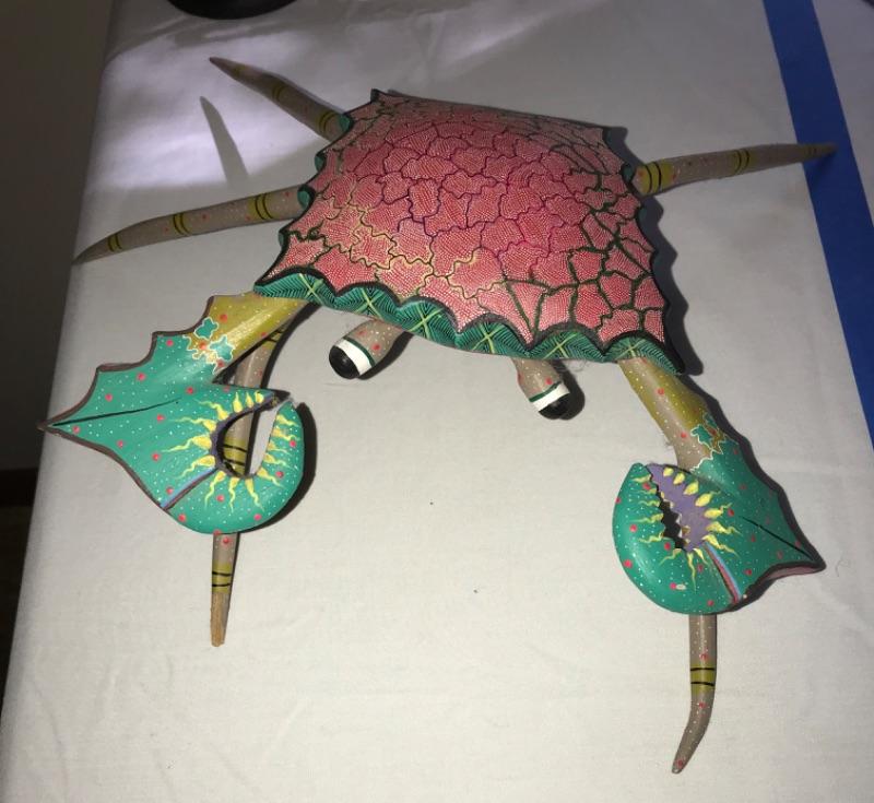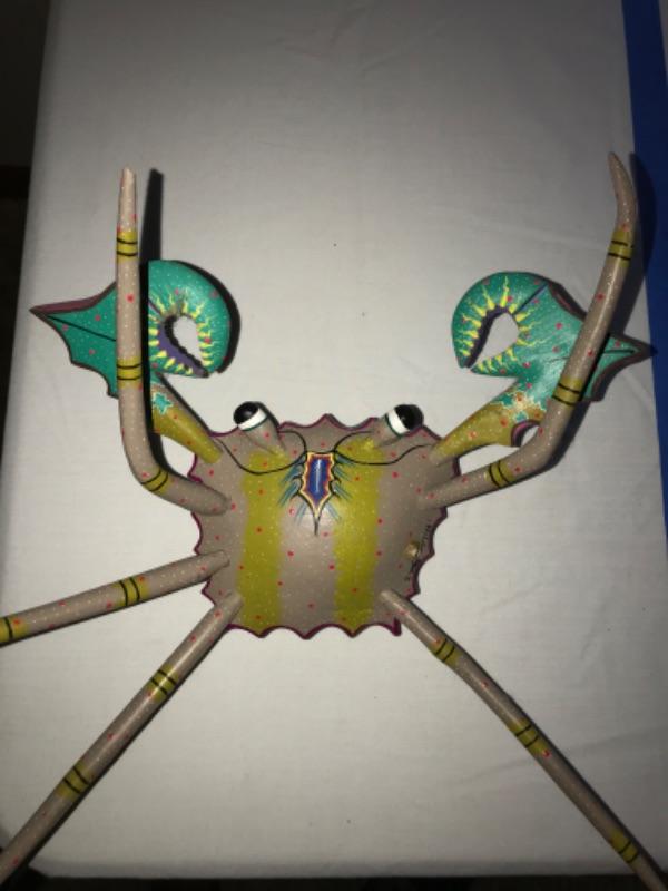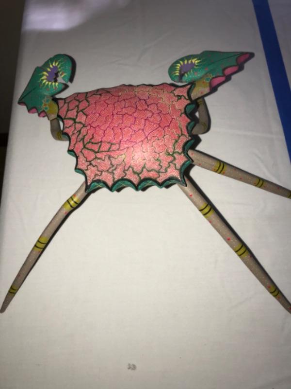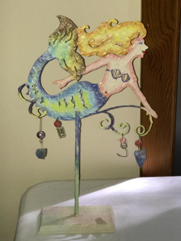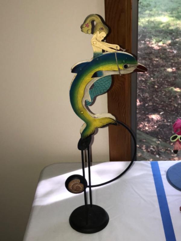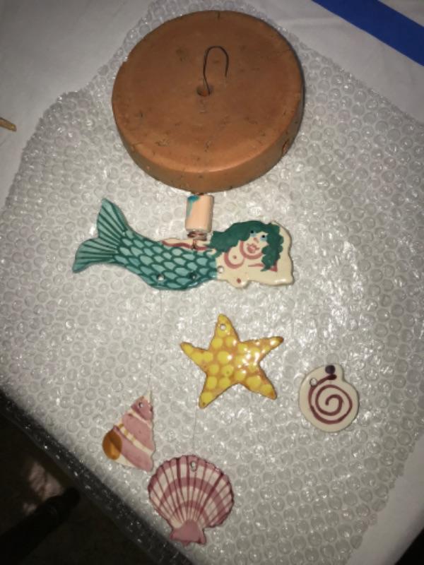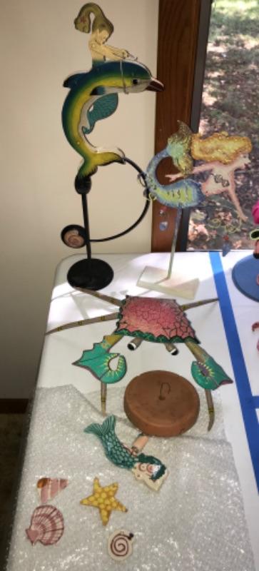 Lot of mermaid decor. Mermaid on stand. Mermaid riding dolphin rocks back and forth. Mermaid wind chime. Large crab signed Hilda Blas, has one broken leg and one leg is loose