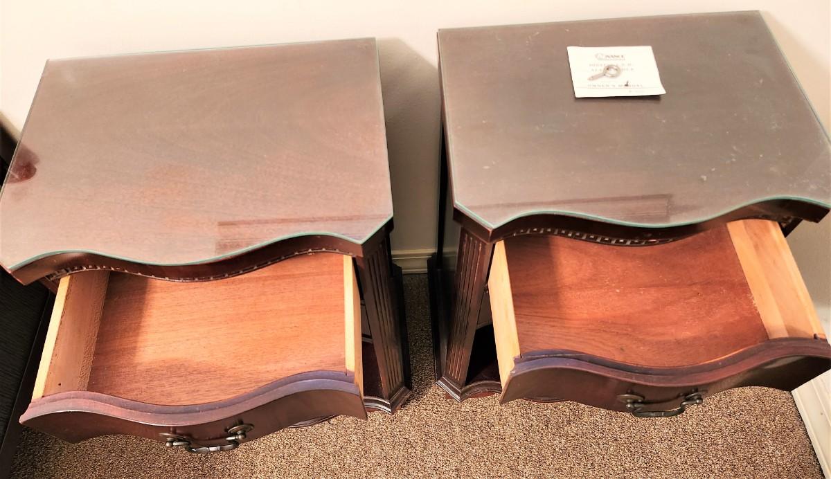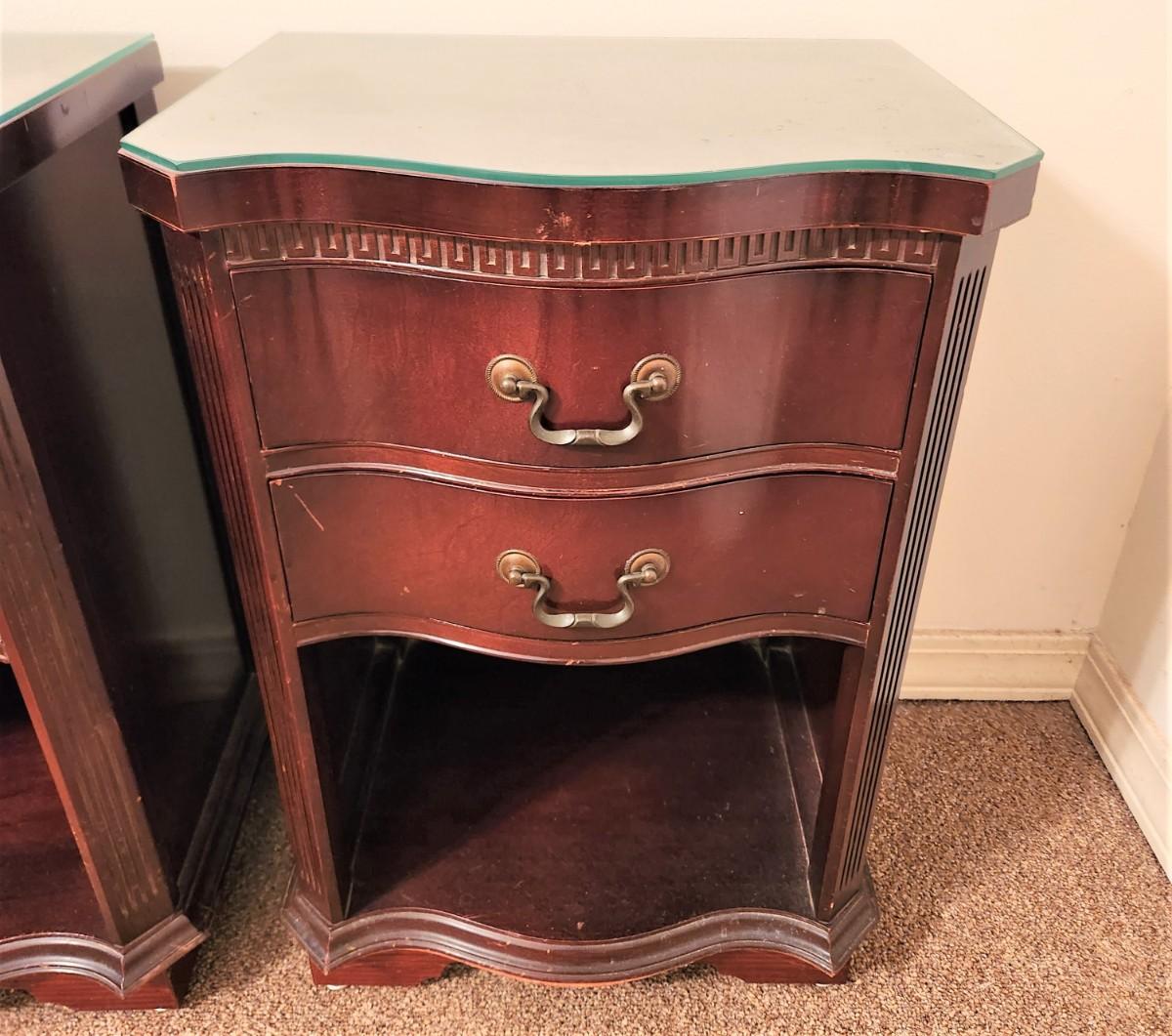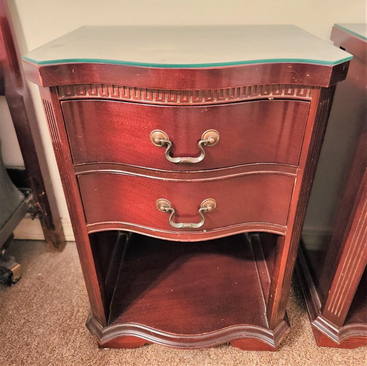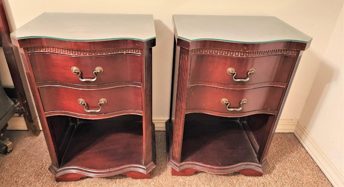 Very rare to find a pair of matching Mahogany nightstands from this era as sets then typically only came with one nightstand. This cute pair matches the dresser/Chest of Drawers listed earlier in the sale. 18" across, 13.5" deep, 26" tall, each has 2 drawers - they have custom glass tops to protect the surface. Vintage condition - used.
