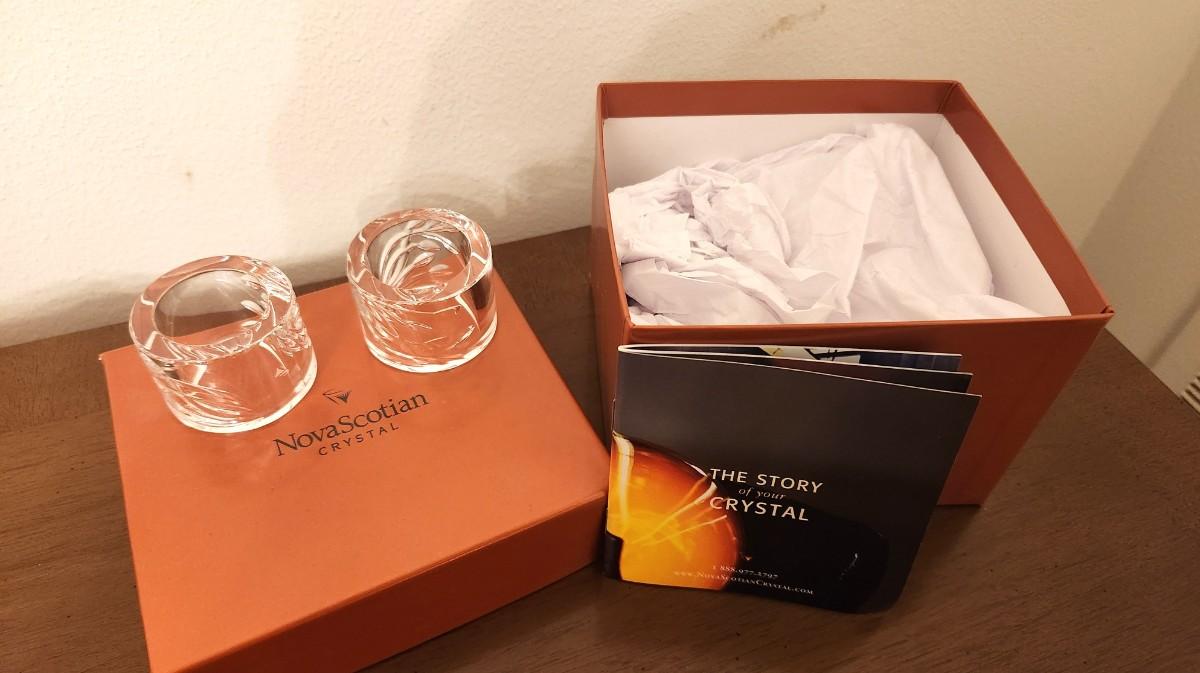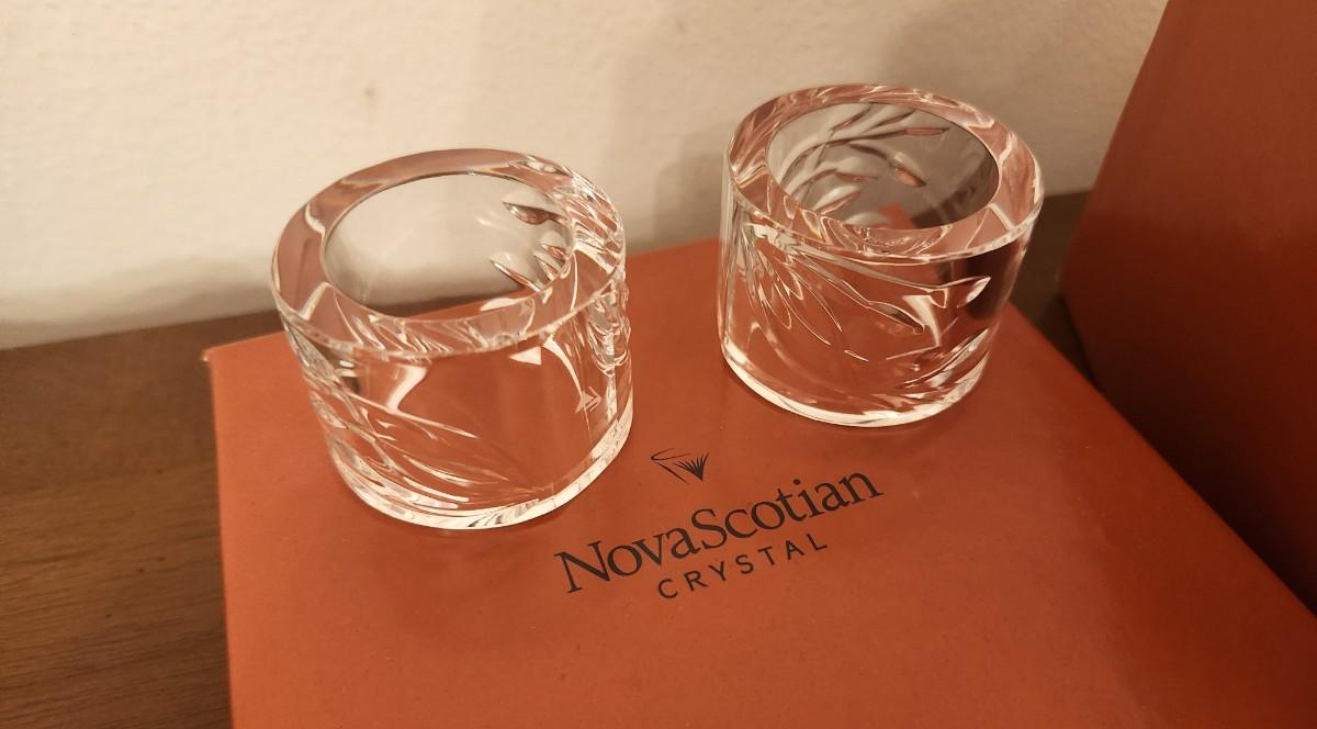 Nova Scotian crystal - set of 4 napkins rings in the "Annapolis" pattern, complete with insert (2 showing - the others still in box). Lovely - Nova Scotian crystal is the only crystal maker in Canada.