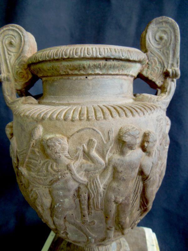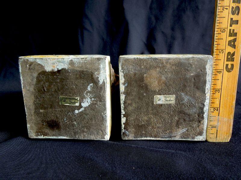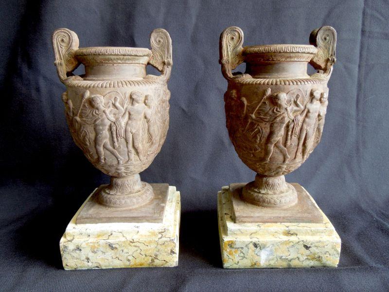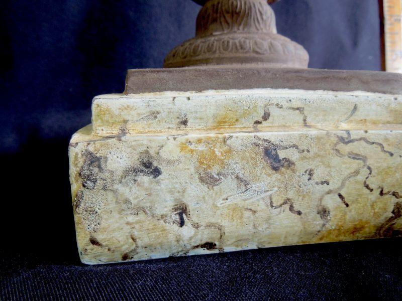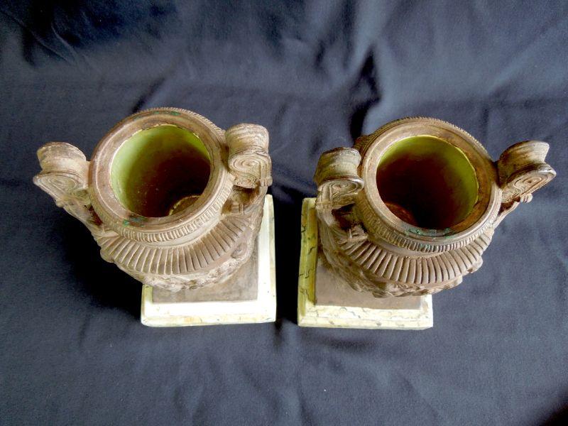 Faux painted marble wood bases. Urns are made of clay with metal inserts. 9" H. Base is 5" x 5".