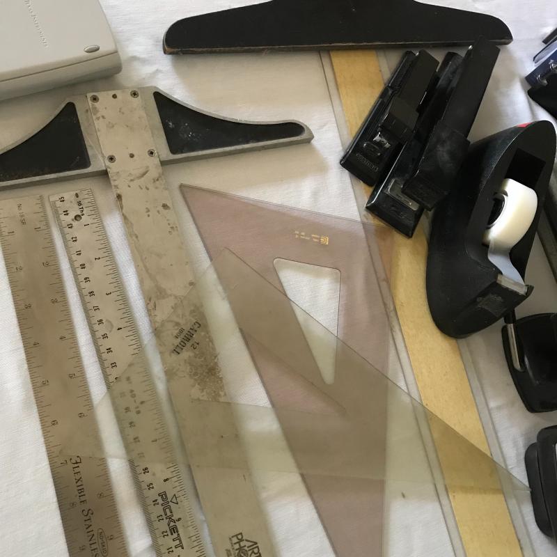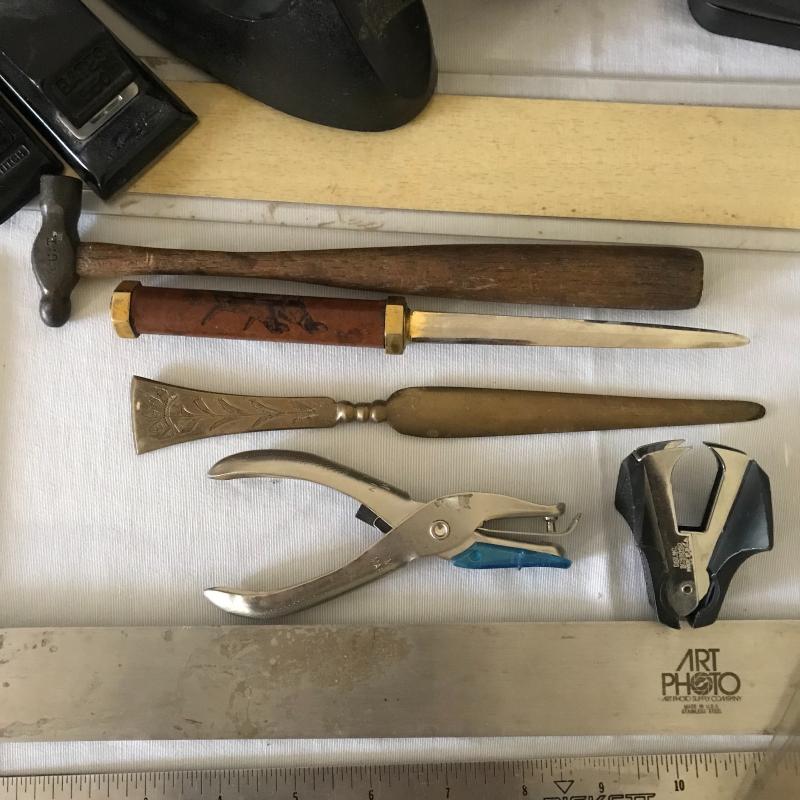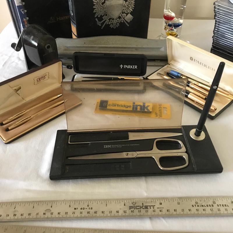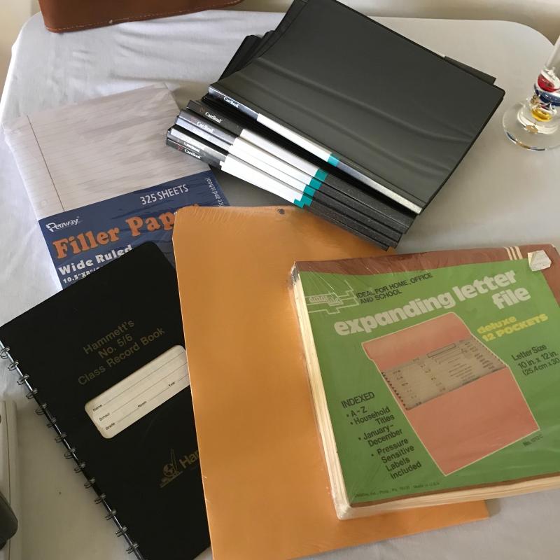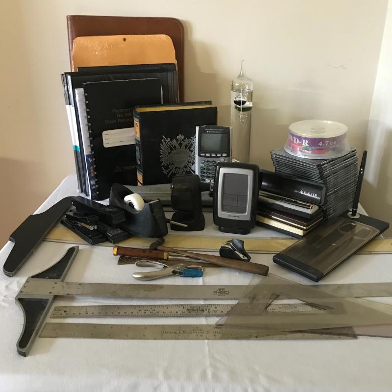 Large office collection includes TI-84 graphing calculator, needs four AAA batteries-working condition unknown. Unopened case of DVD -R discs and about thirty CD-R discs with cases. Lot also includes Acu-Rite digital forecaster, ornamental thermometer, hole-punches, scissors, stainless steel rulers and more! See photos for entire inventory. No shipping.