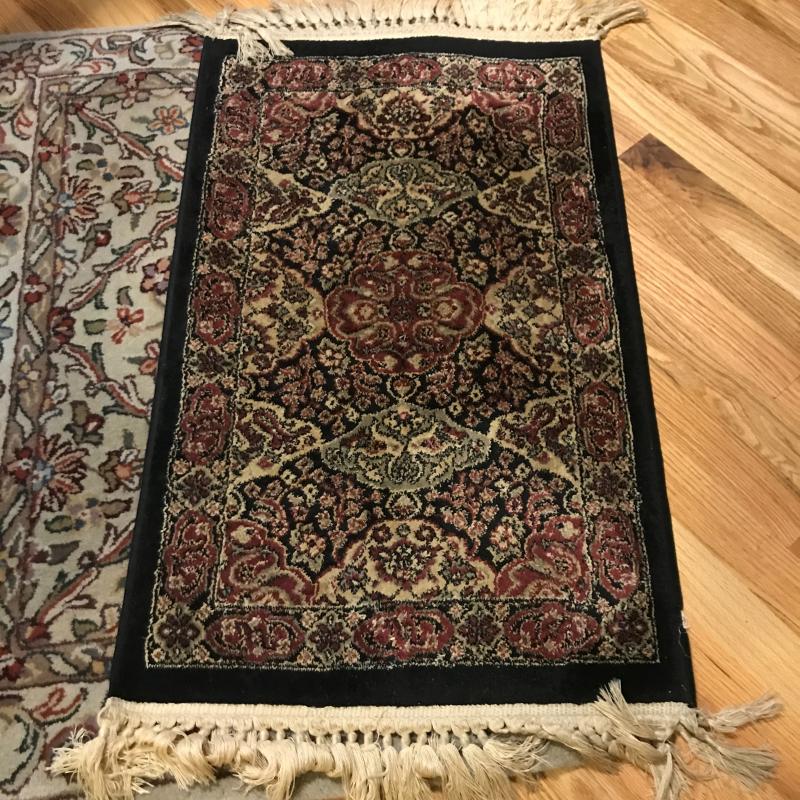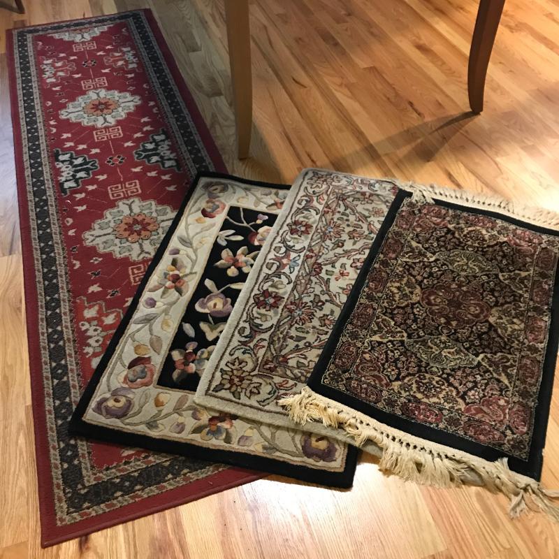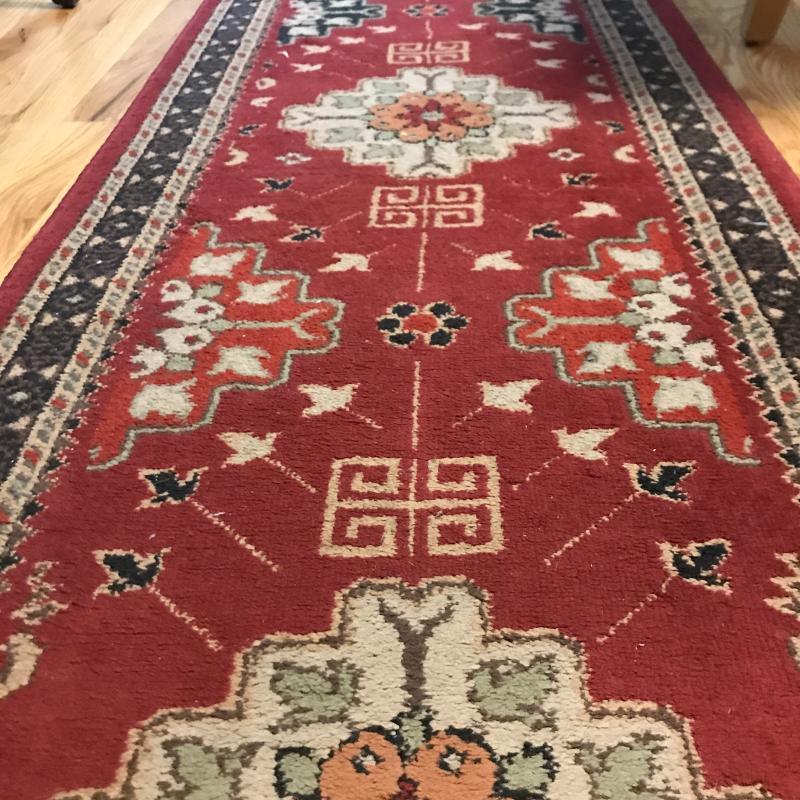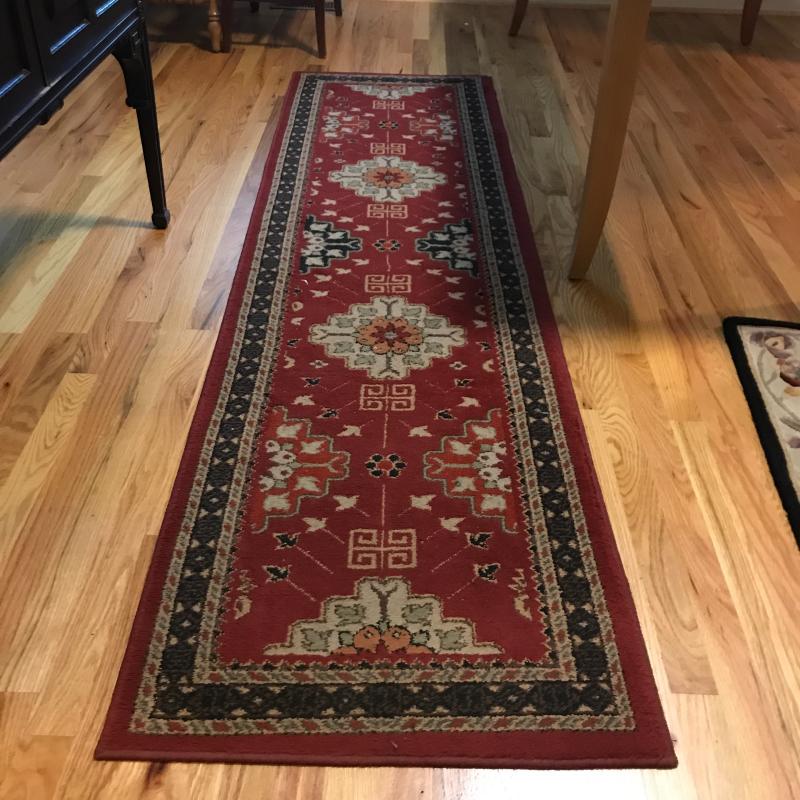 Red runner measures 93.5” x 25” and says 100% olefin on tag. In good shape but could use a cleaning. Three door mats measure approximately 37” x 24”. No pets or smokers in home. No shipping.