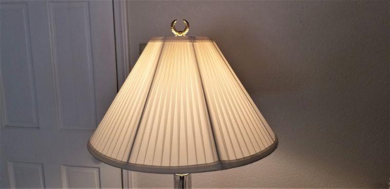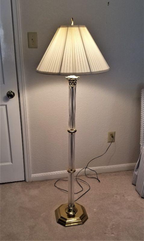 This floor lamp matches the table lamps in lot #115. Glass columnar base with brass accents - good shade - interesting half moon brass finial. 59" tall, 10.5" across the base.