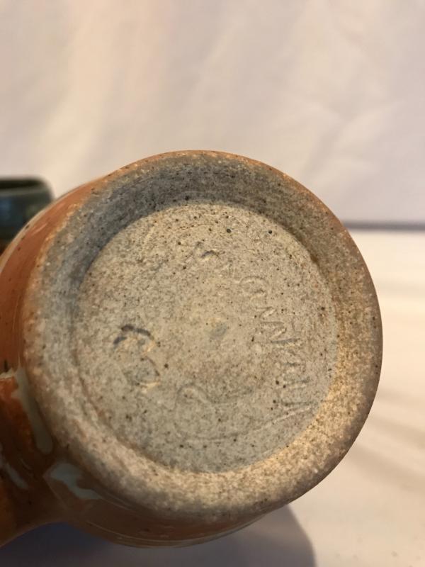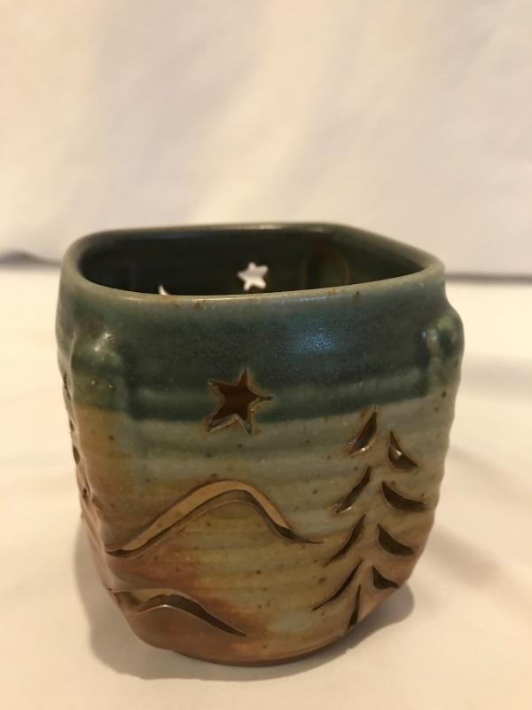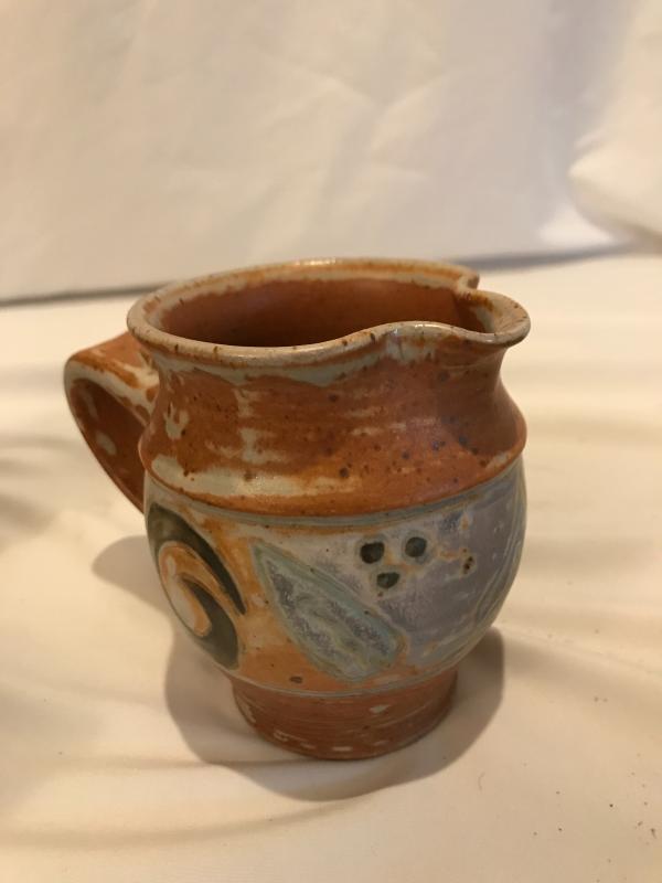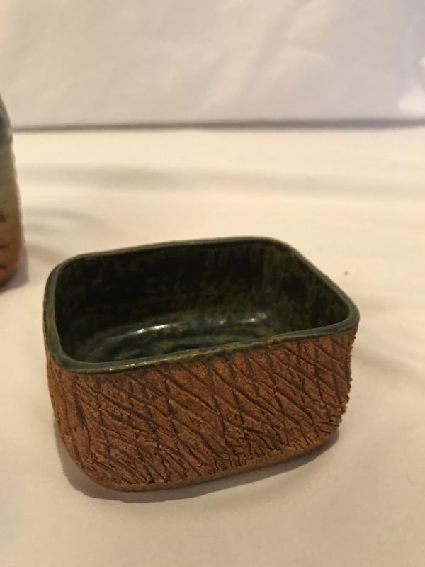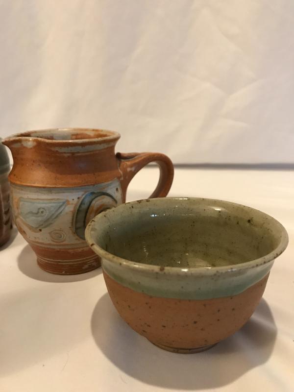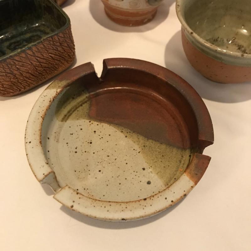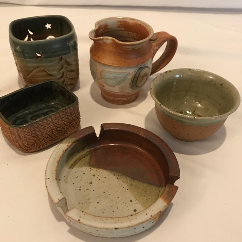 Mix of pottery pieces. Includes candle holder with tree cut out that measures 3.5”sq x 4”h. Also includes ashtray, creamer and two small bowls. See photos for details. Shipping or local pick up in Asheville.