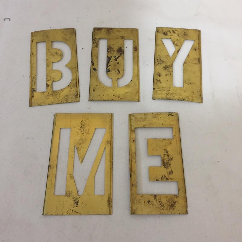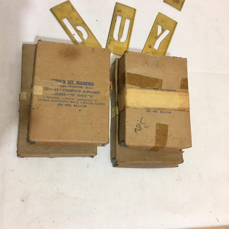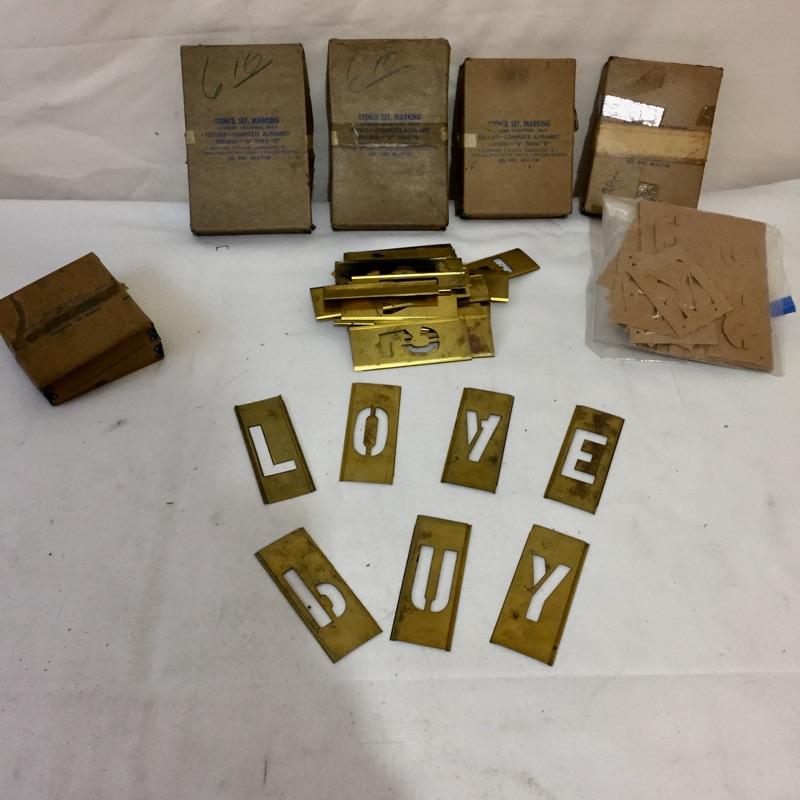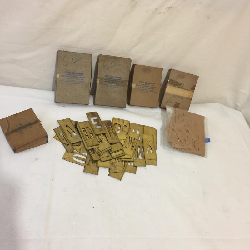A total of 5 boxes of vintage brass stencils in assorted sizes that include the alphabet, numbers and more.