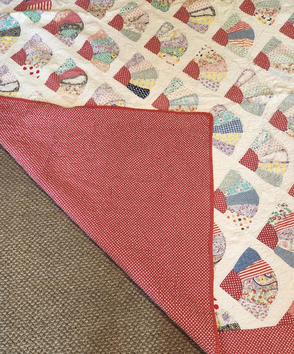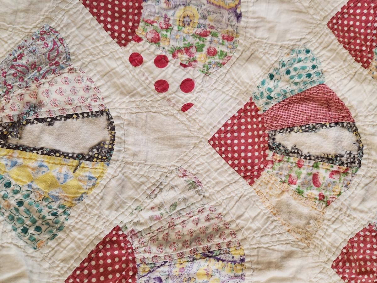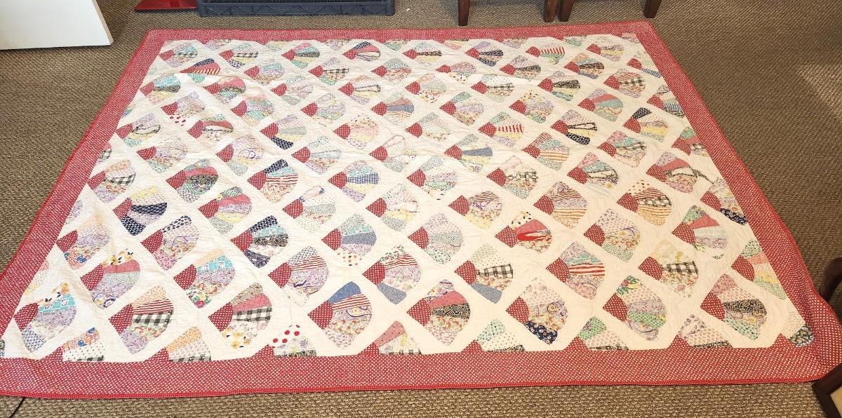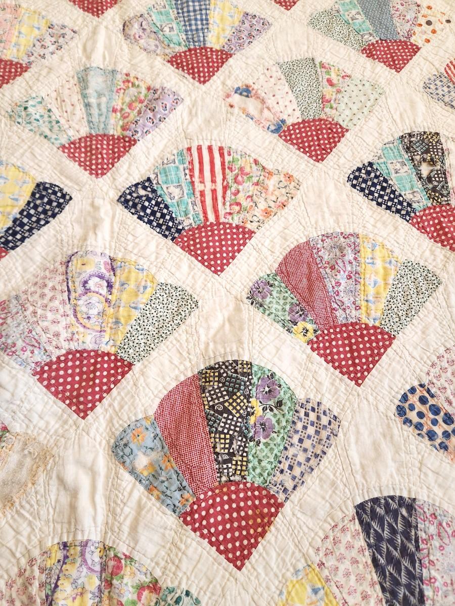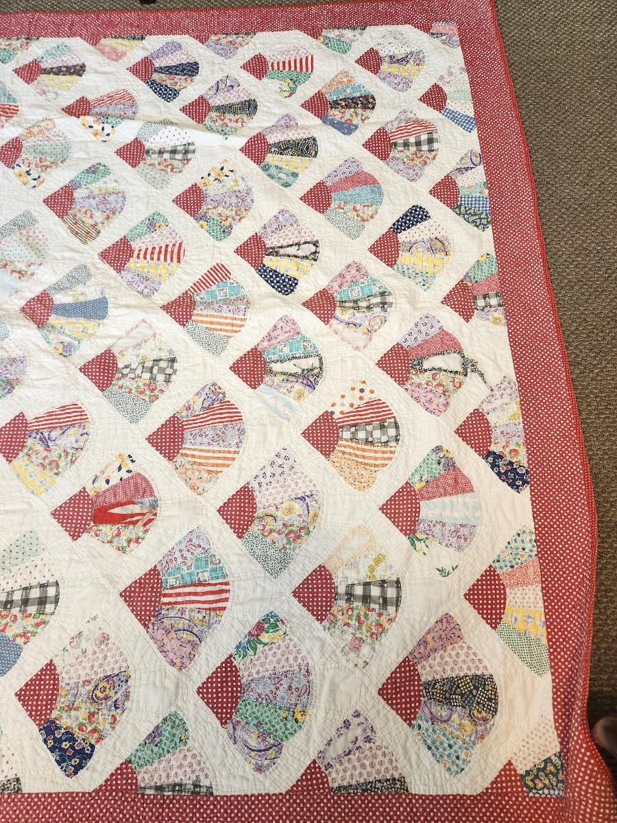 Clean, fan pattern vintage handsewn quilt - 67" across, 90" long - note photos - this should be considered a "cutter" or "project quilt to be cut down and made into crafts or other things. It's still a beauty.