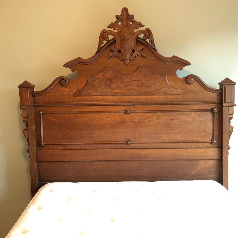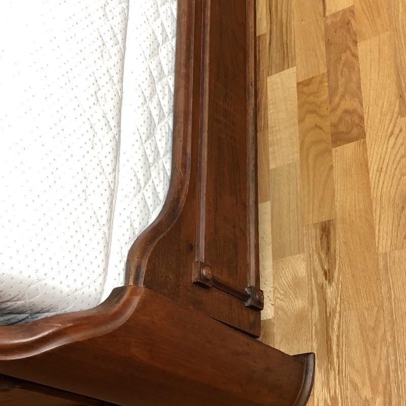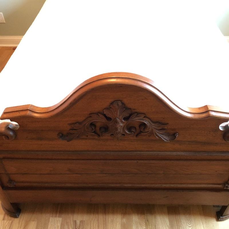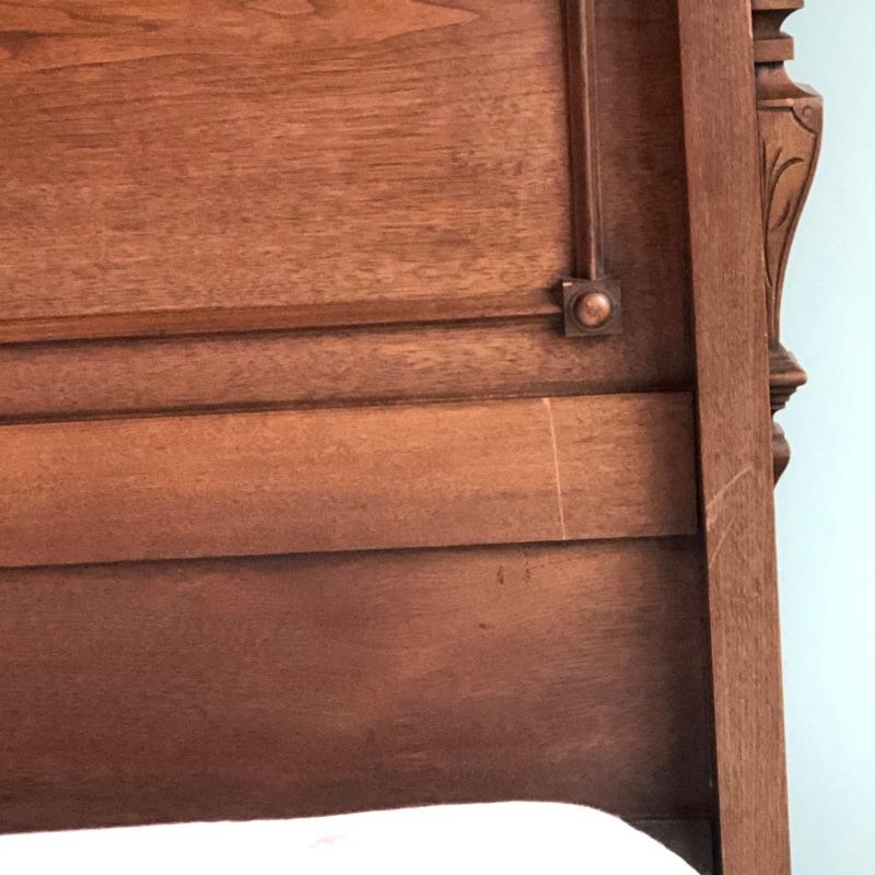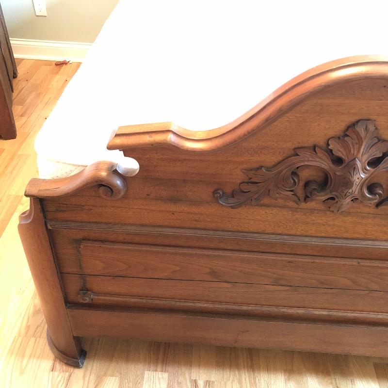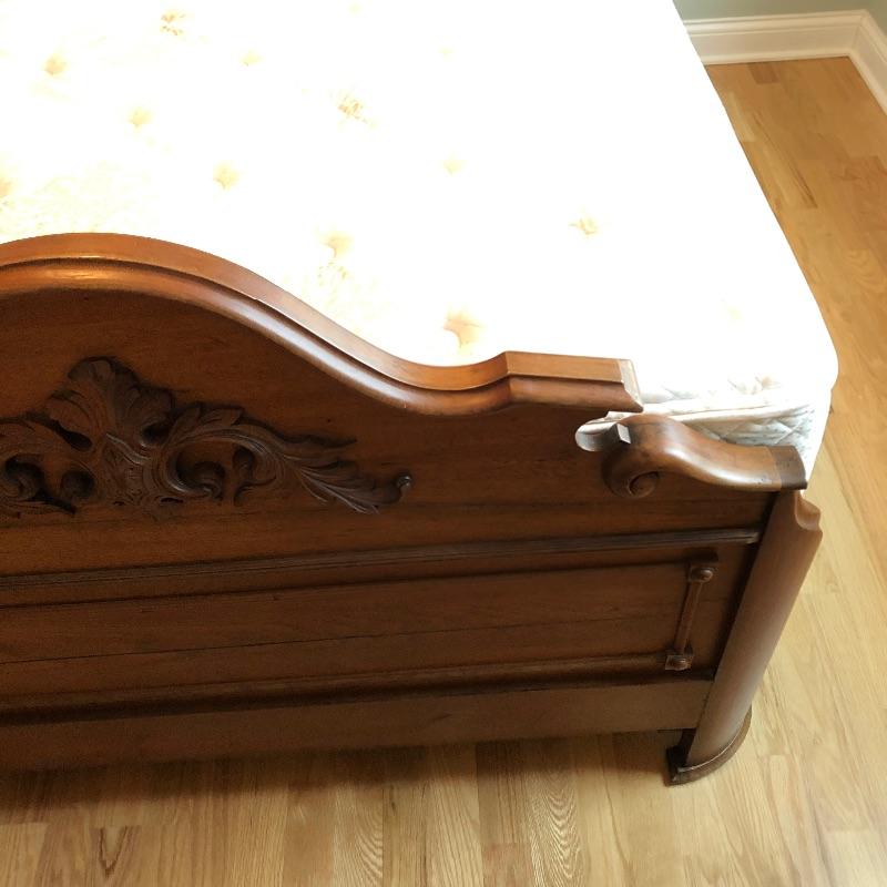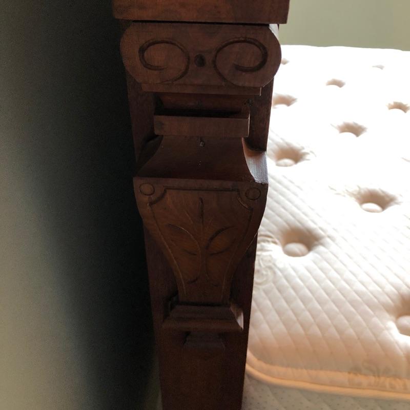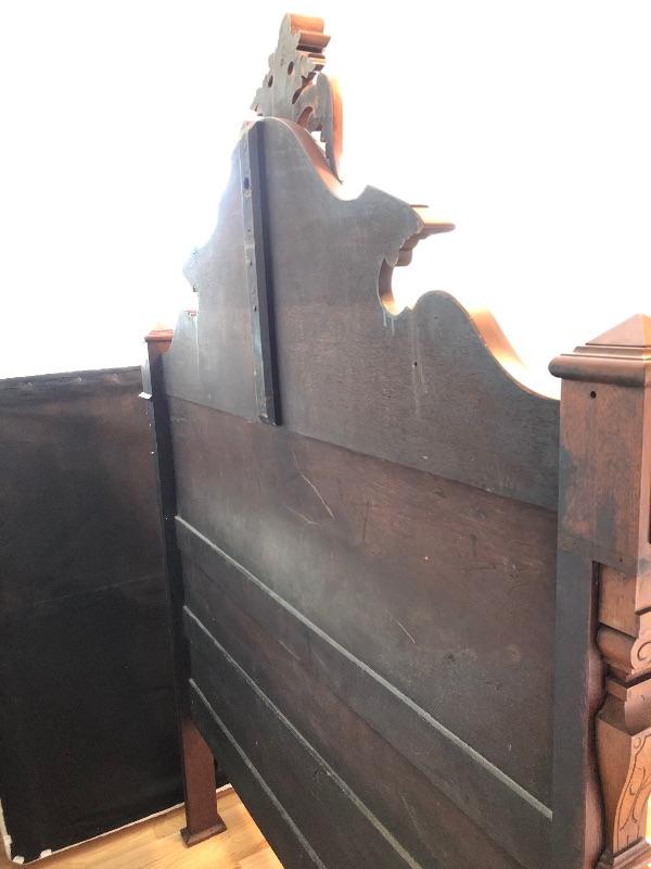 Amazing solid wood headboard and footboard for double sized mattress and box spring. Beautiful detailing and design throughout with only minor blemishes see photos. Lots 113 & 122 will complete this set.