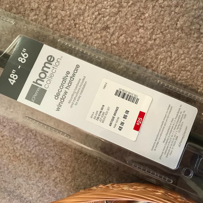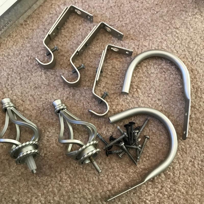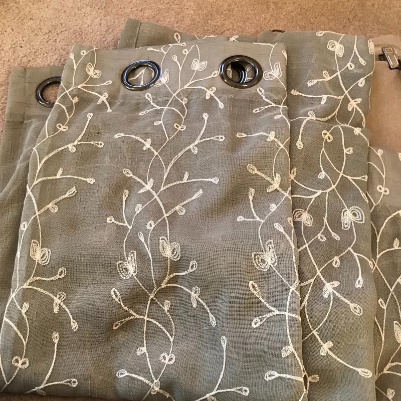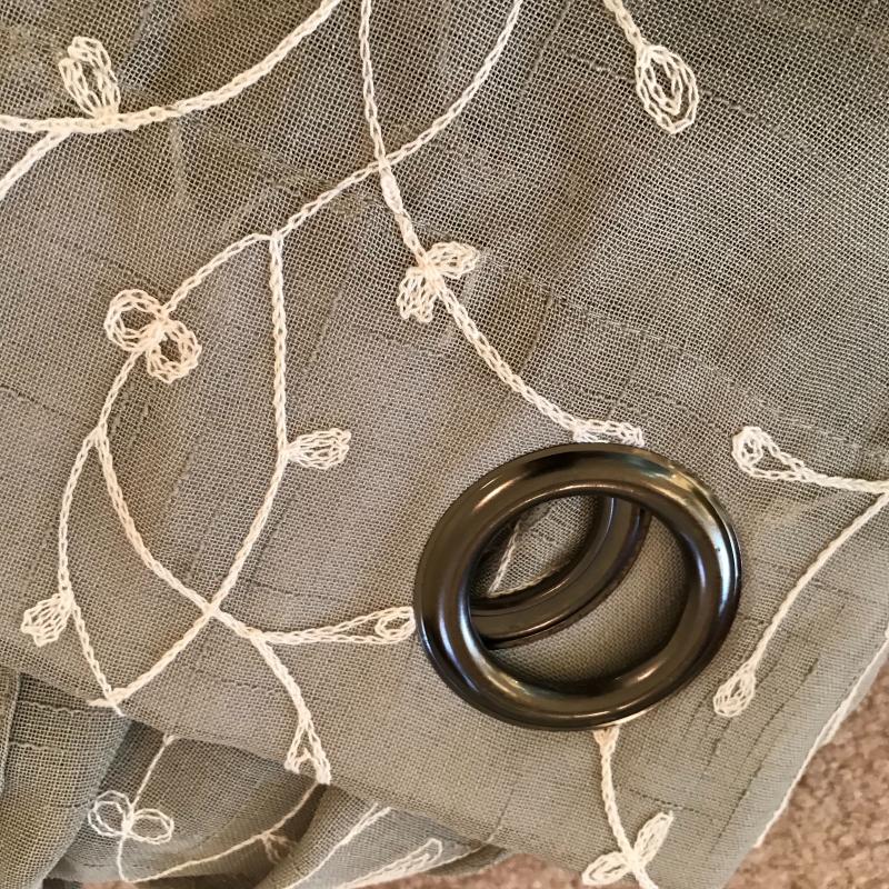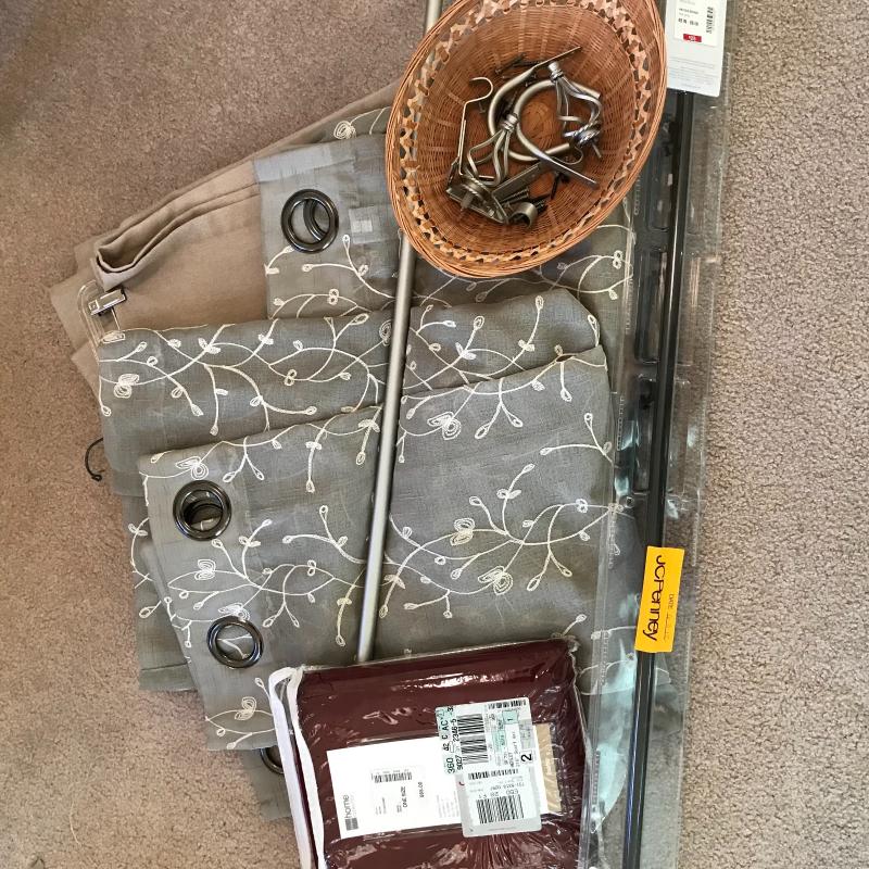 This lot includes two decorative curtain rods with hardware (one new in packaging with retail price of $25), one deep red curtain panel (new in packaging with retail price of $65), two sage green curtain panels with vine embroidery, approx. 84” long x 50” wide, and two sand-colored blackout curtains, approx. 80” long x 55” wide.