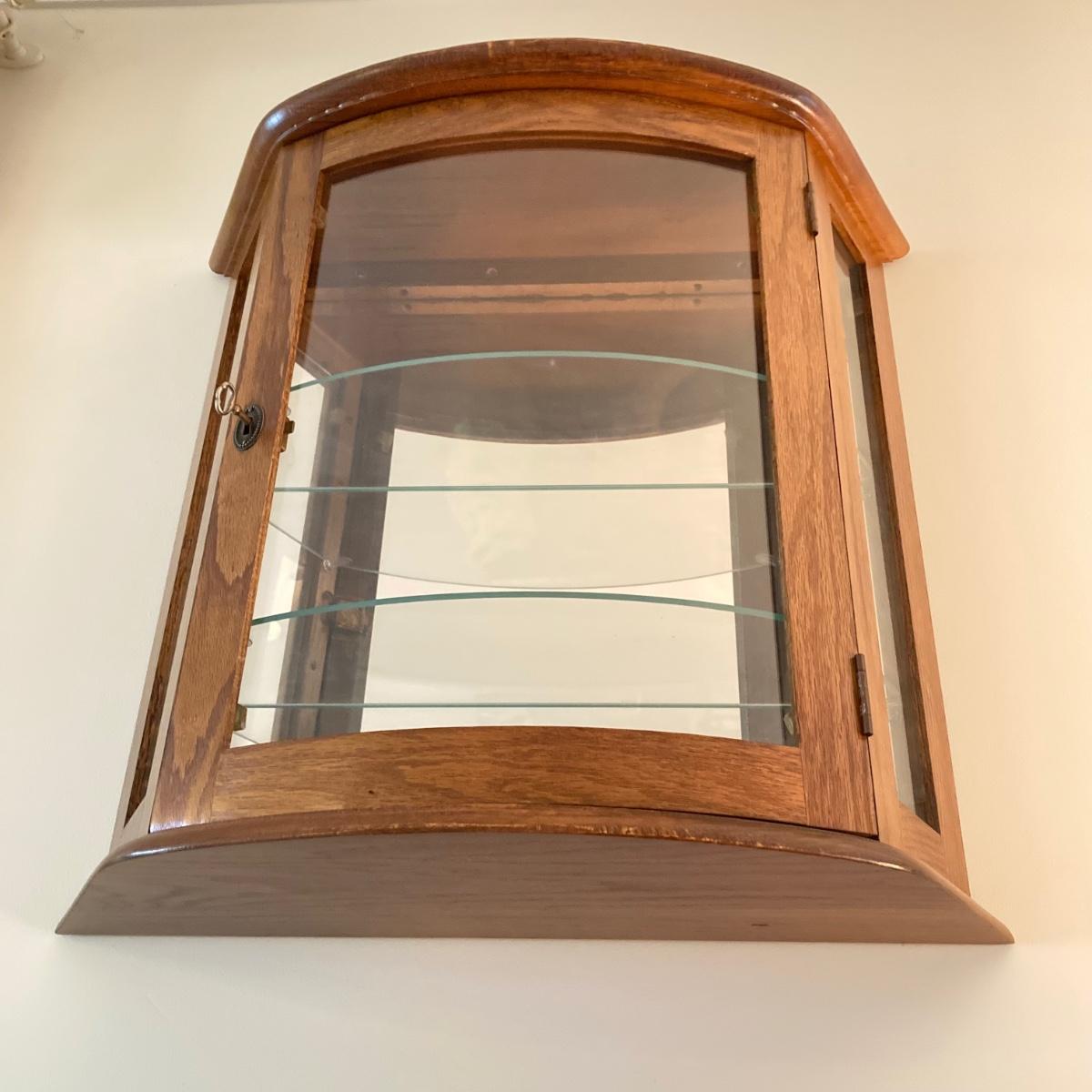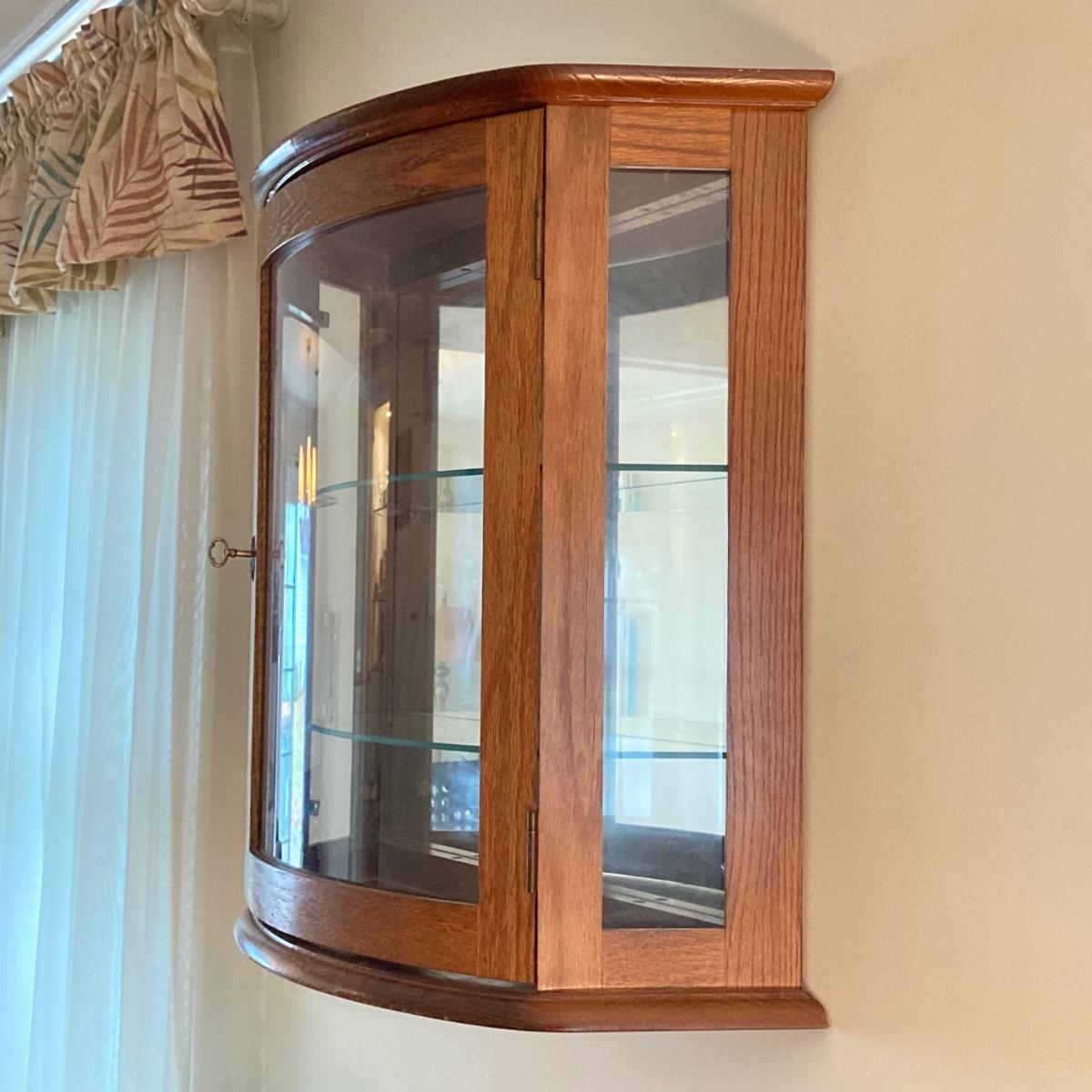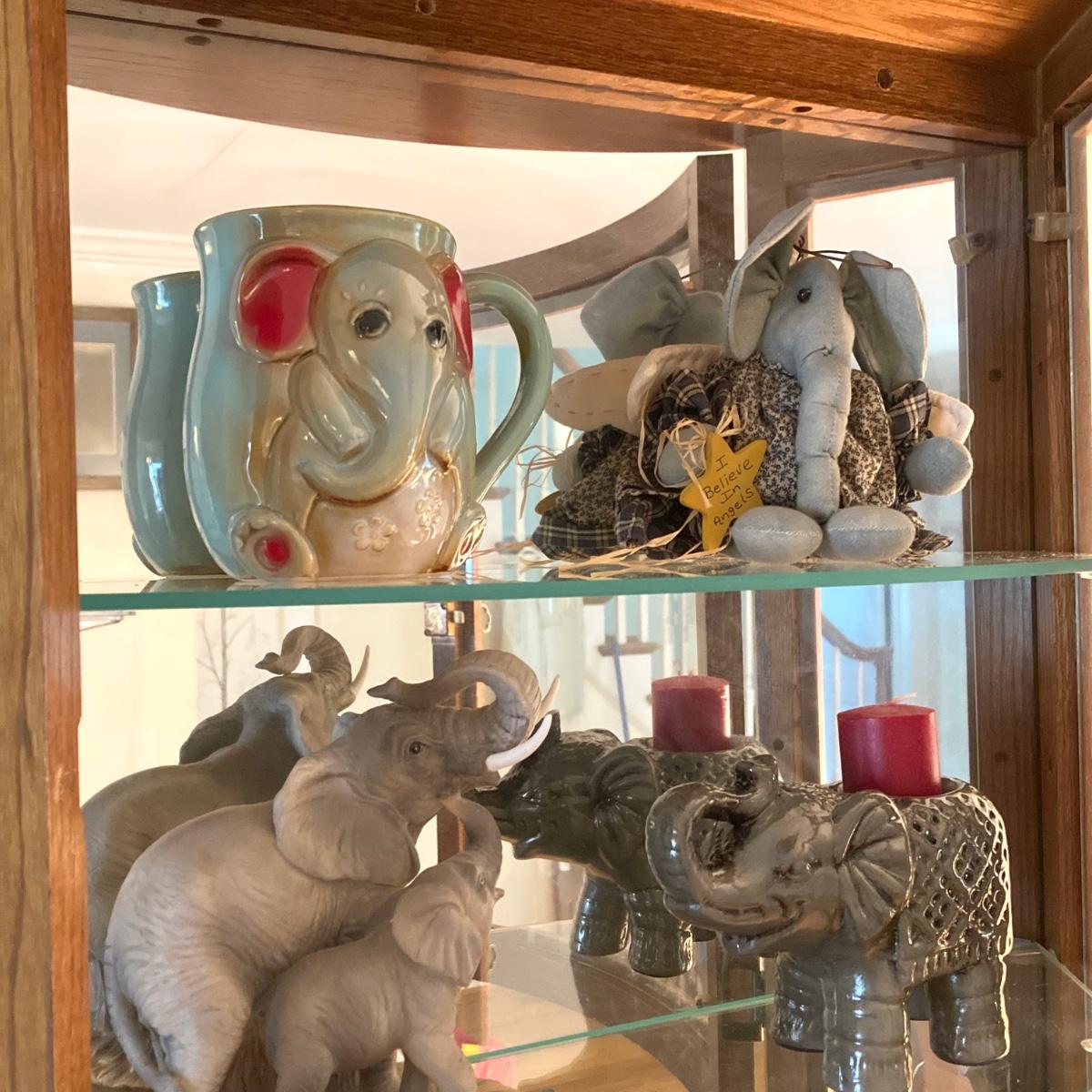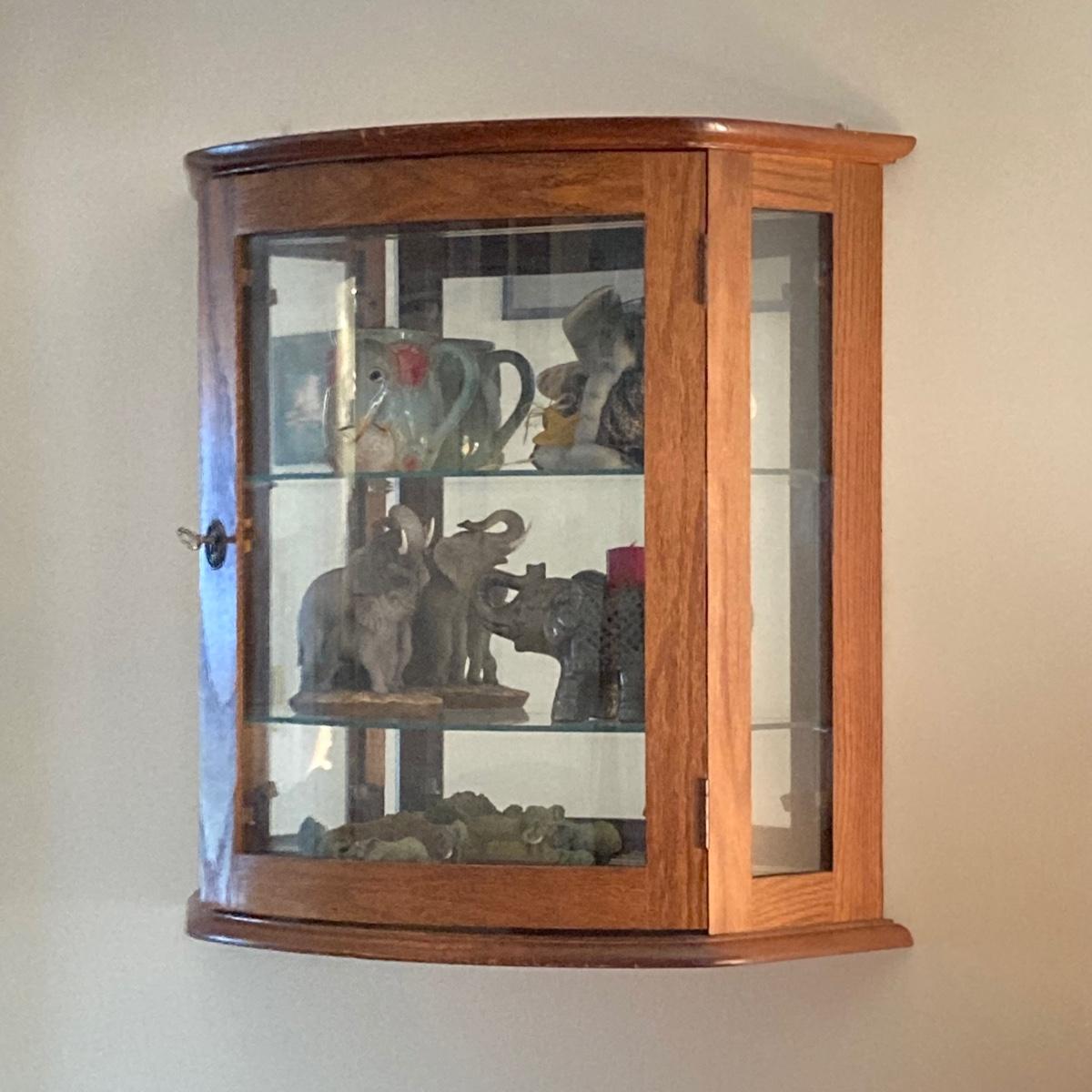 LOT 33: Wall Mount / Hanging Curio Cabinet with Glass Shelves & Doors with Collection of Collectible Elephant Decor