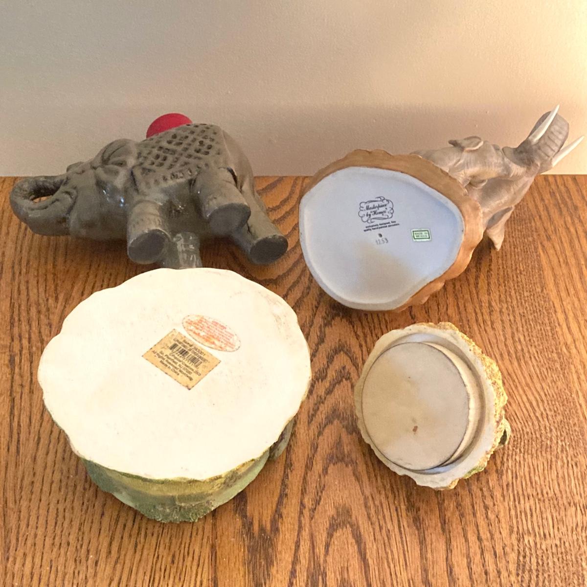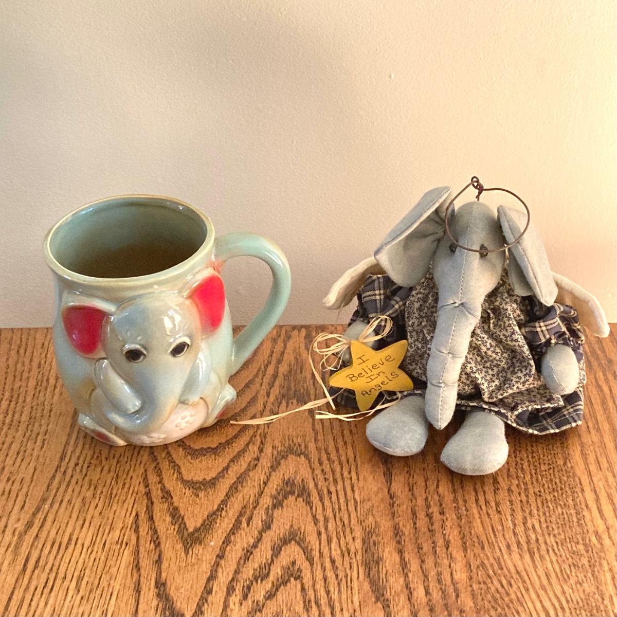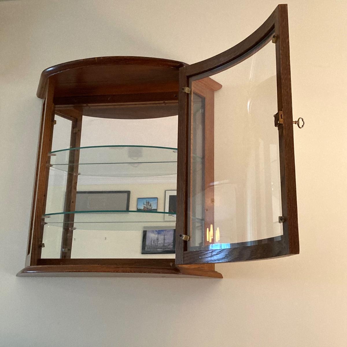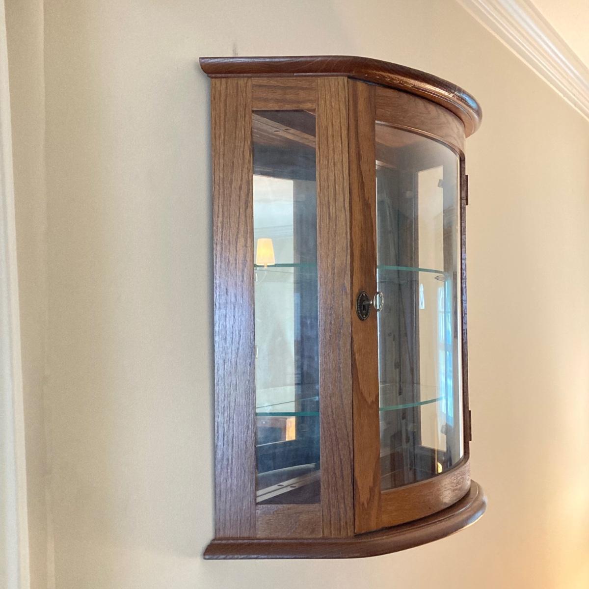 LOT 33: Wall Mount / Hanging Curio Cabinet with Glass Shelves & Doors with Collection of Collectible Elephant Decor