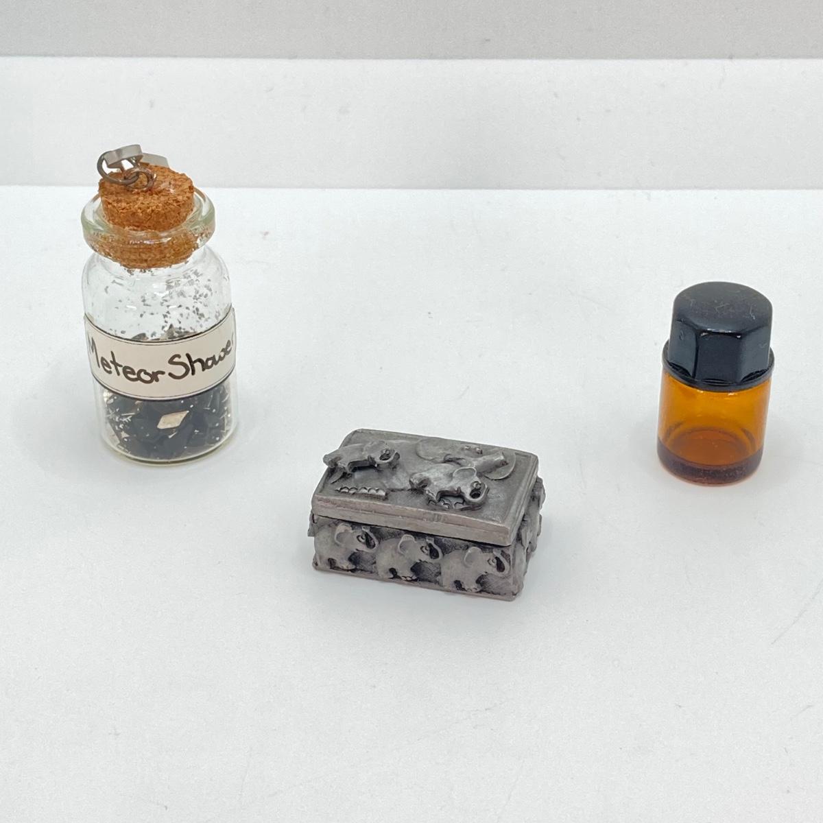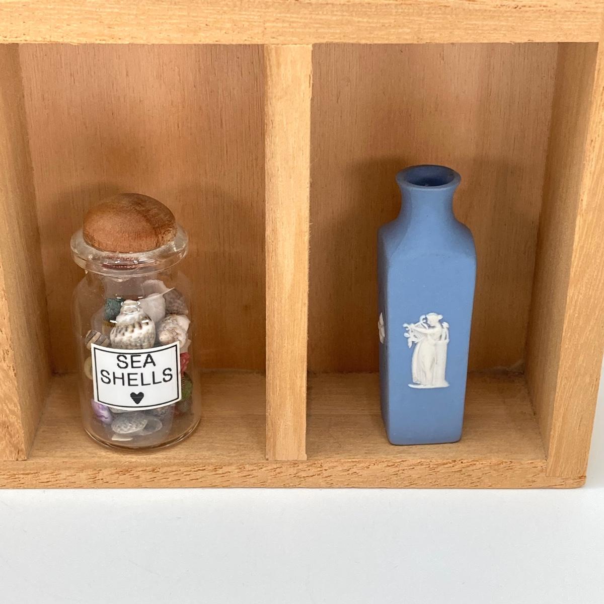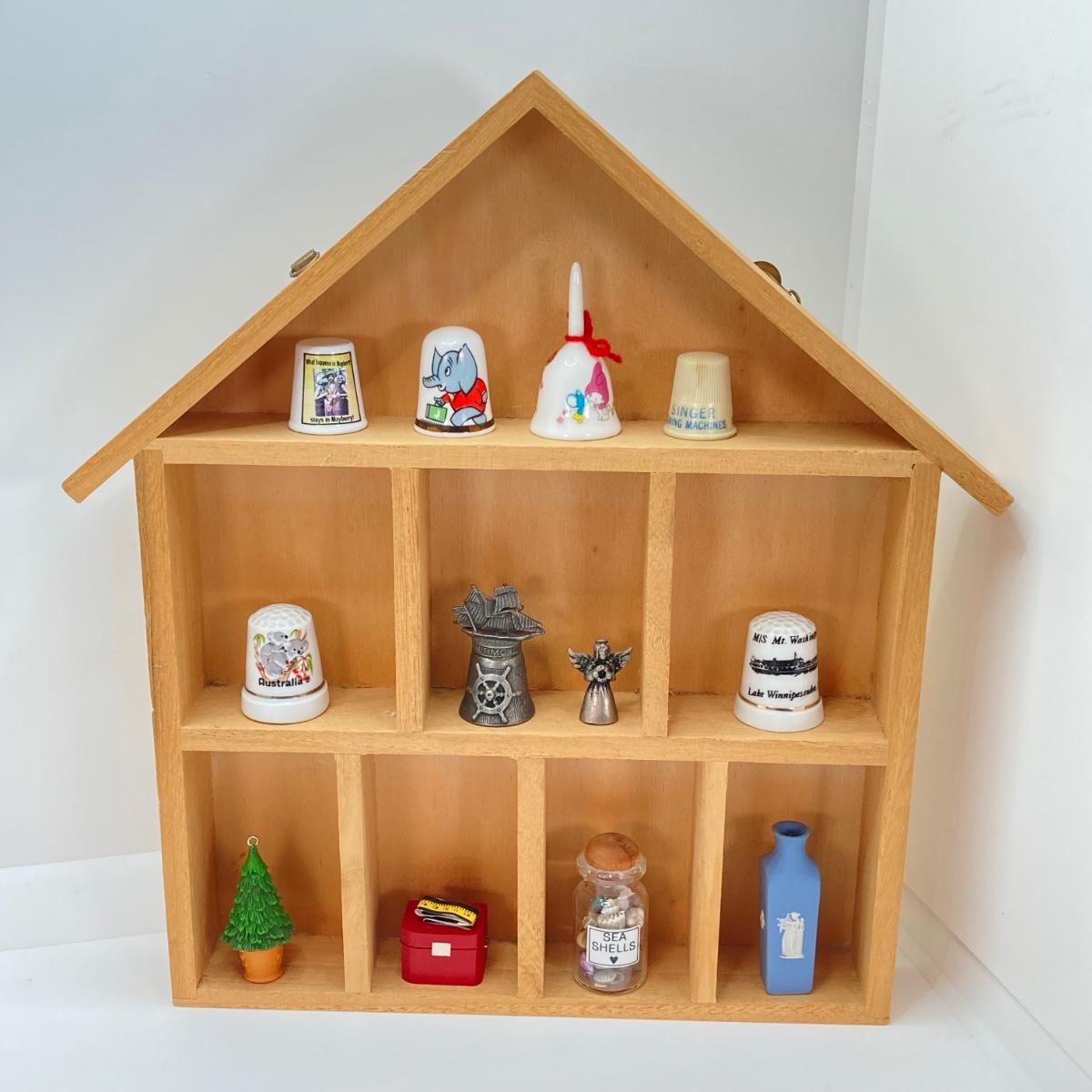 LOT 38: Wall Mount / Hanging Miniature Holder with Collection of Thimbles, Miniatures and More