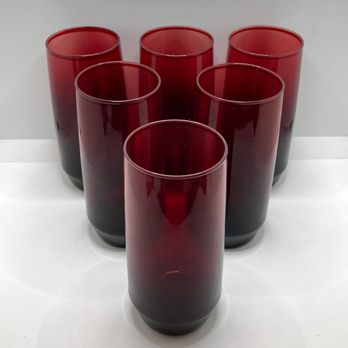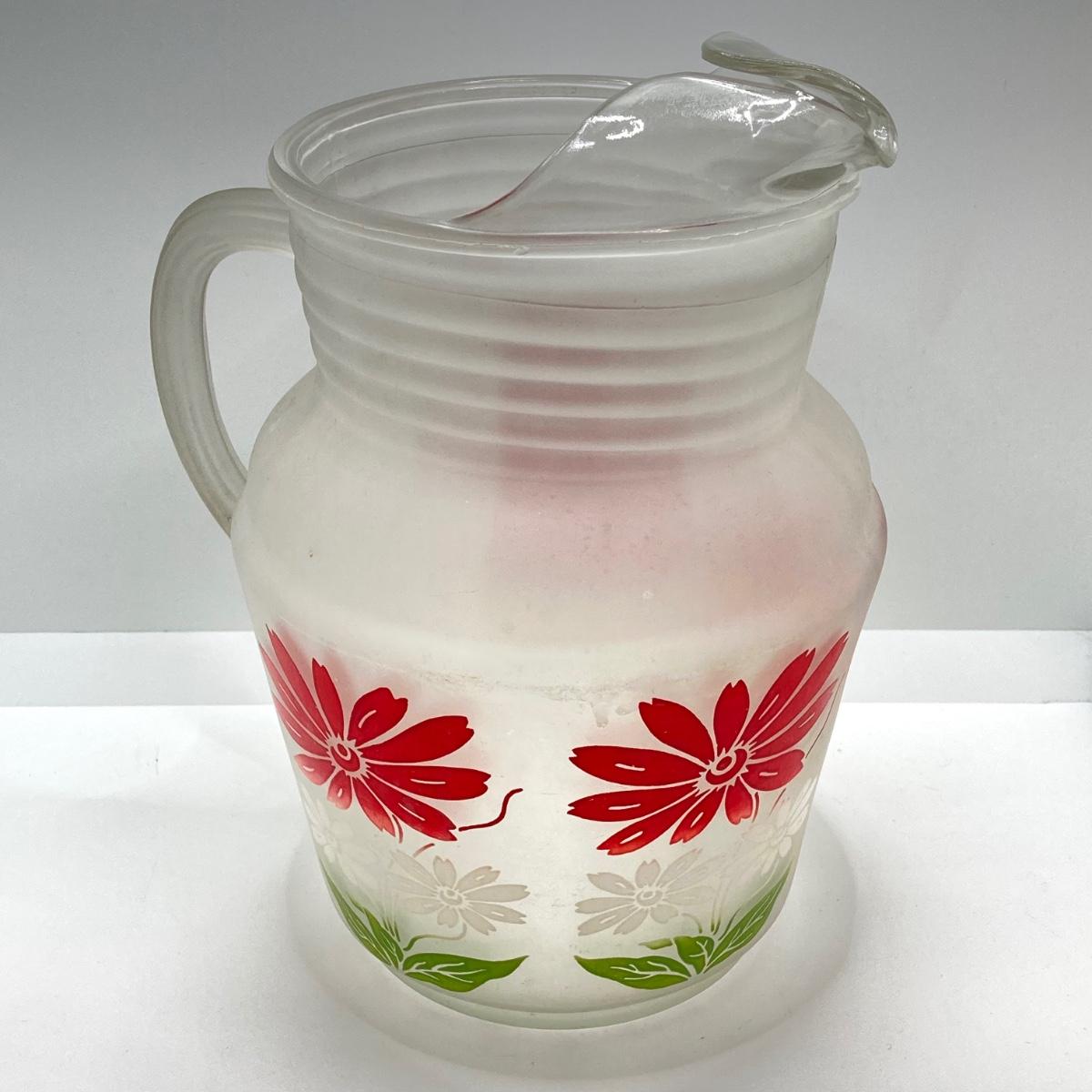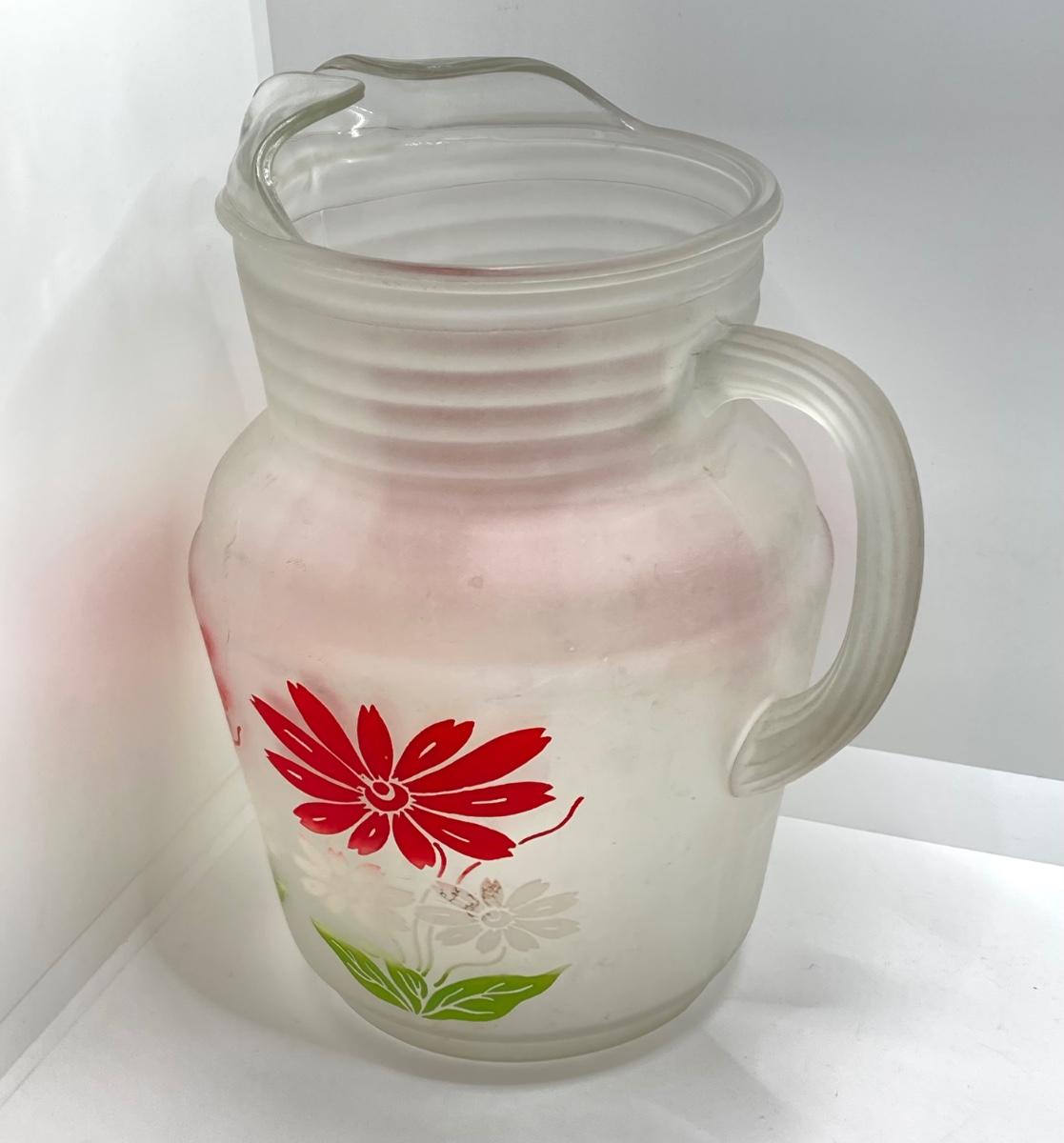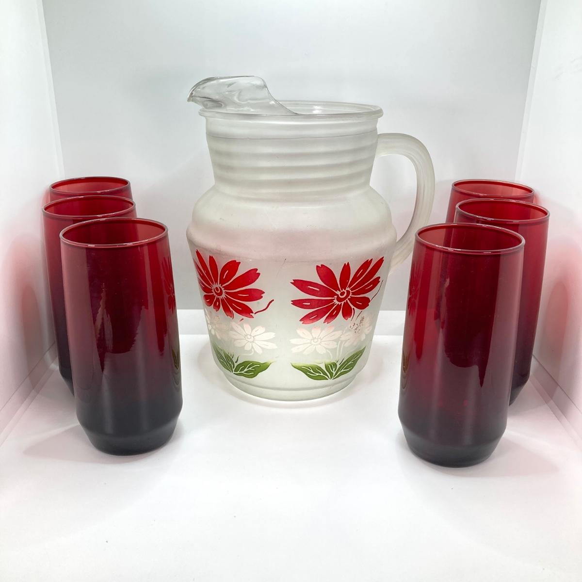 LOT 50: Beautiful Frosted Glass Pitcher with Six Ruby Red Drinking Glasses