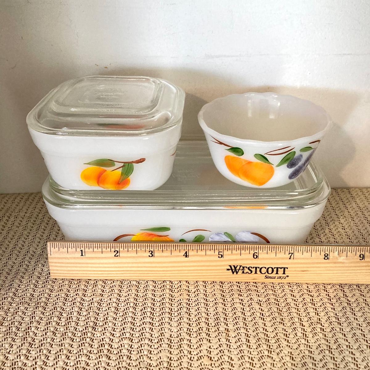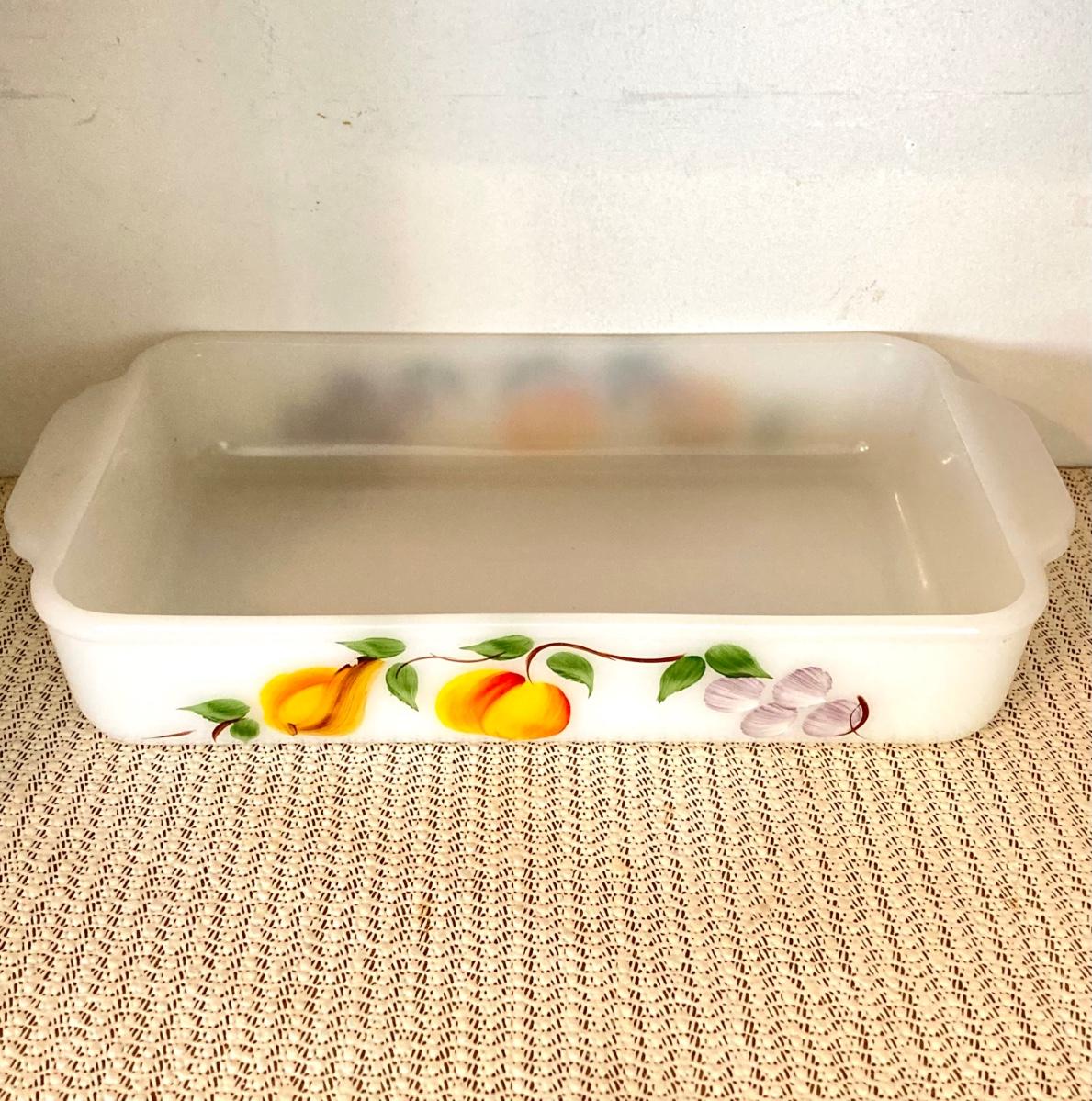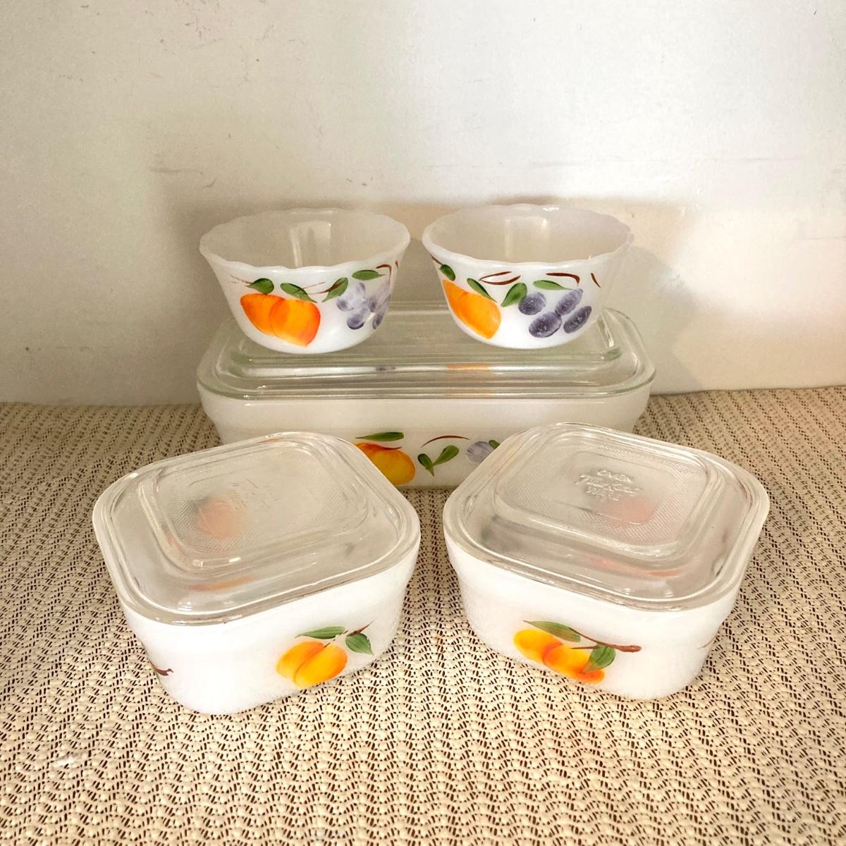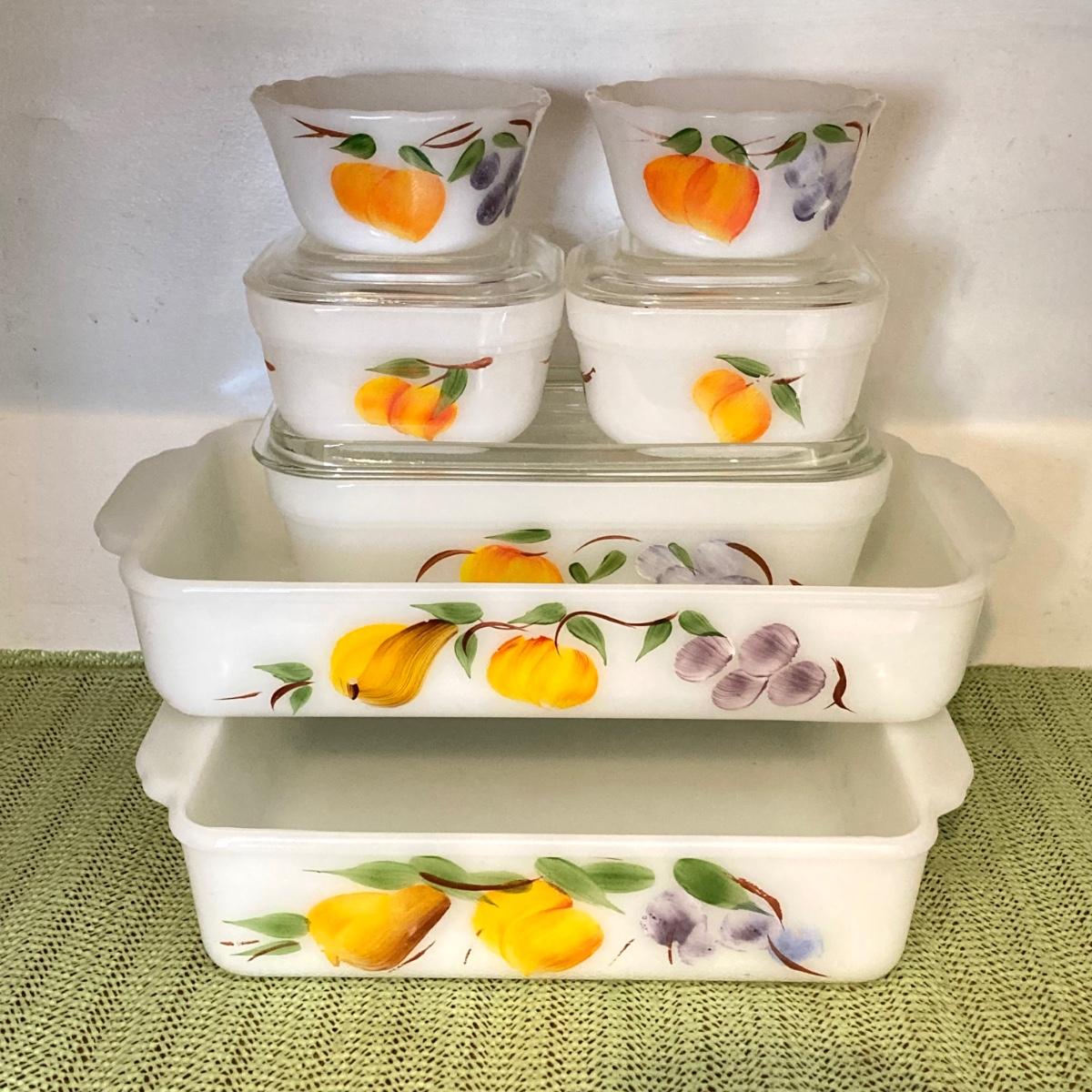 LOT 66: Vintage Fire King Oven Ware Milk Glass Pear Peach Grapes Set with Cookbooks, Towels and More