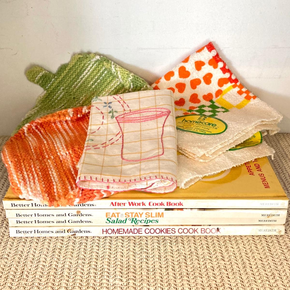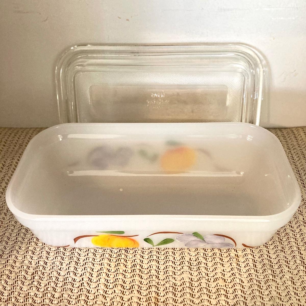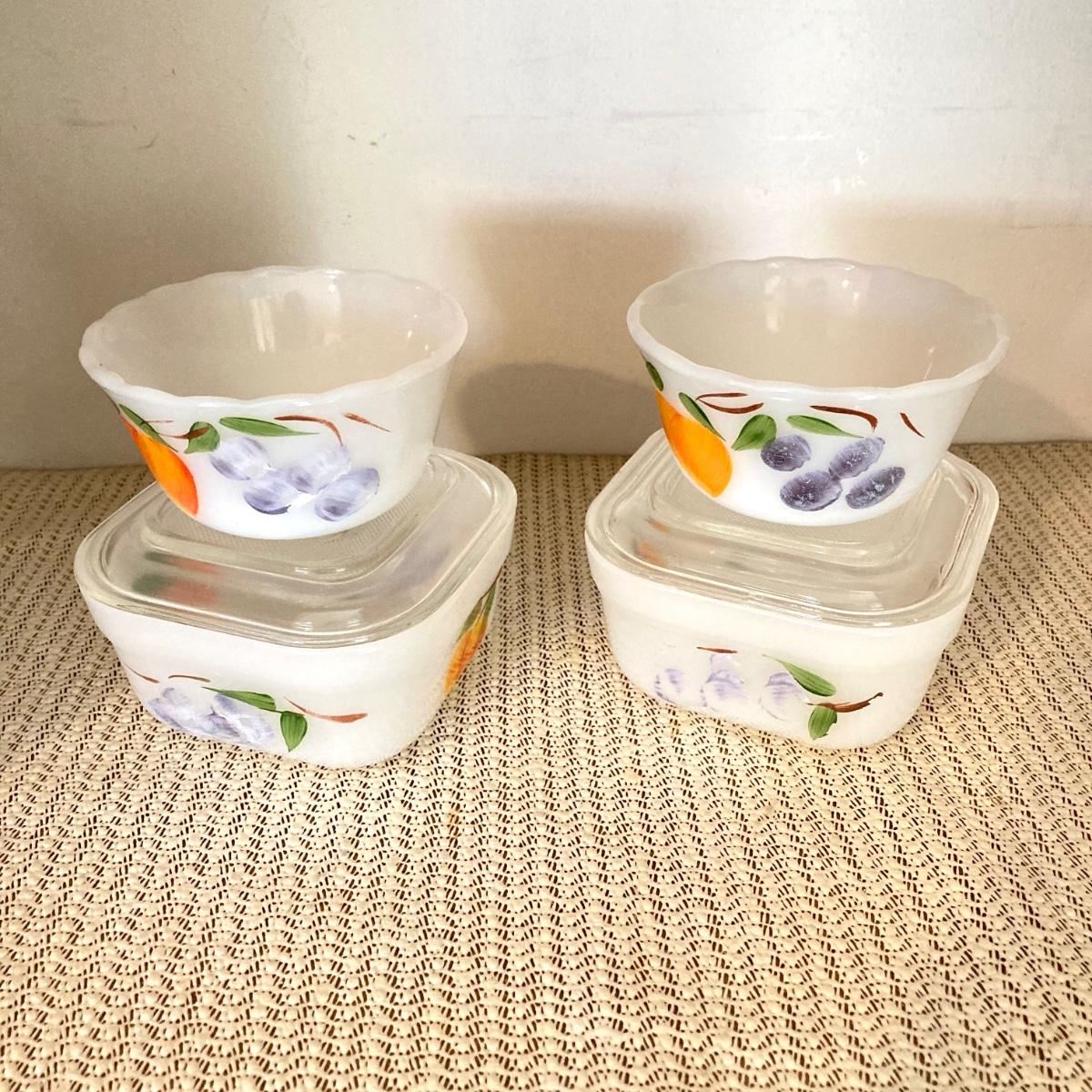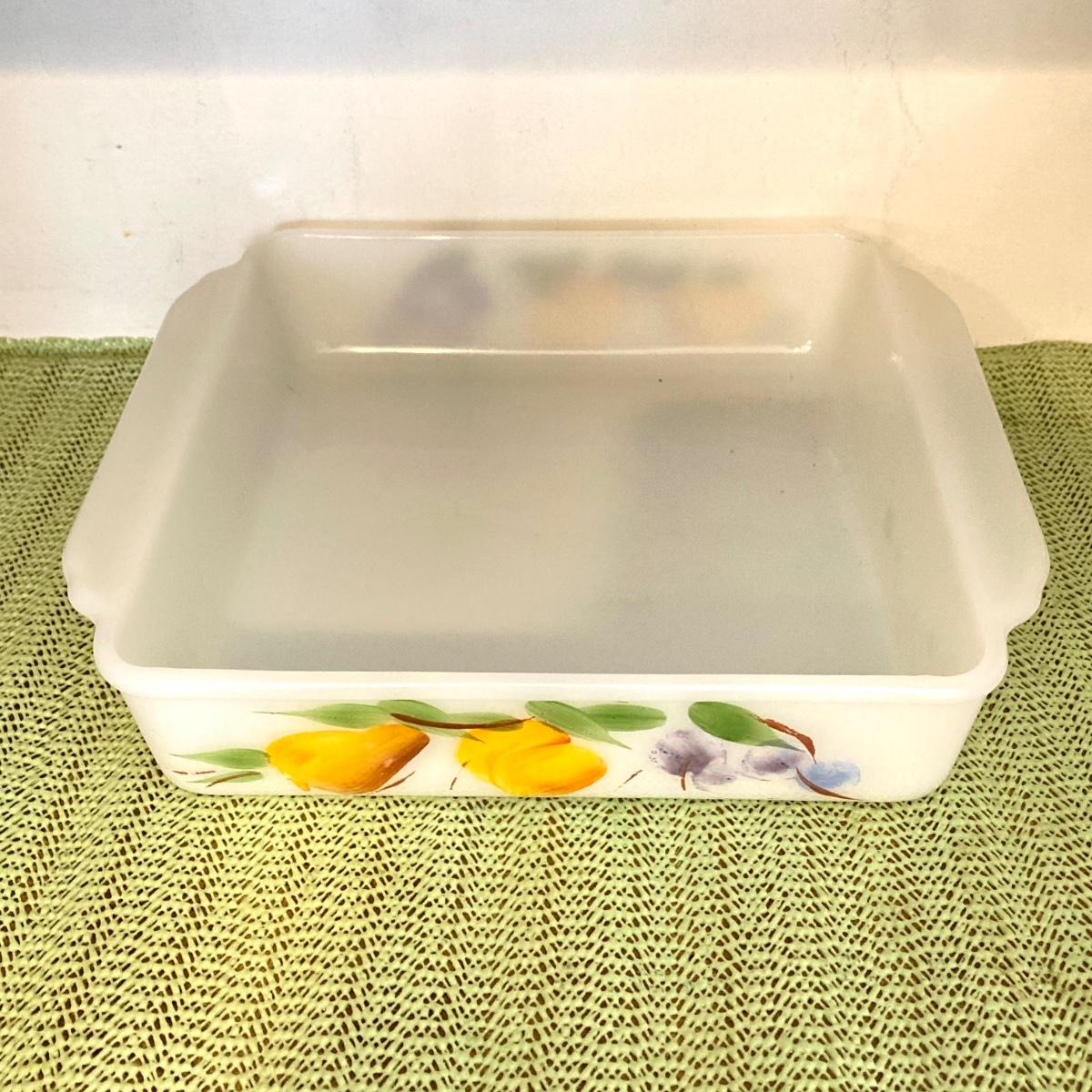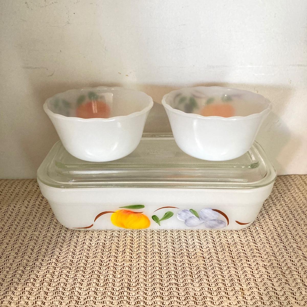 LOT 66: Vintage Fire King Oven Ware Milk Glass Pear Peach Grapes Set with Cookbooks, Towels and More