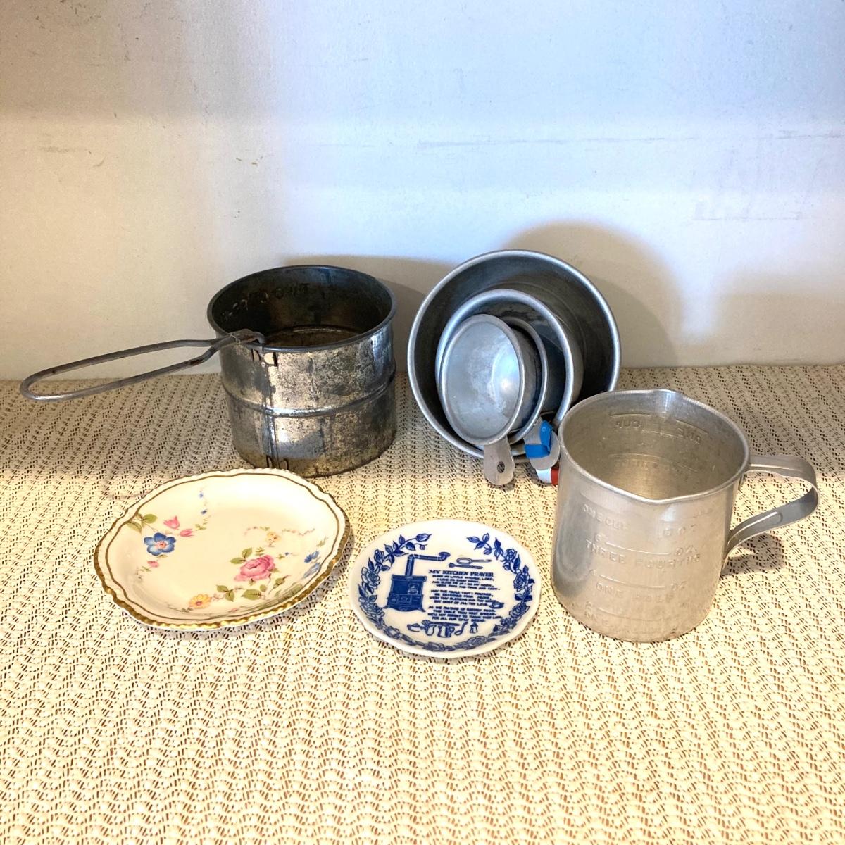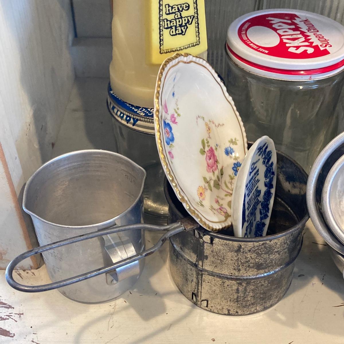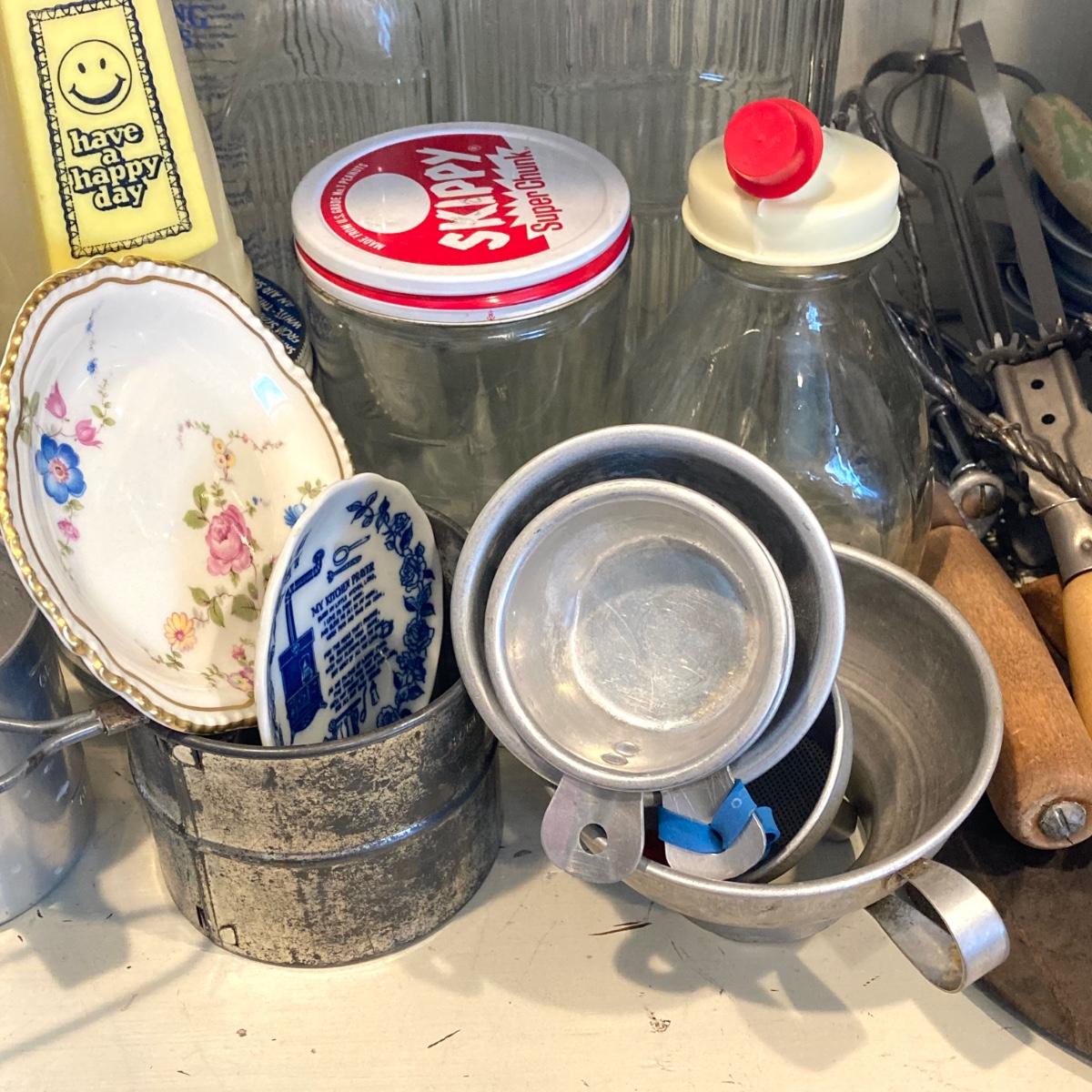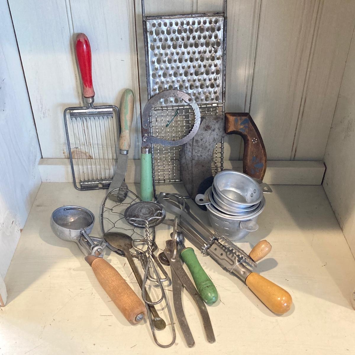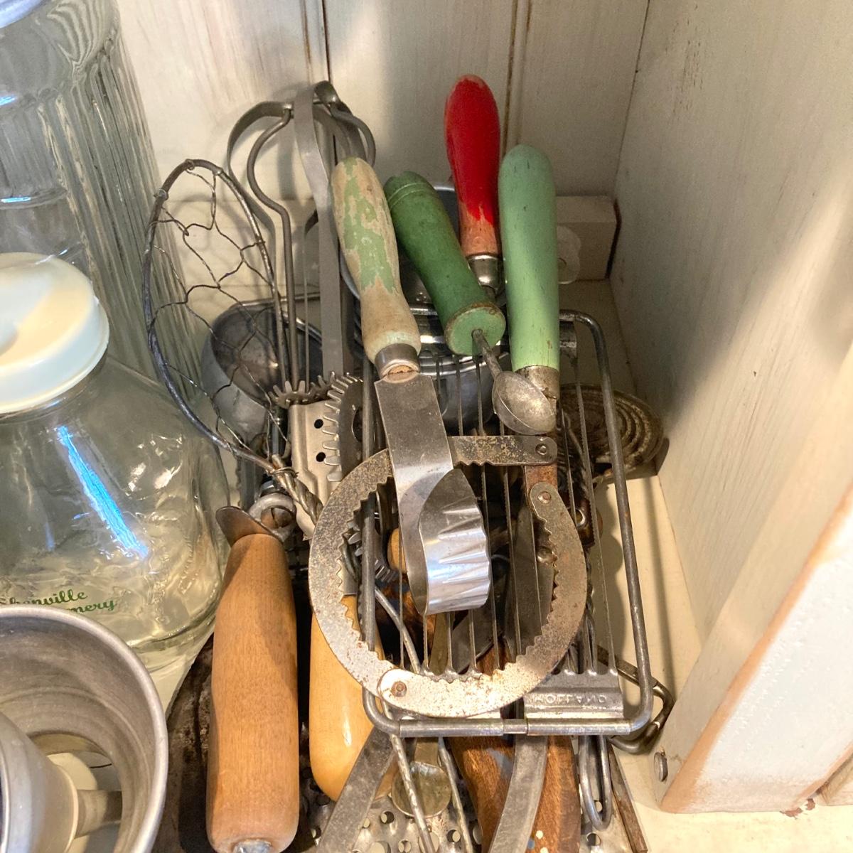 LOT 67: Vintage / Antique Kitchen Gadgets - Have a Happy Day Whirley Industries Cow, Dairy Bottles, Utensils, Glass Containers and More