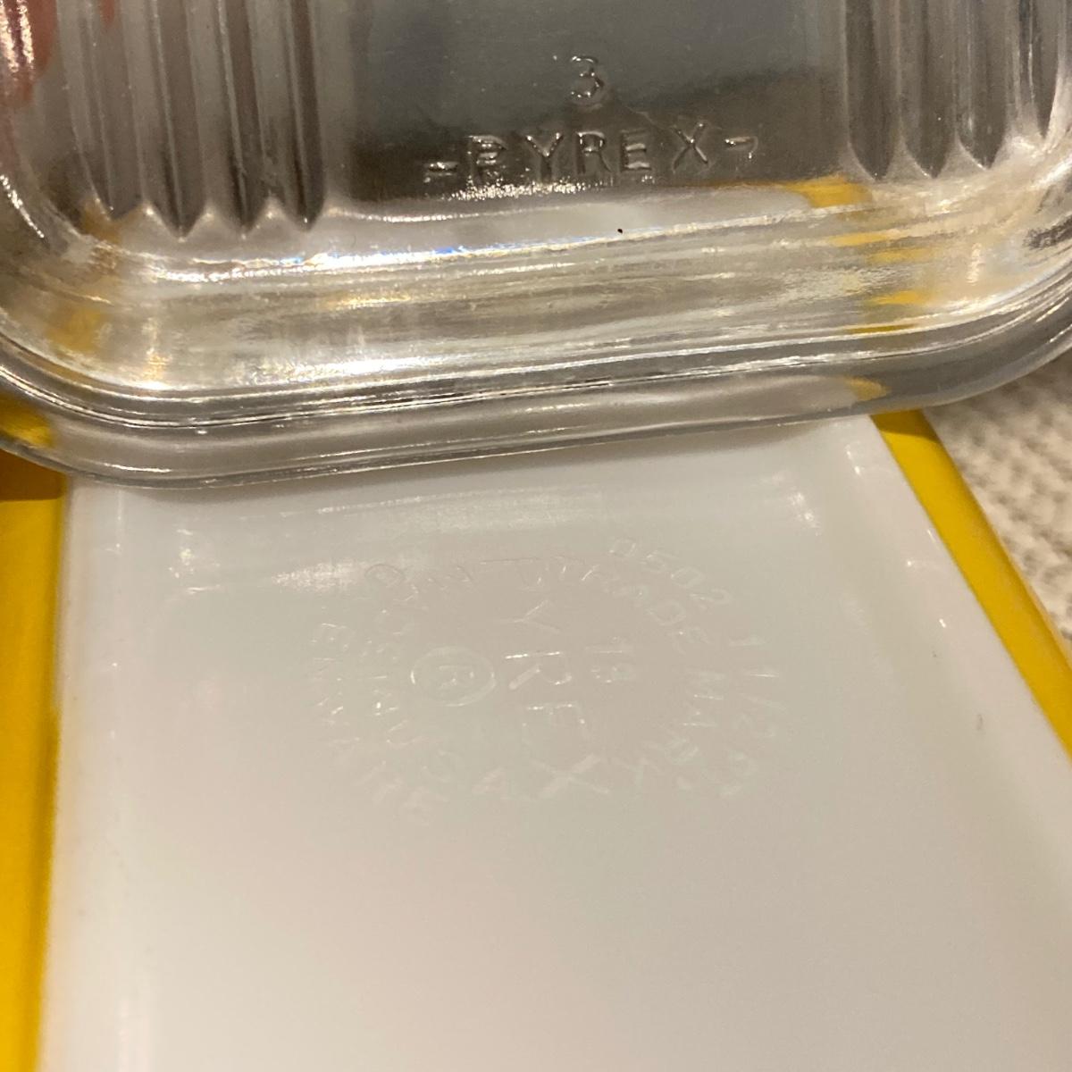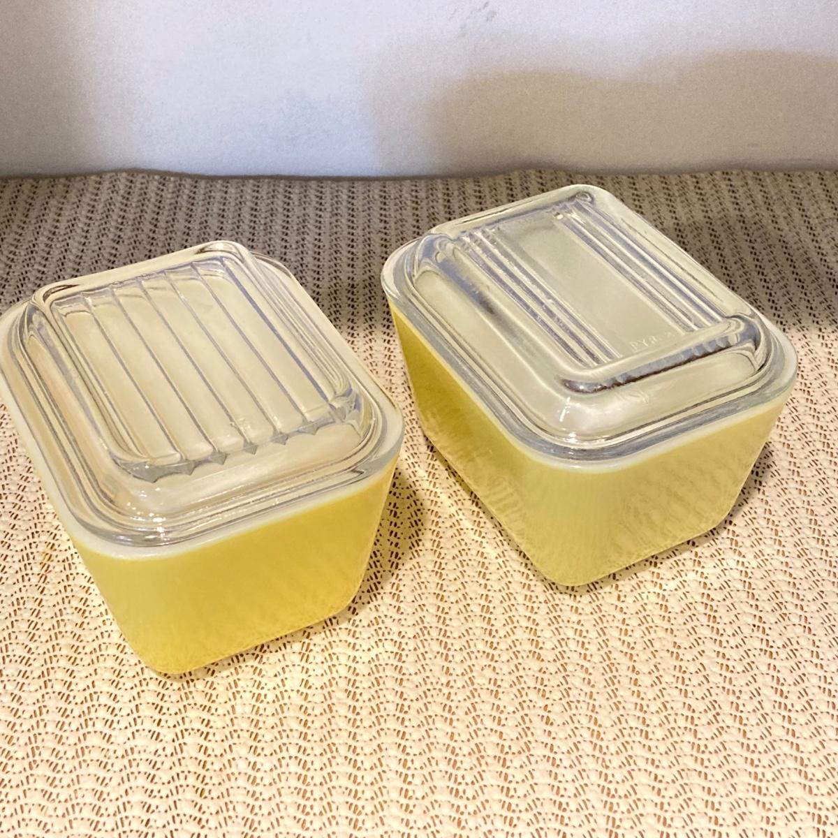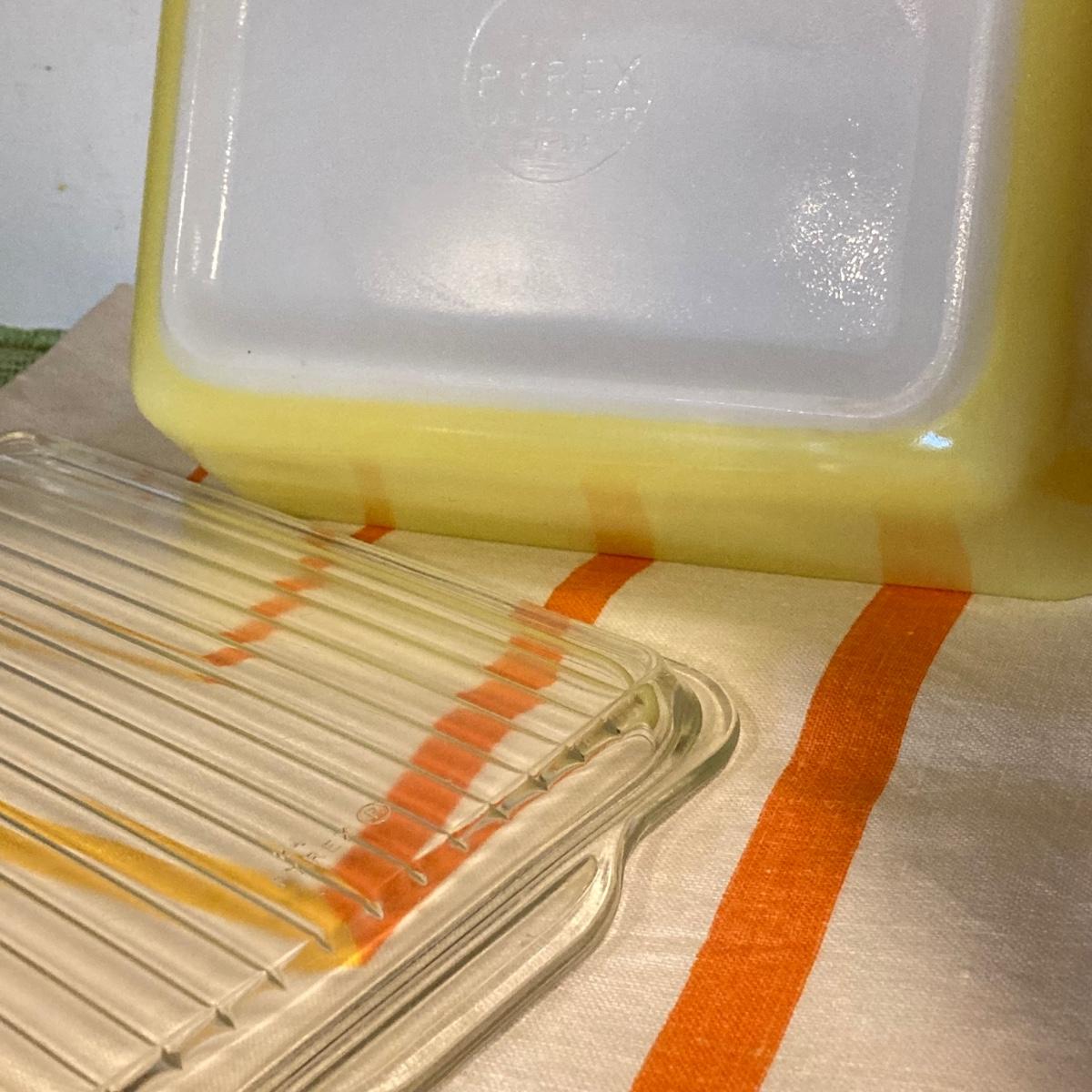 LOT 70: Vintage Pyrex Yellow Refrigerator Dishes with Lids, Cook Books, Tablecloth and Crocheted Pot Holders