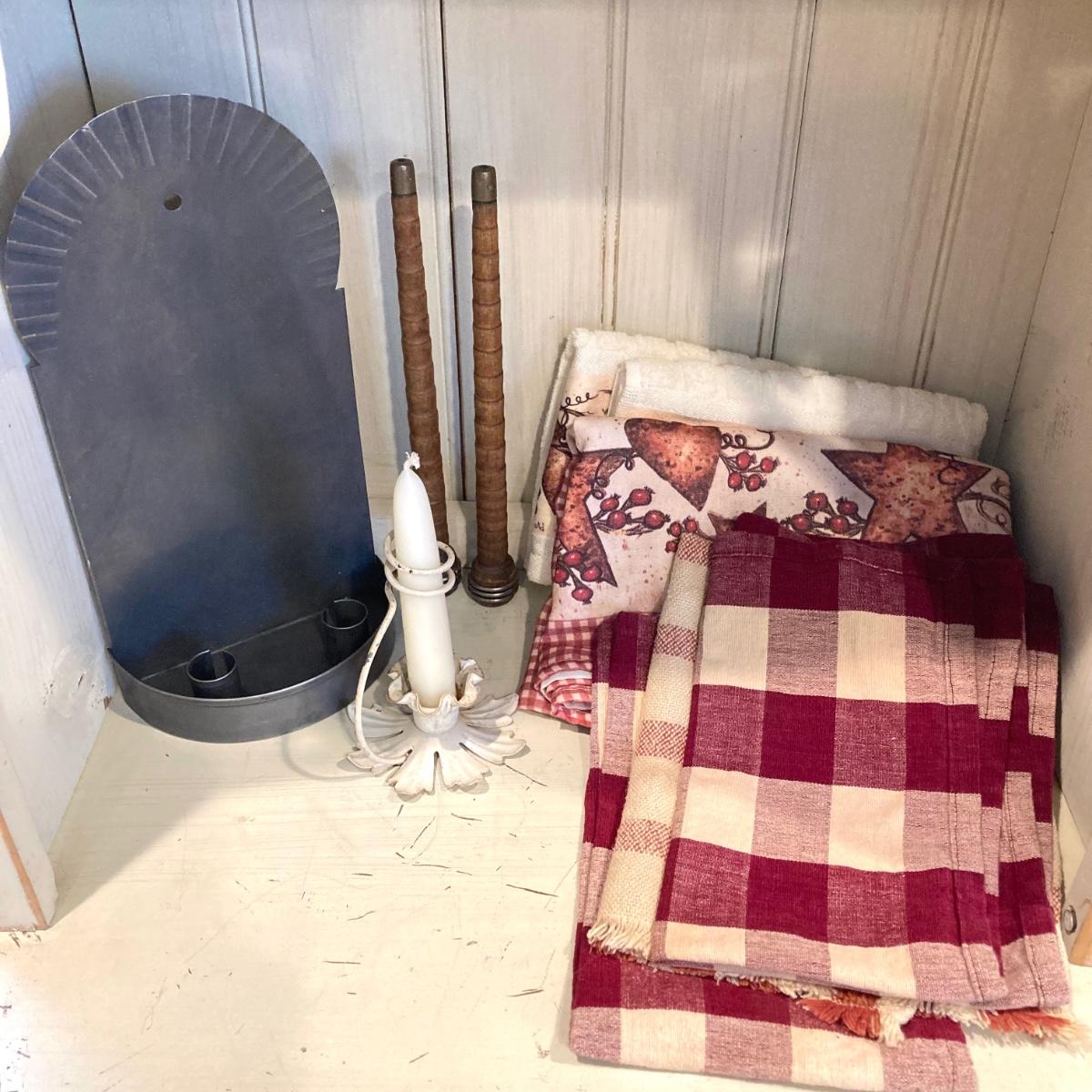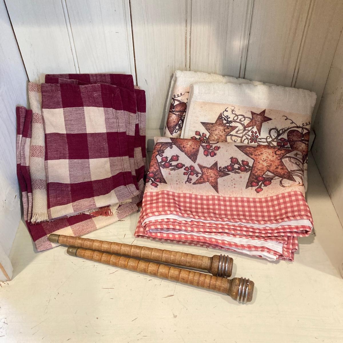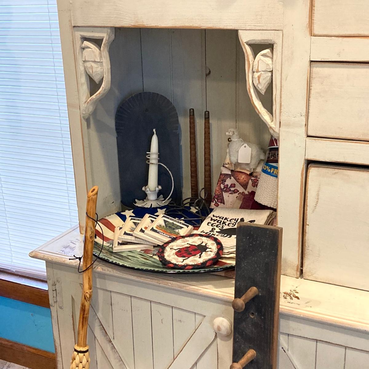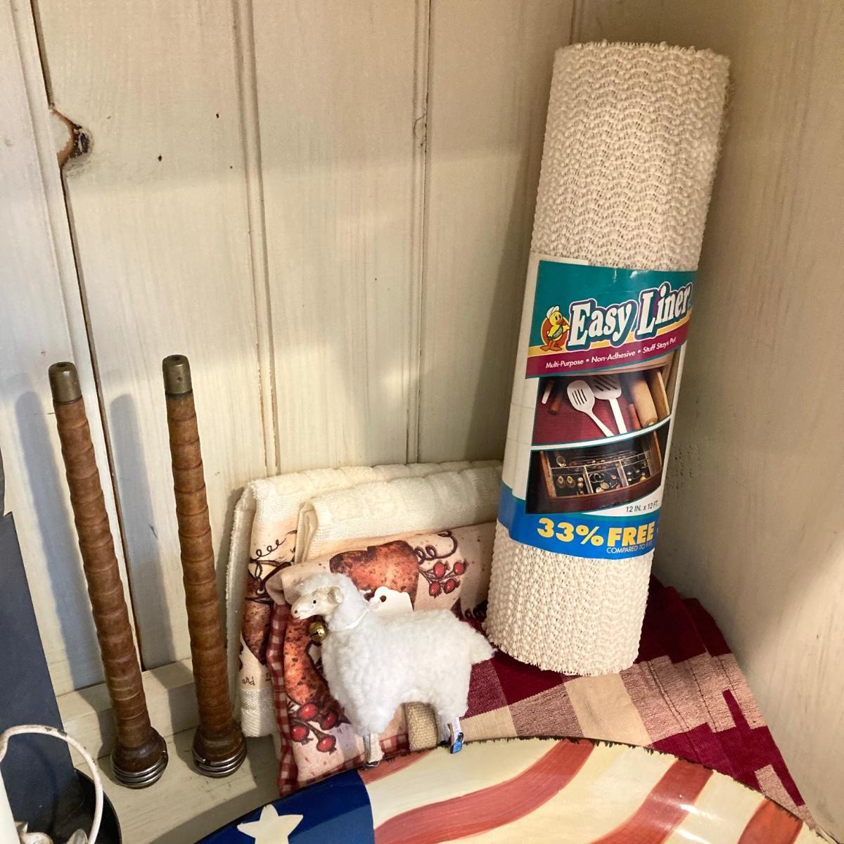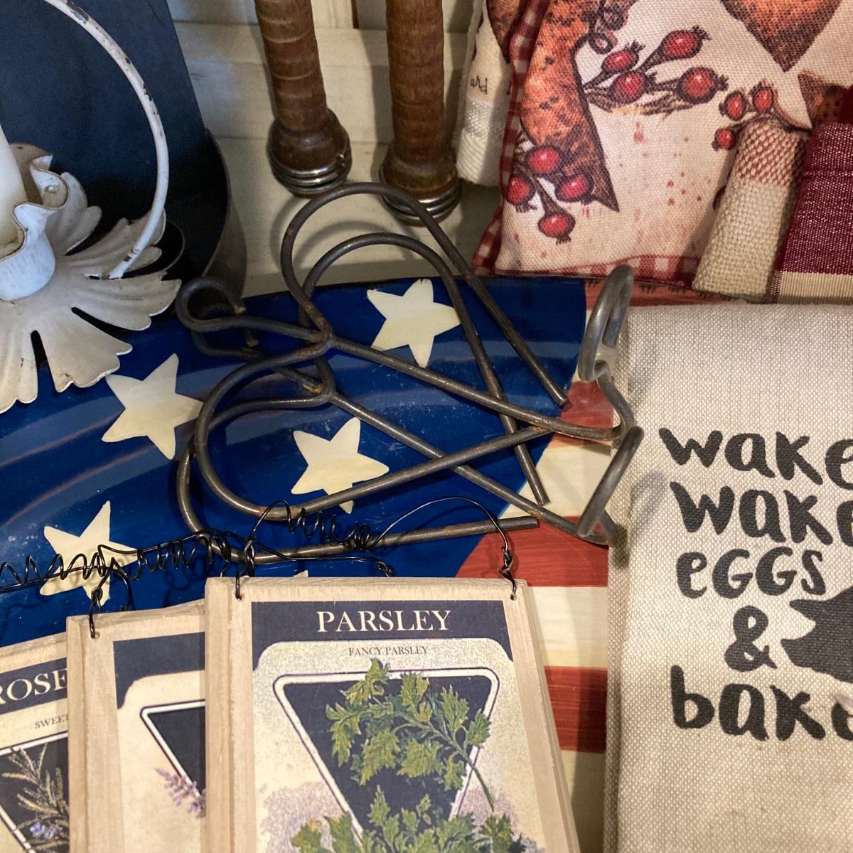LOT 73: Large Vintage Home Decor Collection - Longaberger Handmade Basket, Wooden Spools, Lillian Vernon Americana Serving Plate and Much More