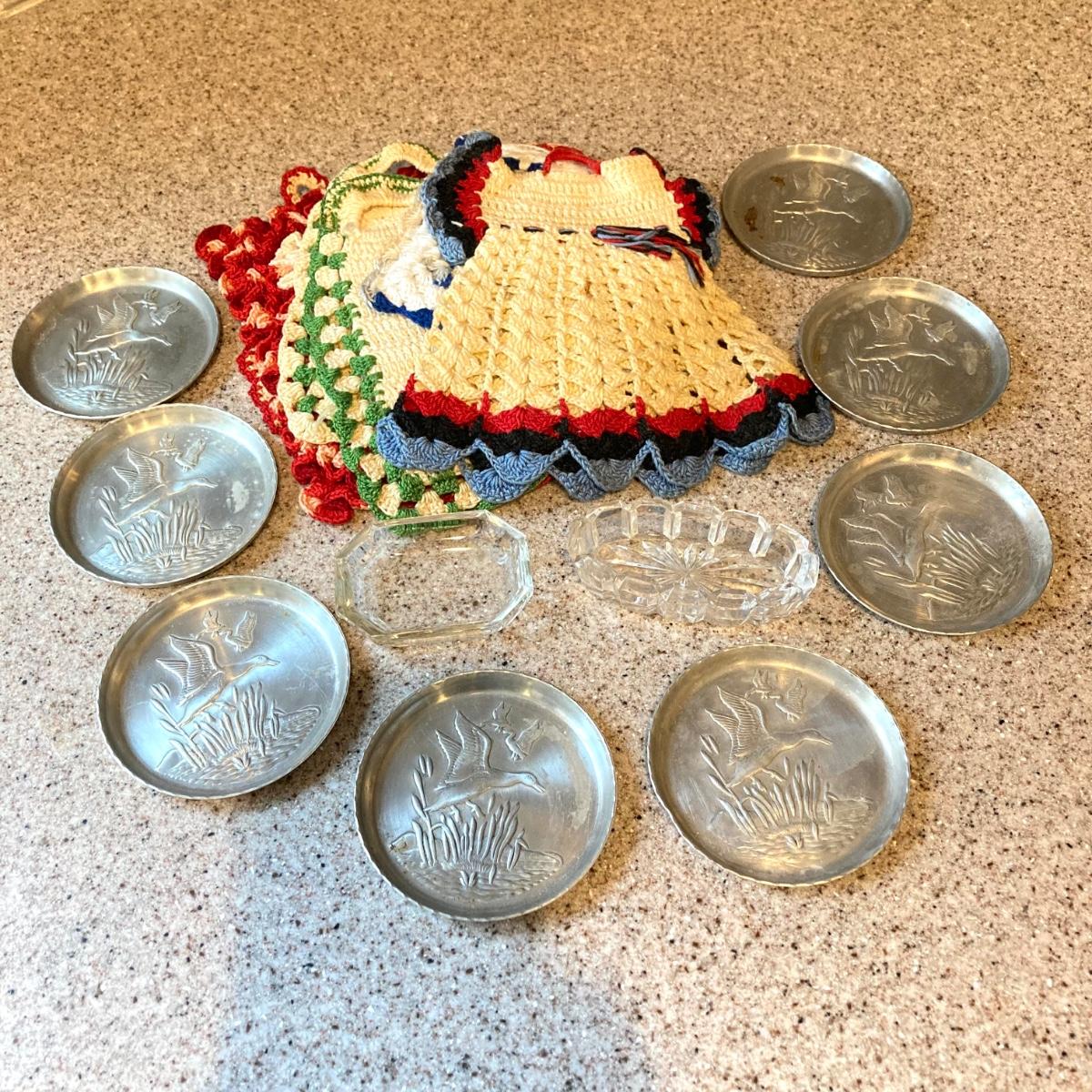 LOT 78: Vintage / Antique Kitchen Pots, Utensils / Gadgets, Crocheted Pot Holders and More