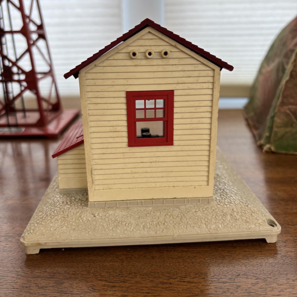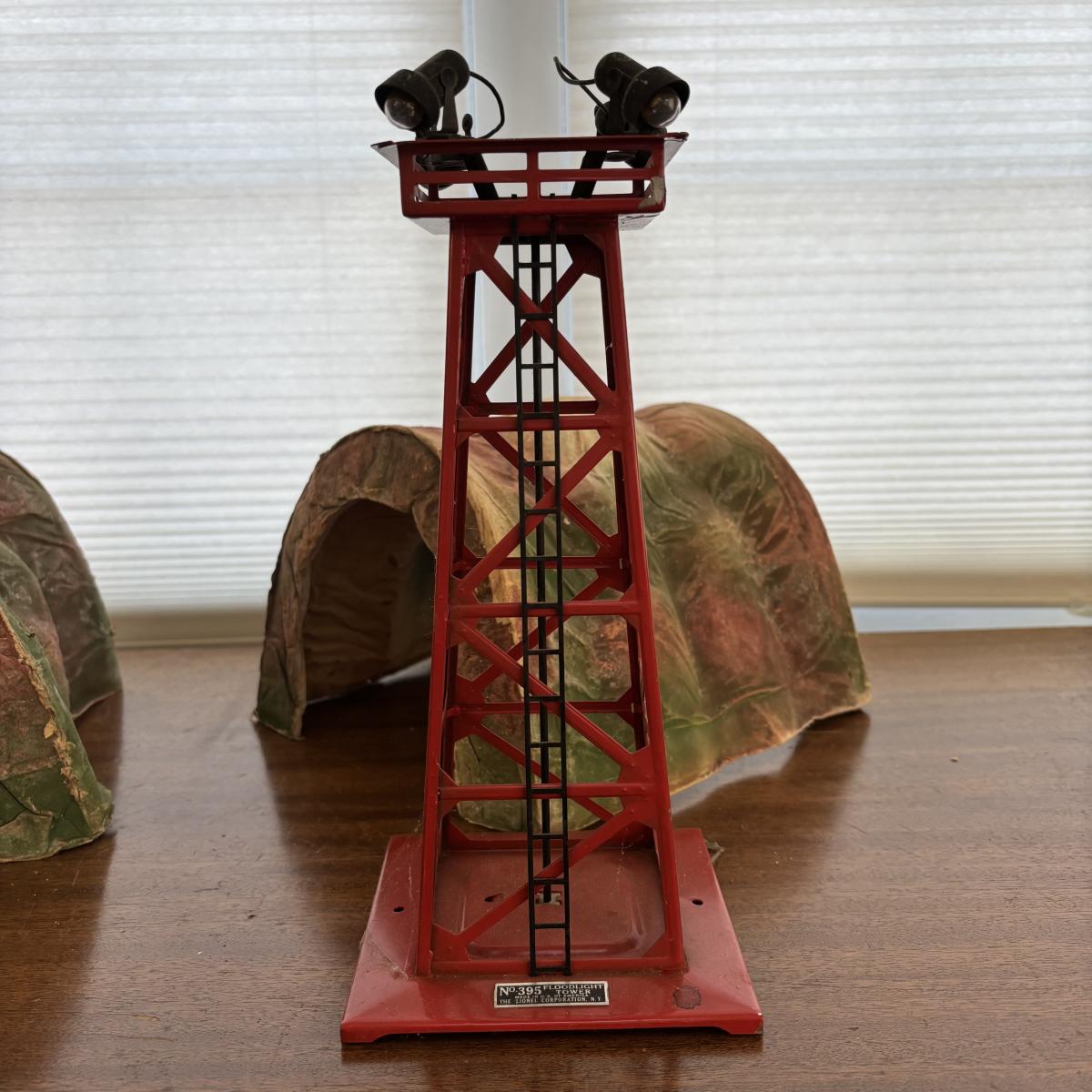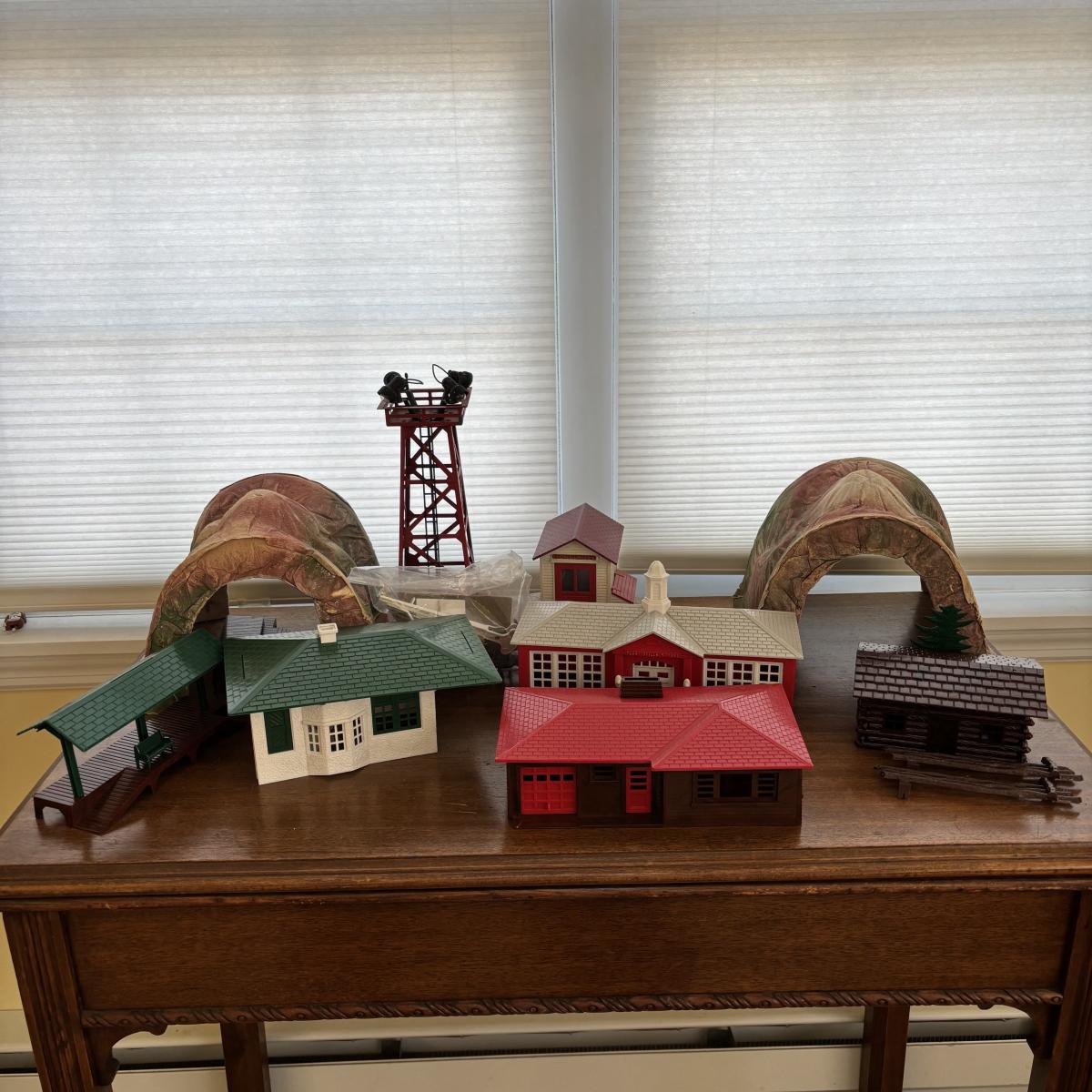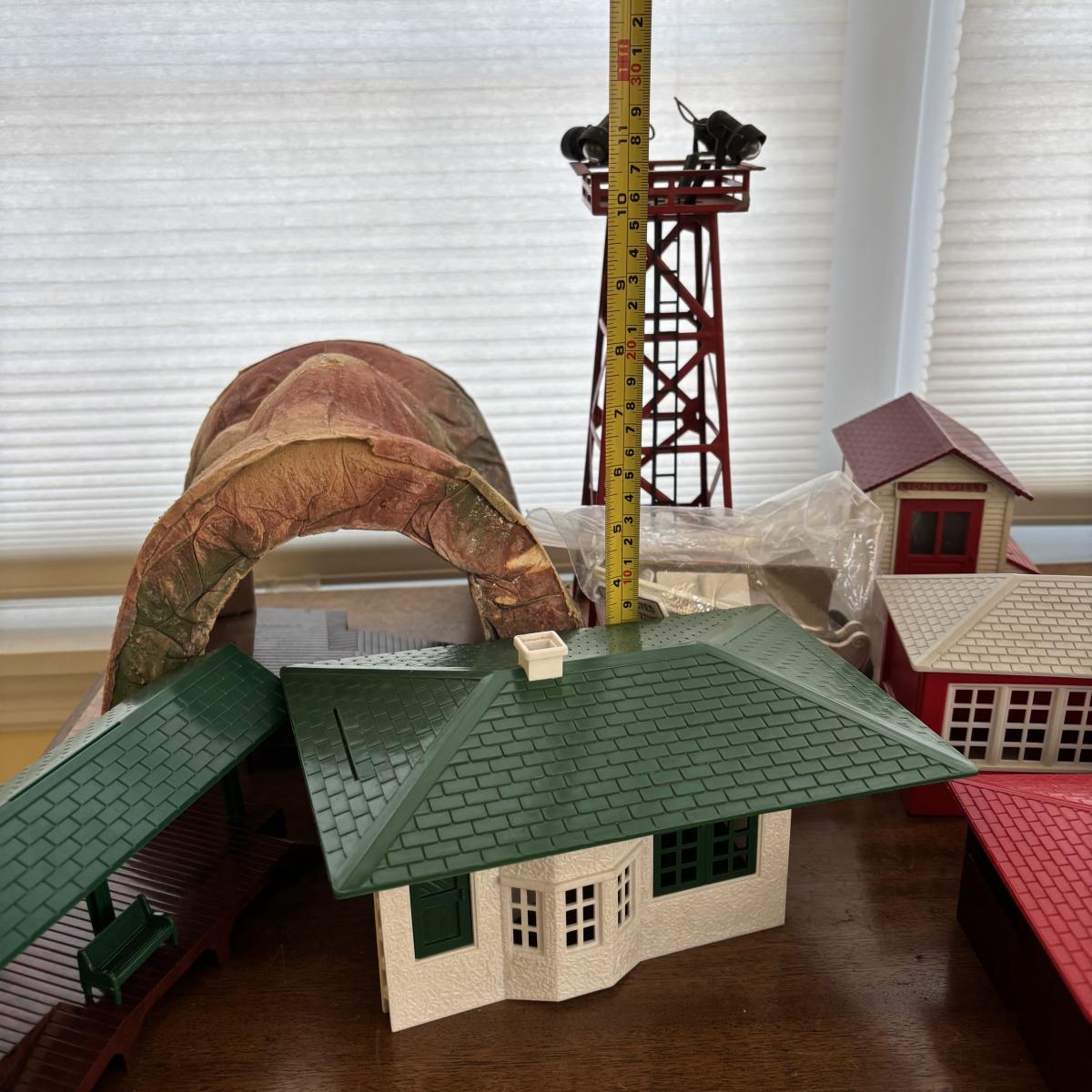 LOT 86: Vintage Plasticville Houses, Paper Mache Train Tunnels, Lionel Whistle Station, Lionel No.395 Flood Light Tower and Accessories