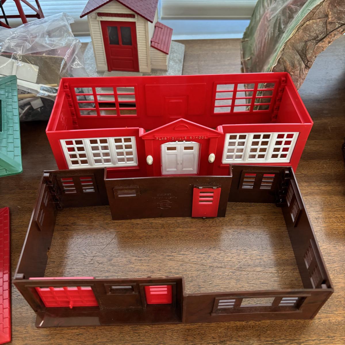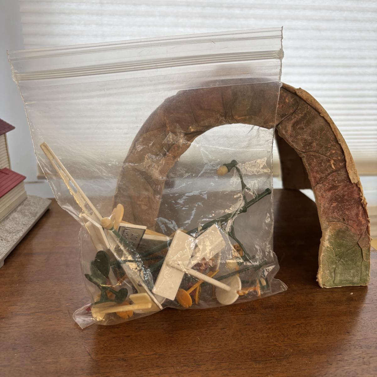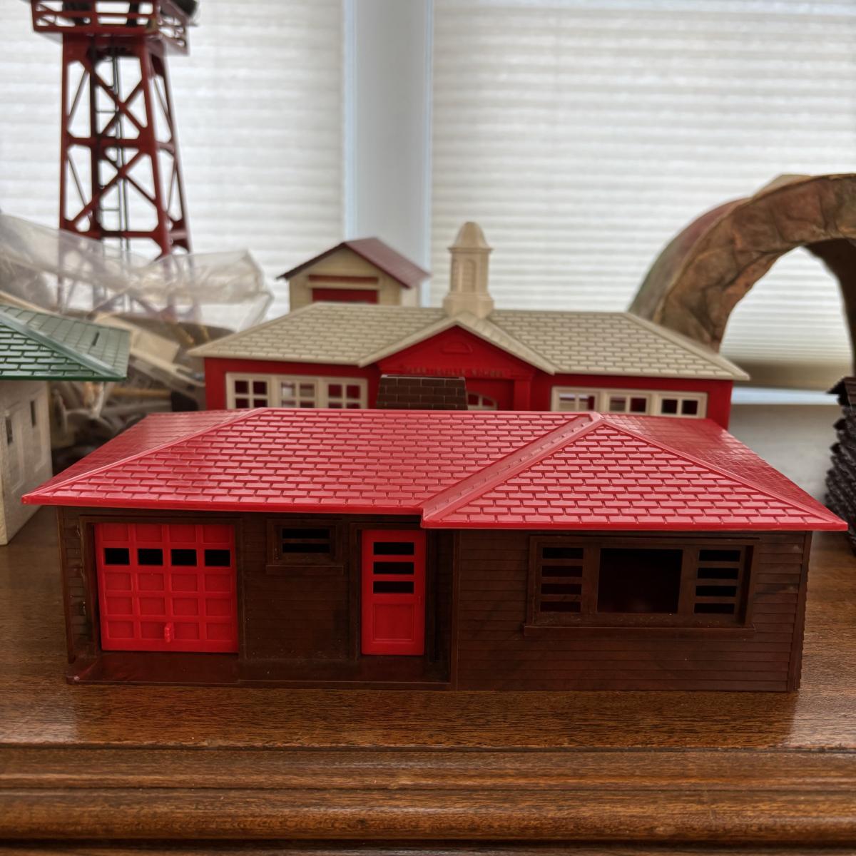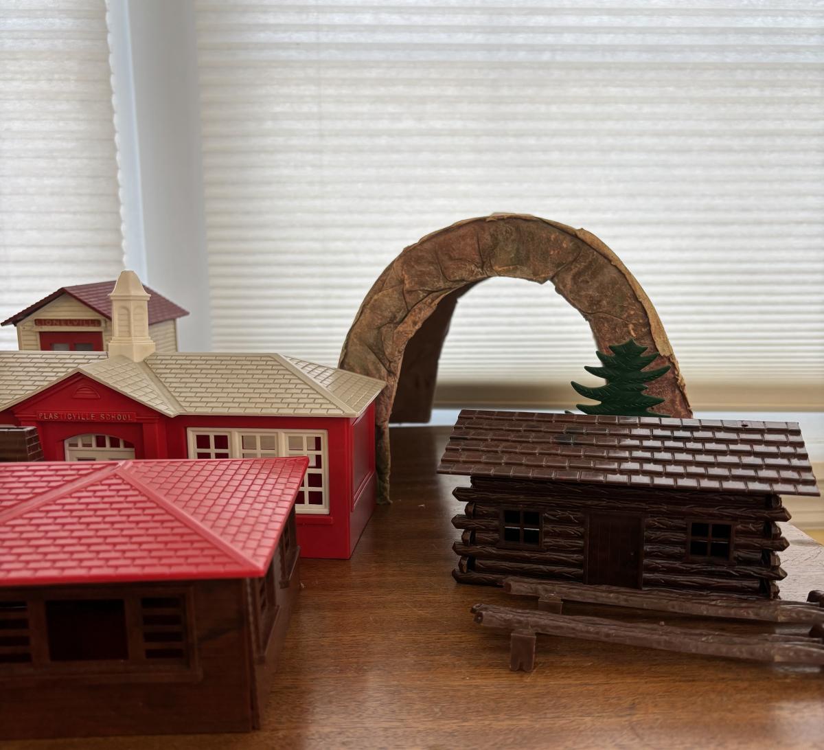 LOT 86: Vintage Plasticville Houses, Paper Mache Train Tunnels, Lionel Whistle Station, Lionel No.395 Flood Light Tower and Accessories