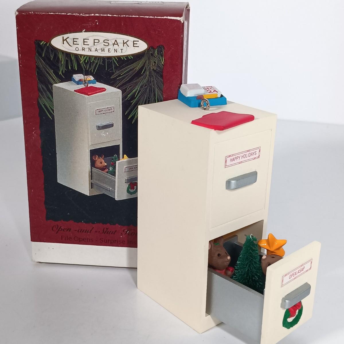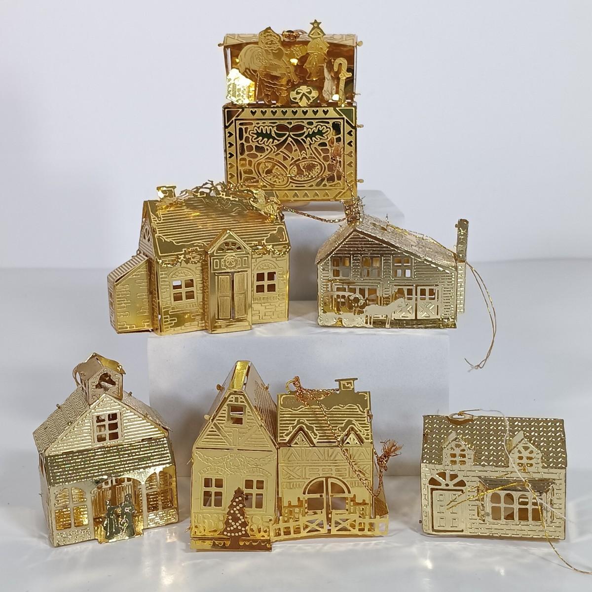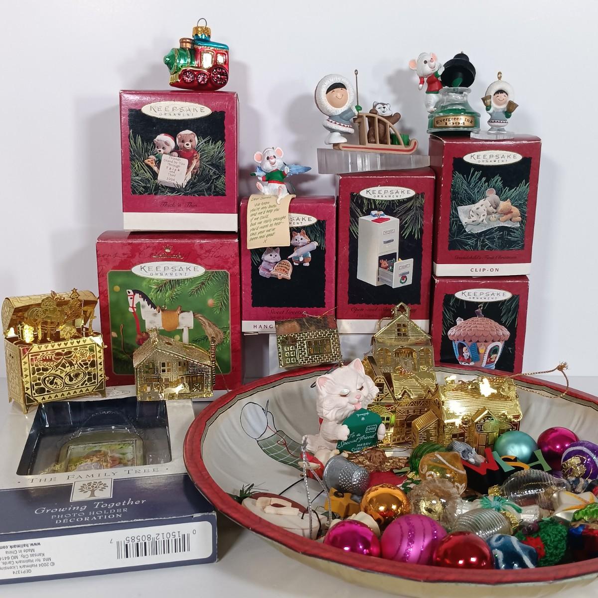 LOT 113: Hallmark Christmas Ornaments with a Collection of Miniature Ornaments & Gold-Tone Metal House Ornaments
