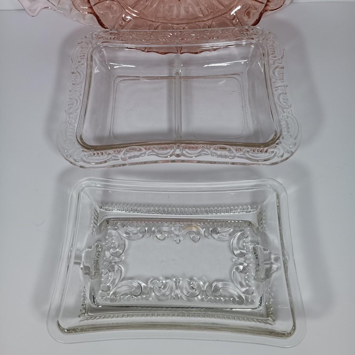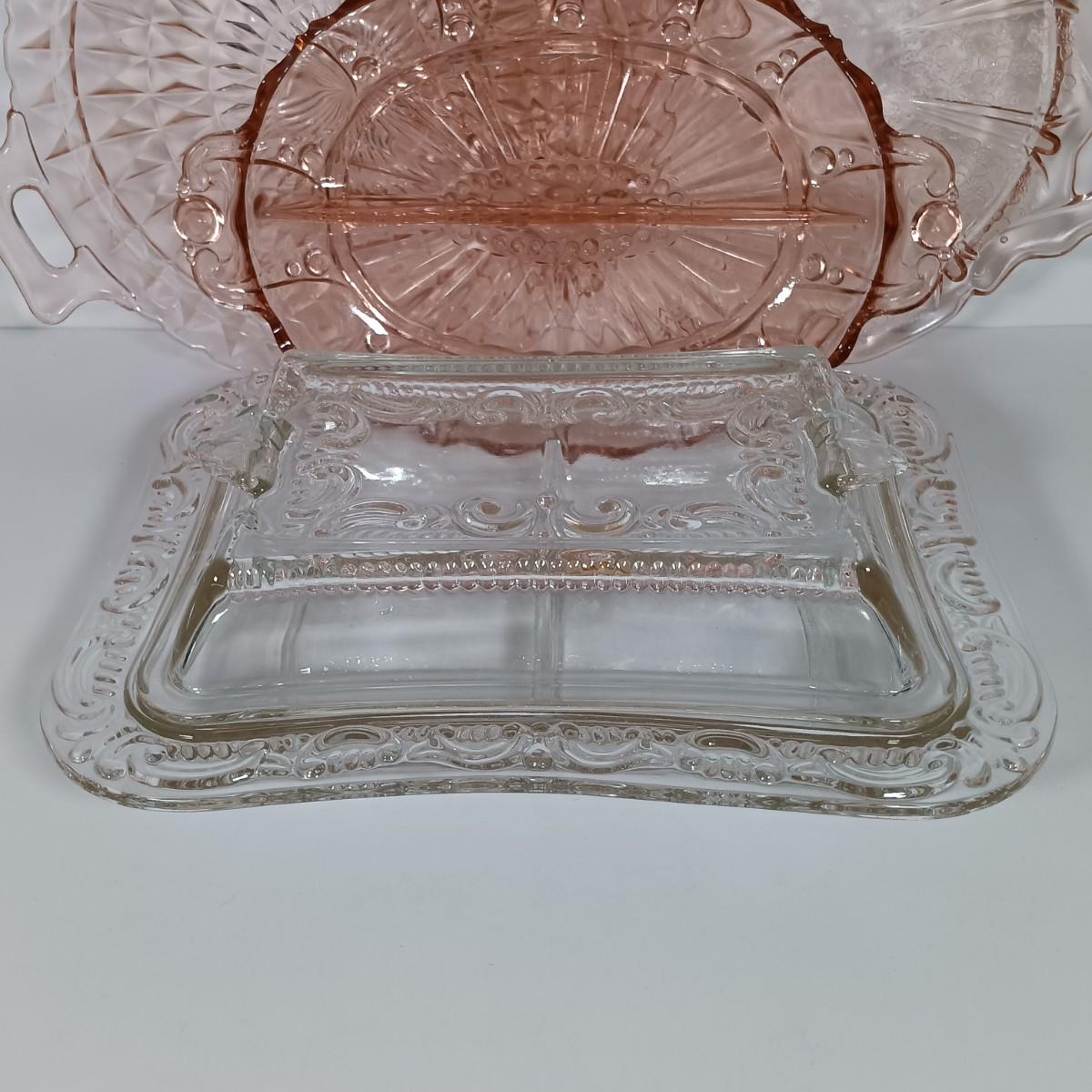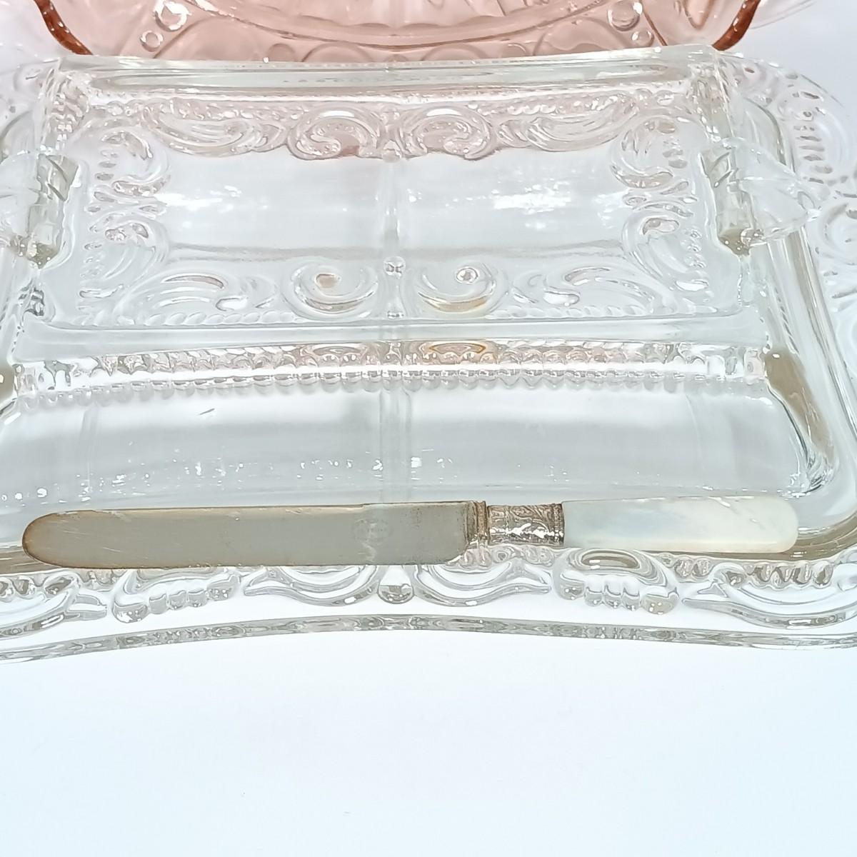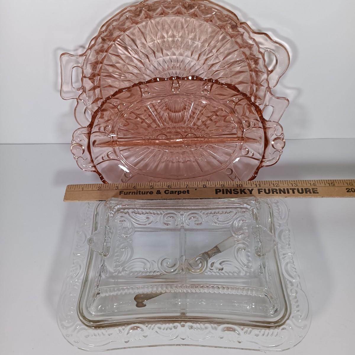 LOT 122: Pink Depression Glass Serving Dishes with Mother of Pearl Knife & Pressed Clear Glass Dish