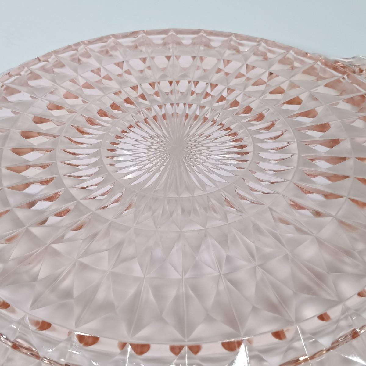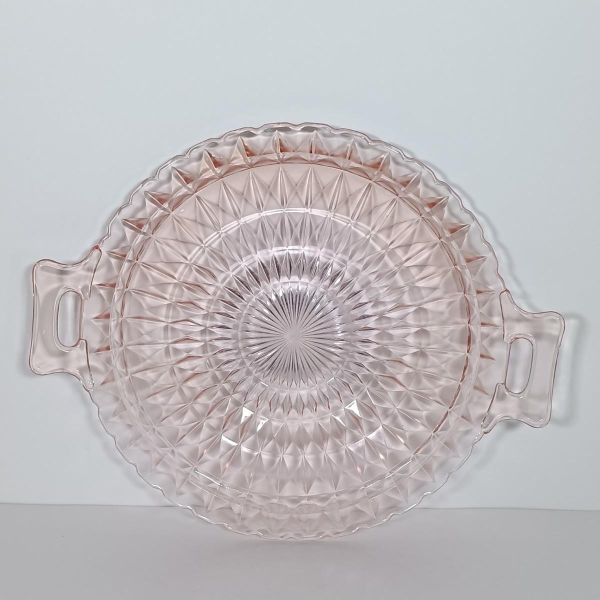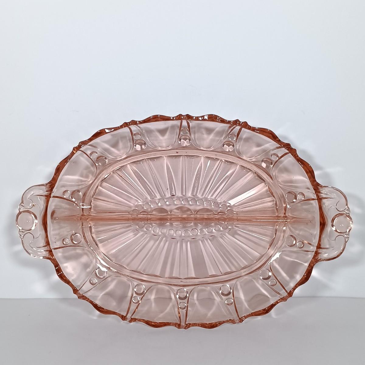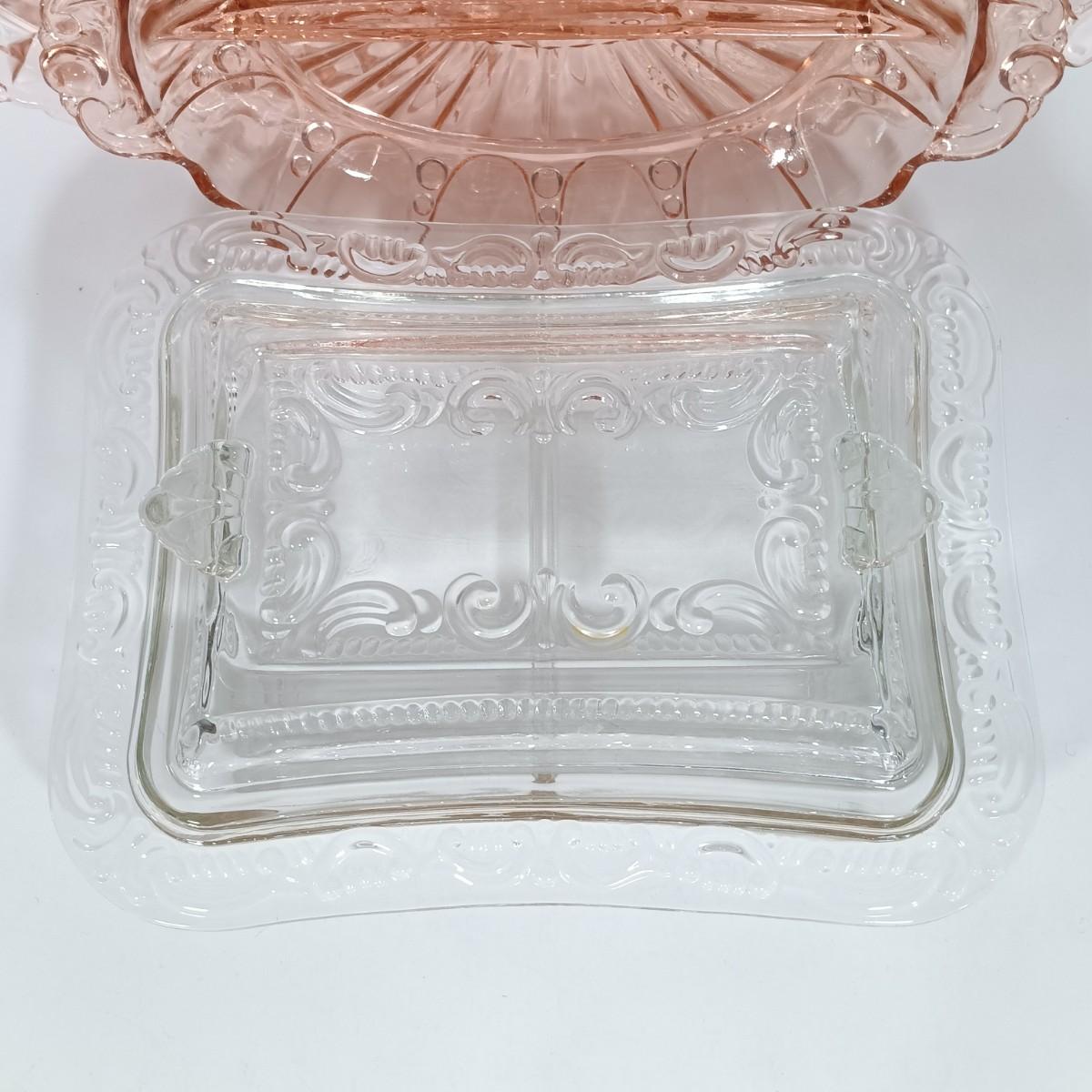 LOT 122: Pink Depression Glass Serving Dishes with Mother of Pearl Knife & Pressed Clear Glass Dish