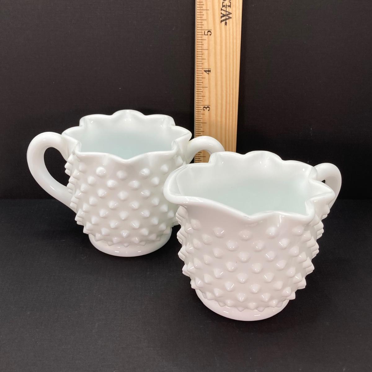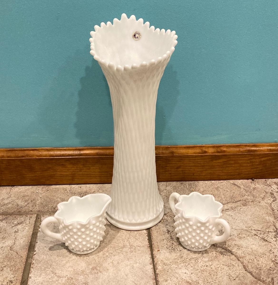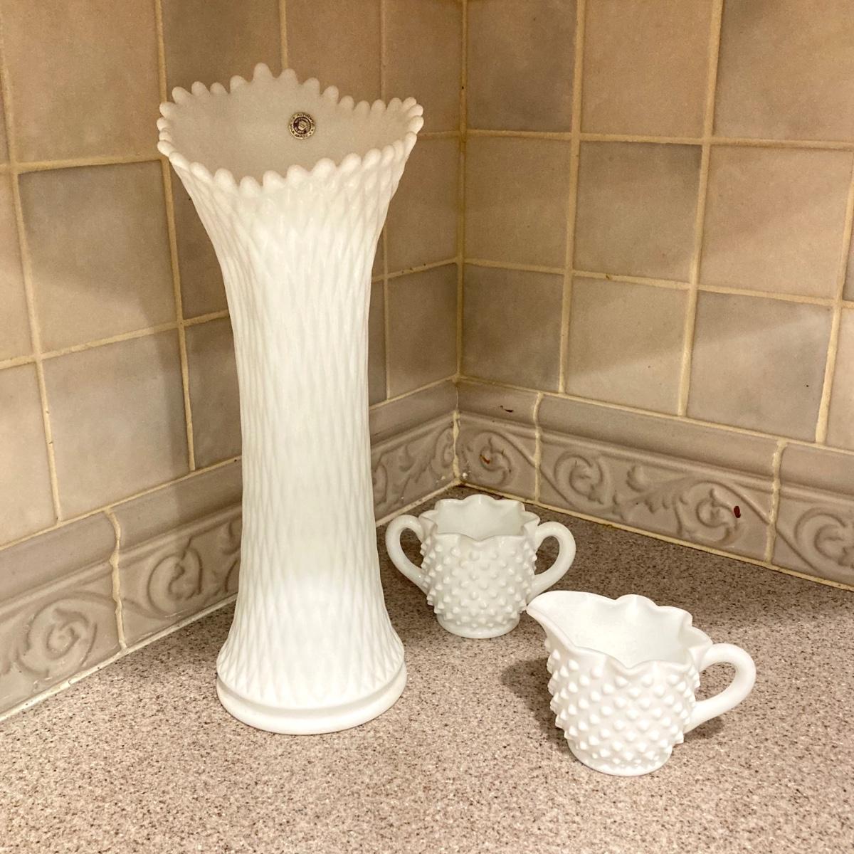 LOT 164: Westmoreland Milk Glass Vase with Small Hobnail Milk Glass Cream and Sugar Bowls