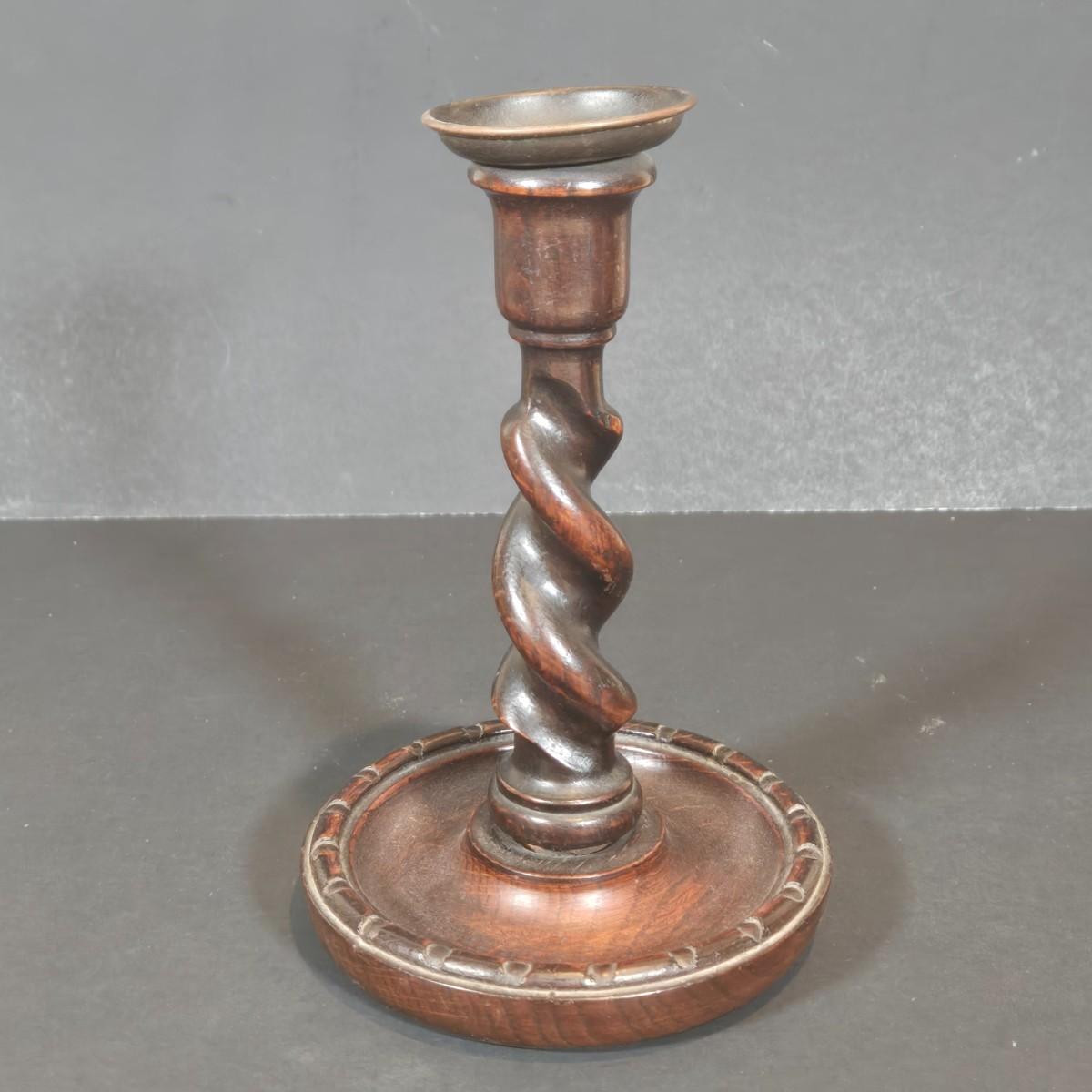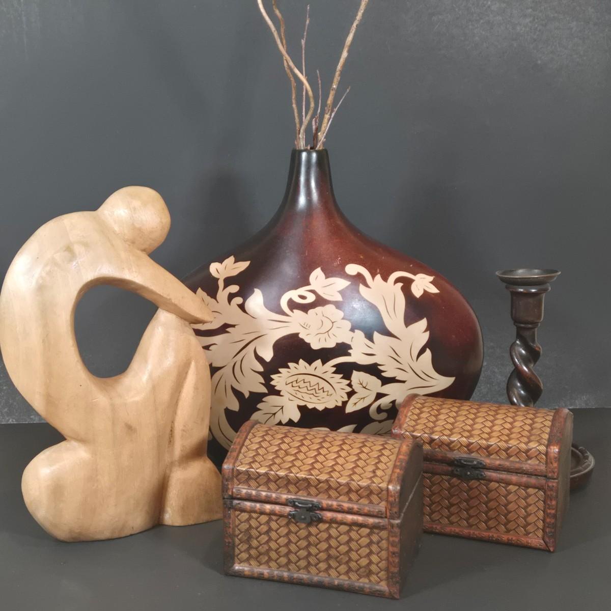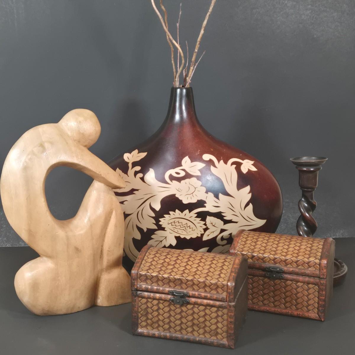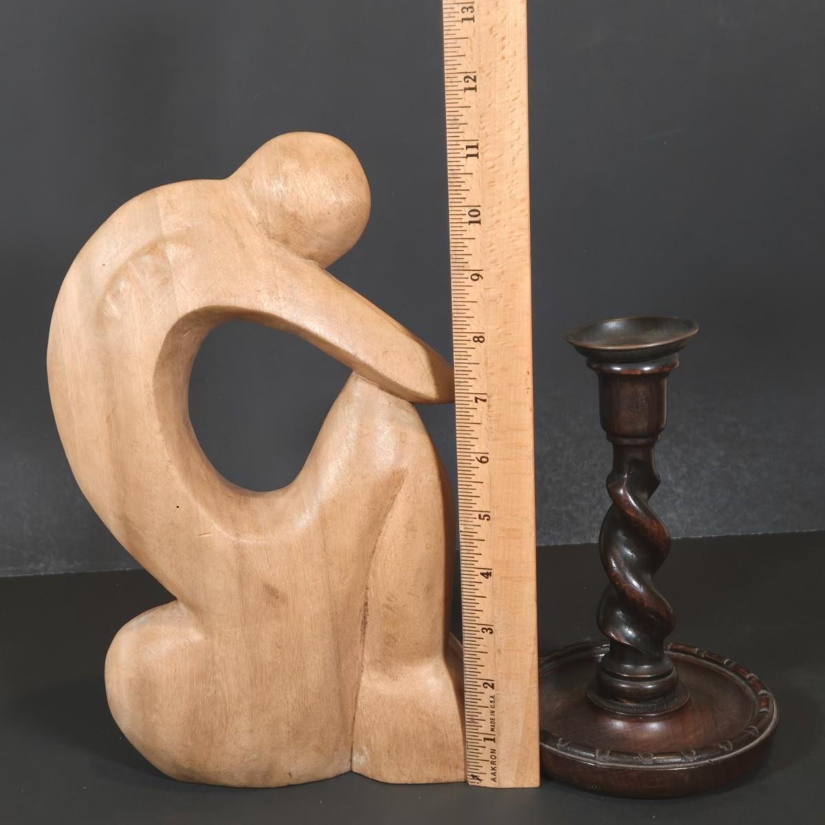 LOT 205B: Vase Made from a Gourd, Carved Wooden Figure, Wooden Barley Twist Candle Stick Holder, and More