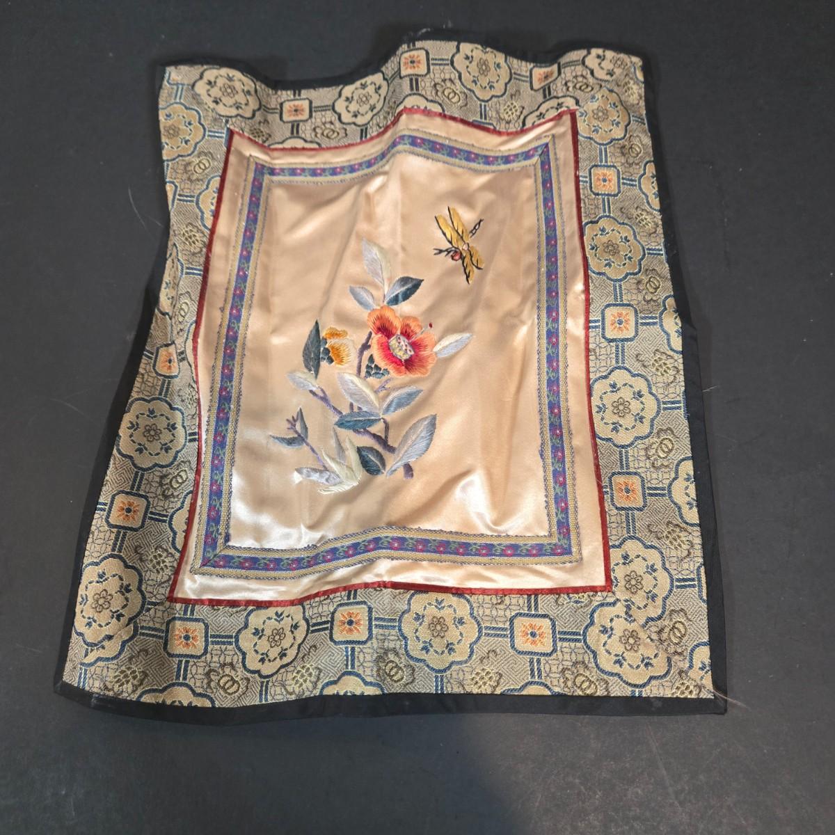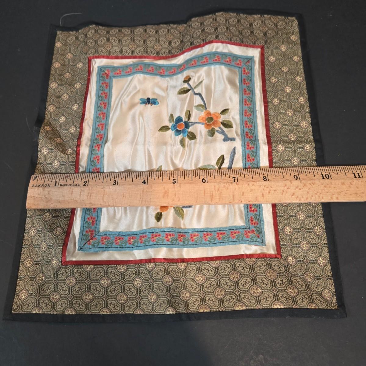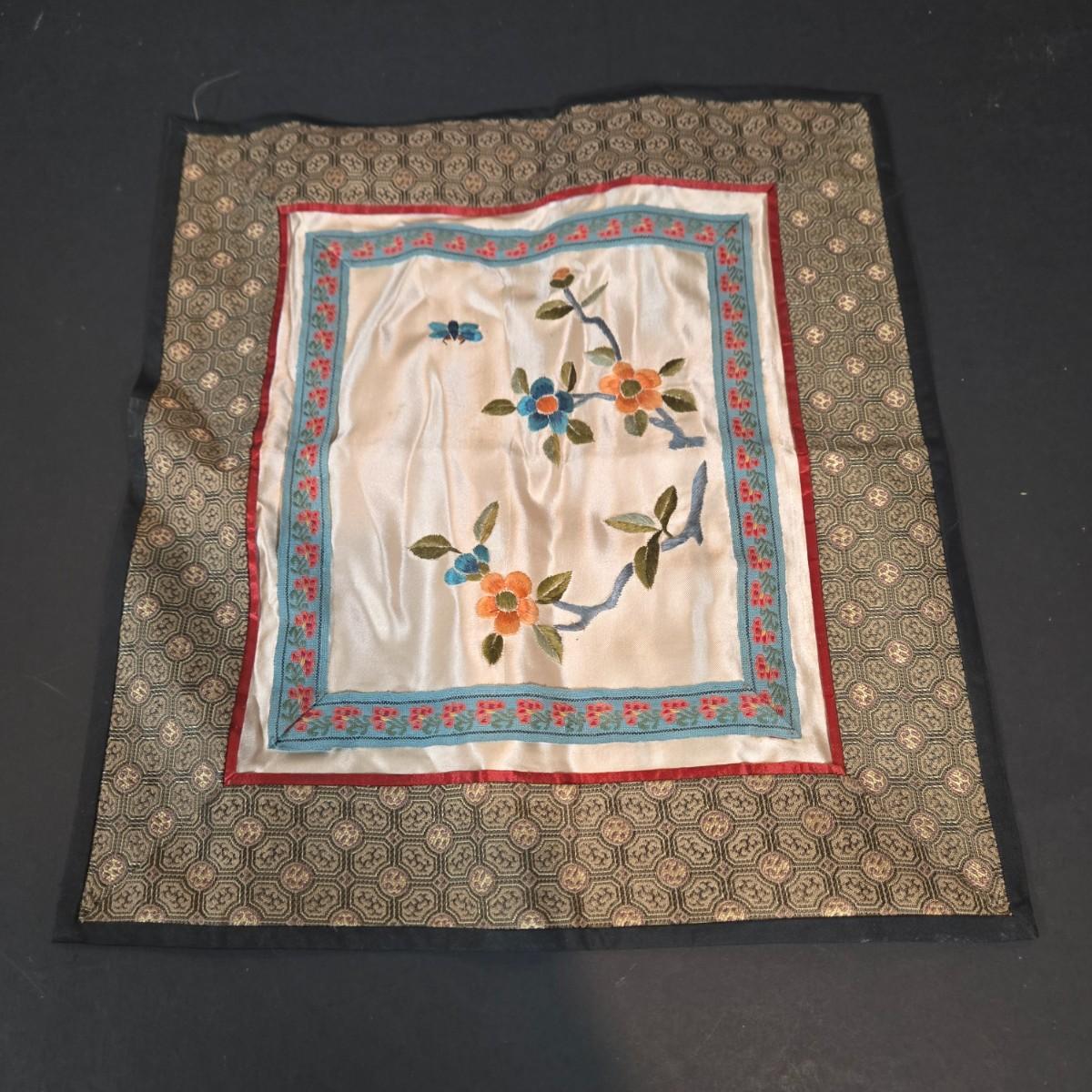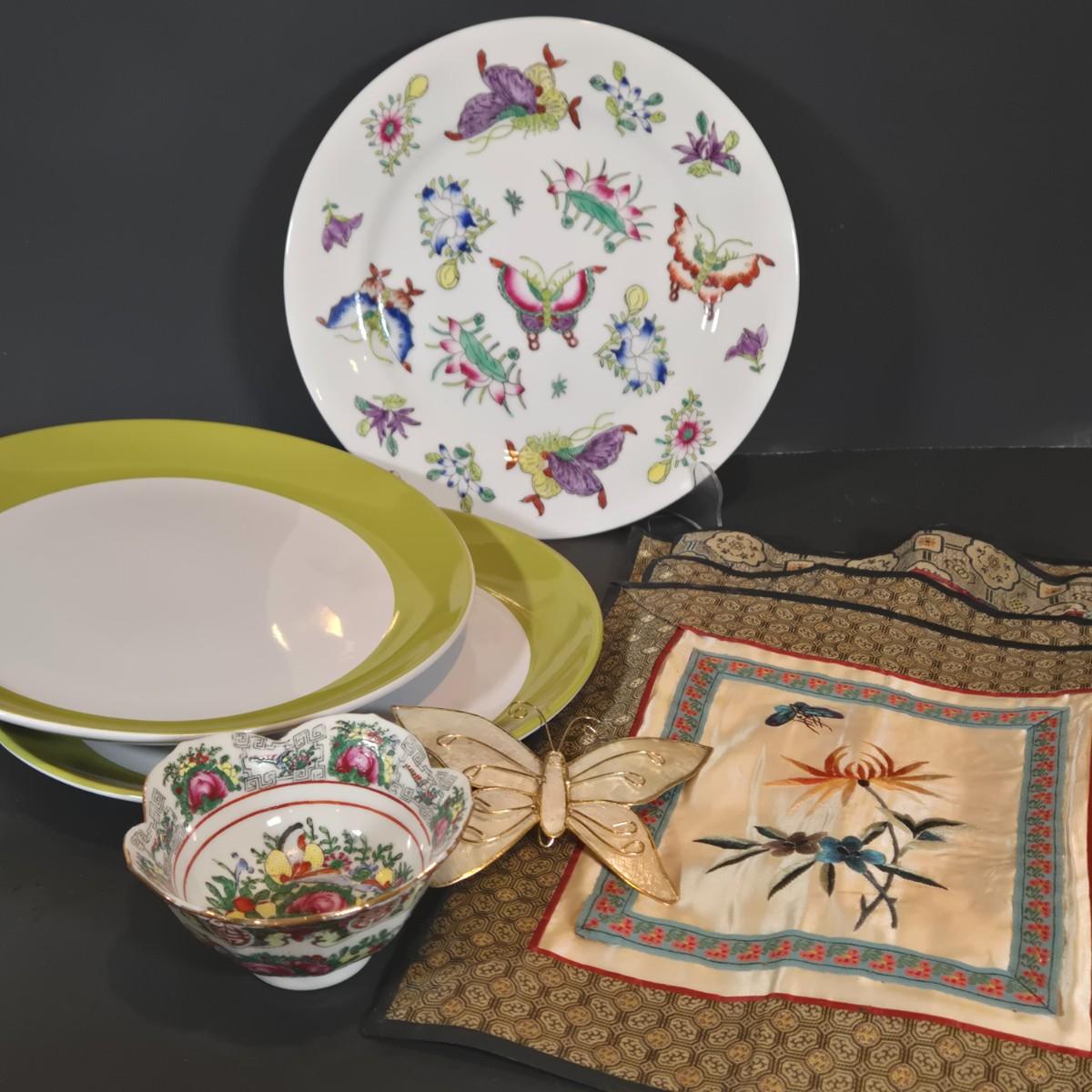 LOT 216B: Asian Style Butterfly Dish, Small Bowl, Embroidered Silk Panels, and More