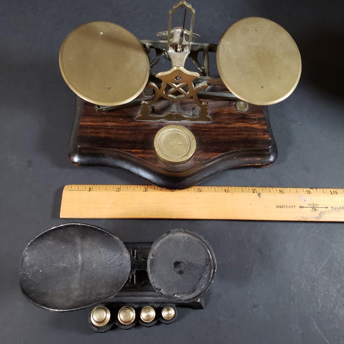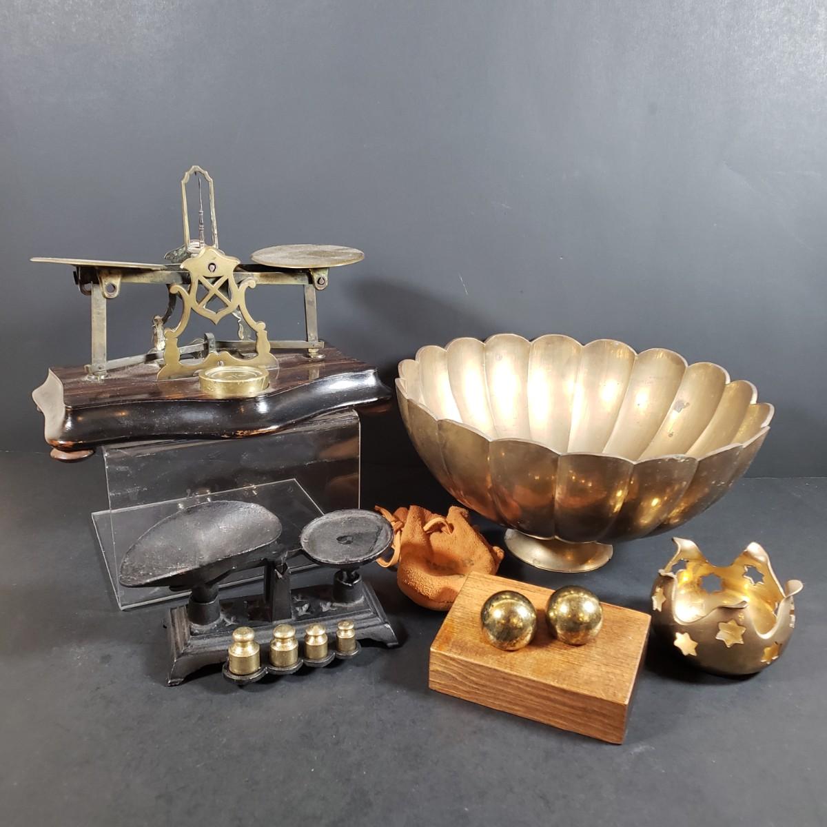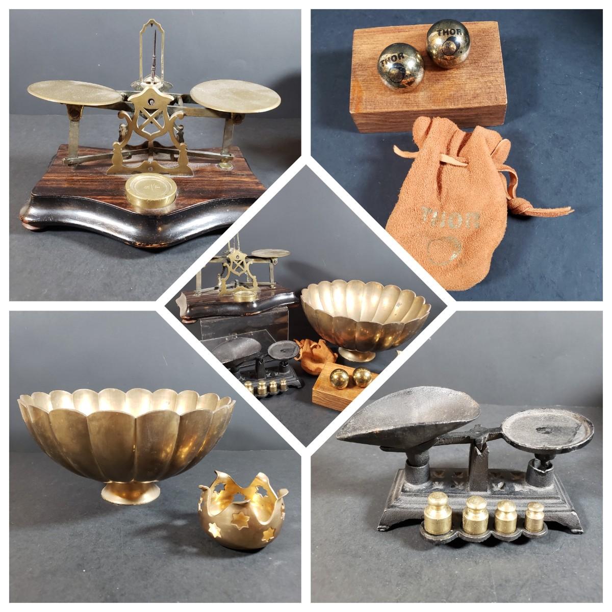 LOT 318B: Vintage Brass & Cast Iron Scales, Brass Table Decor & More
