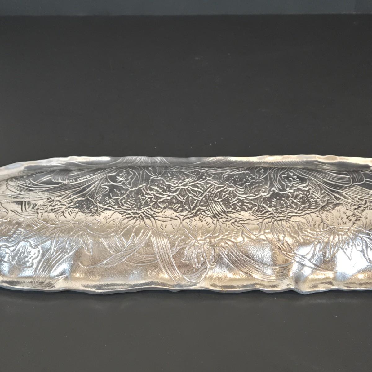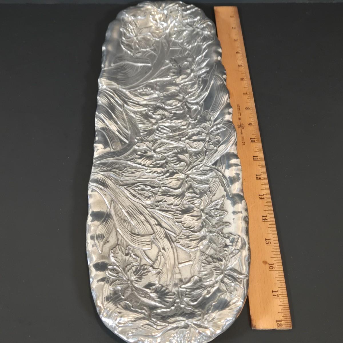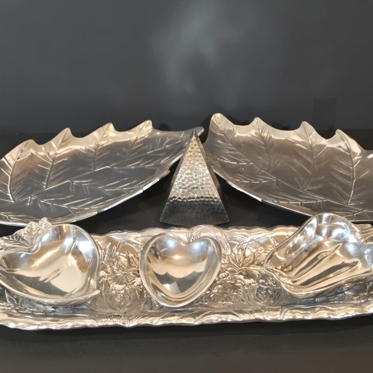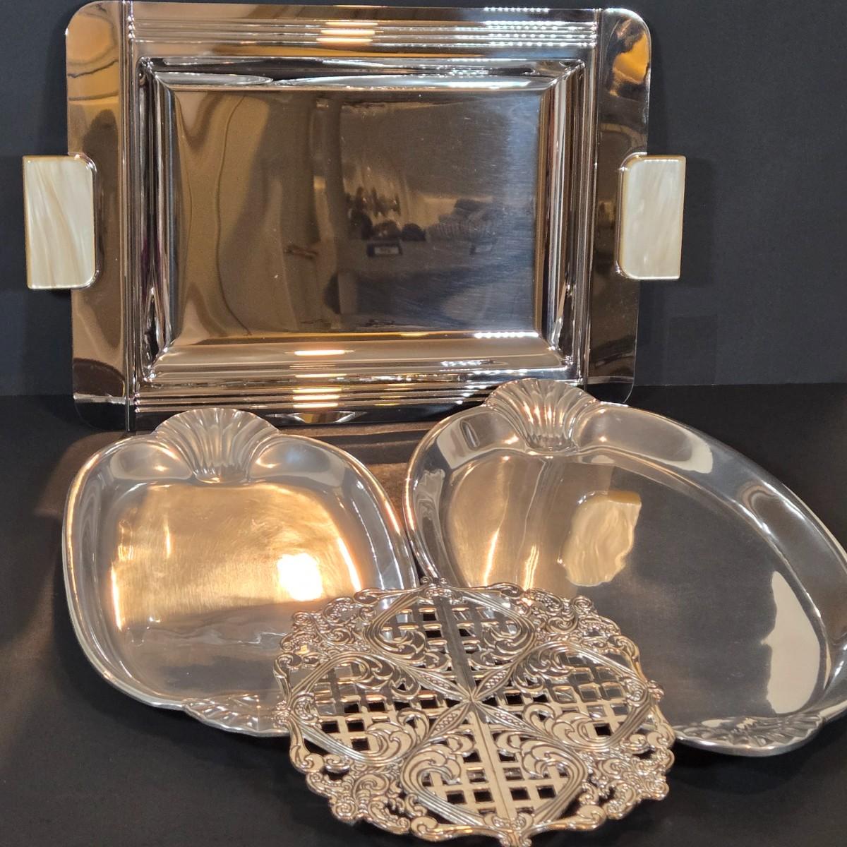 LOT 341B: Two Vintage Mariposa Brillante Silver Leaf Trays. Nick Munro & Co. Hammered Pewter Spice Shaker, Jean Couzon Orfevre Art Deco Style Serving Tray, and More